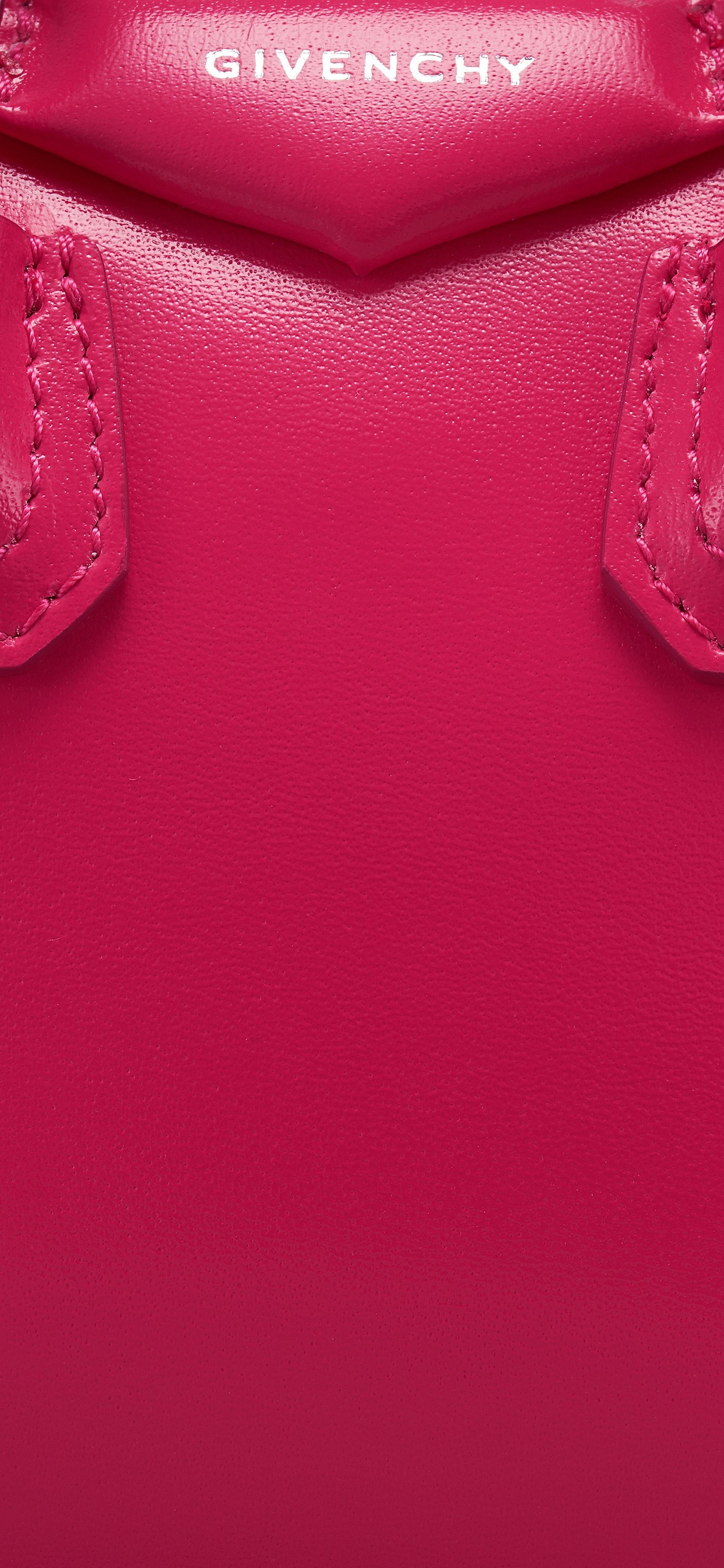 顶部设计的一个六边形徽标贴饰成为点睛,采用「填充风格」荧光粉色小牛皮制作,其上烫印银色「Givenchy」徽标,蓬软的触感更显可爱。