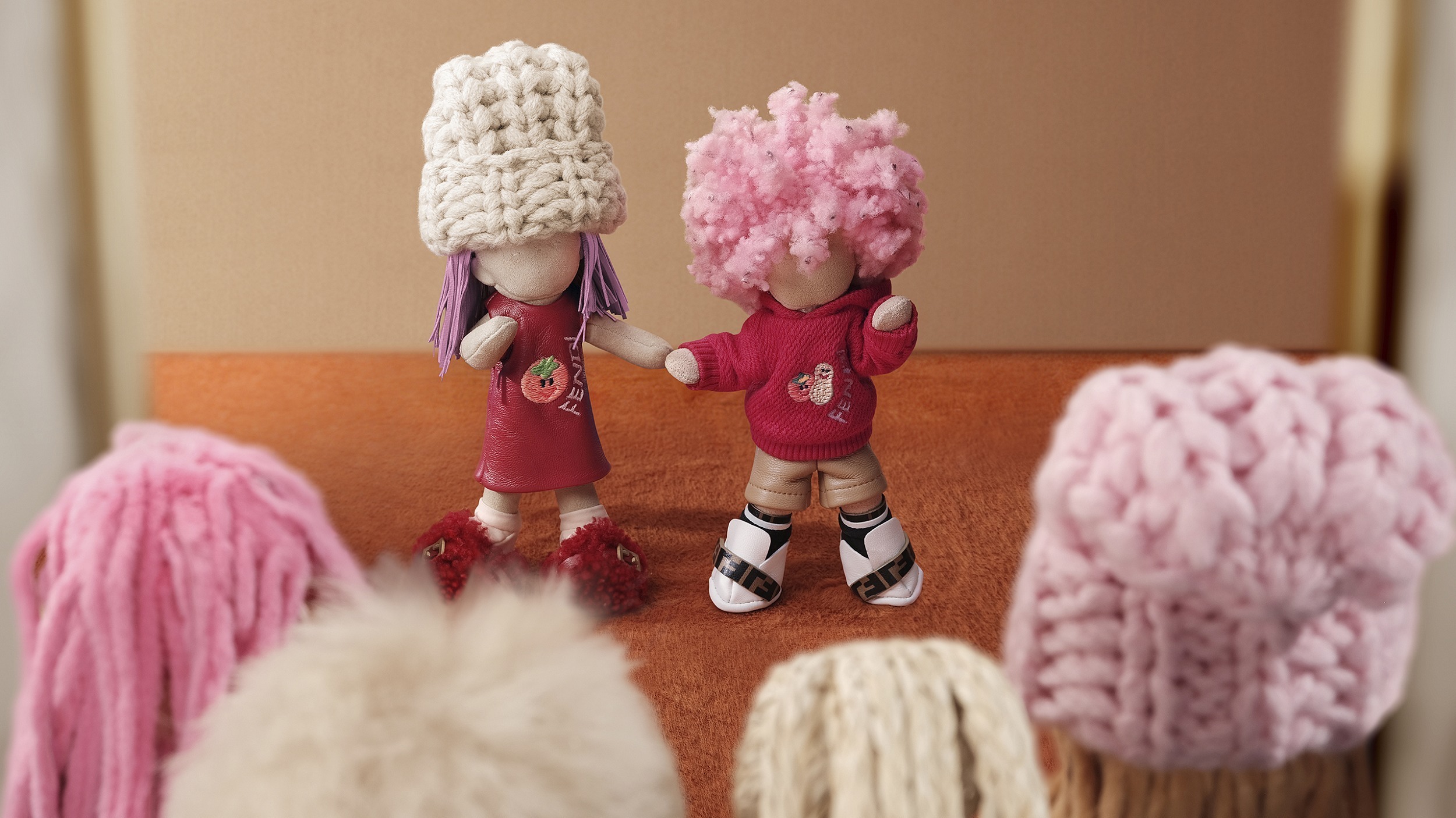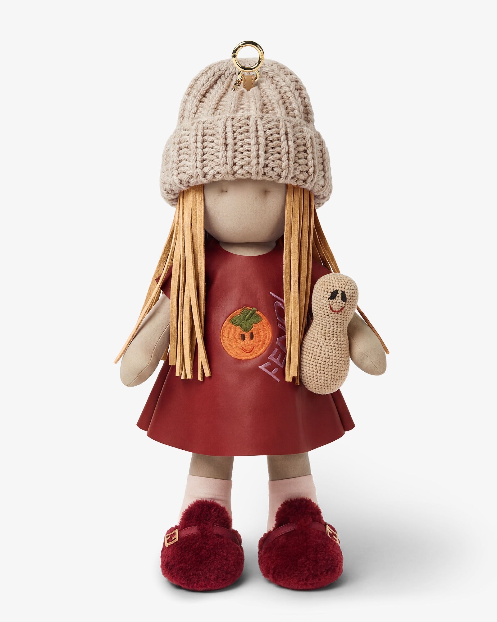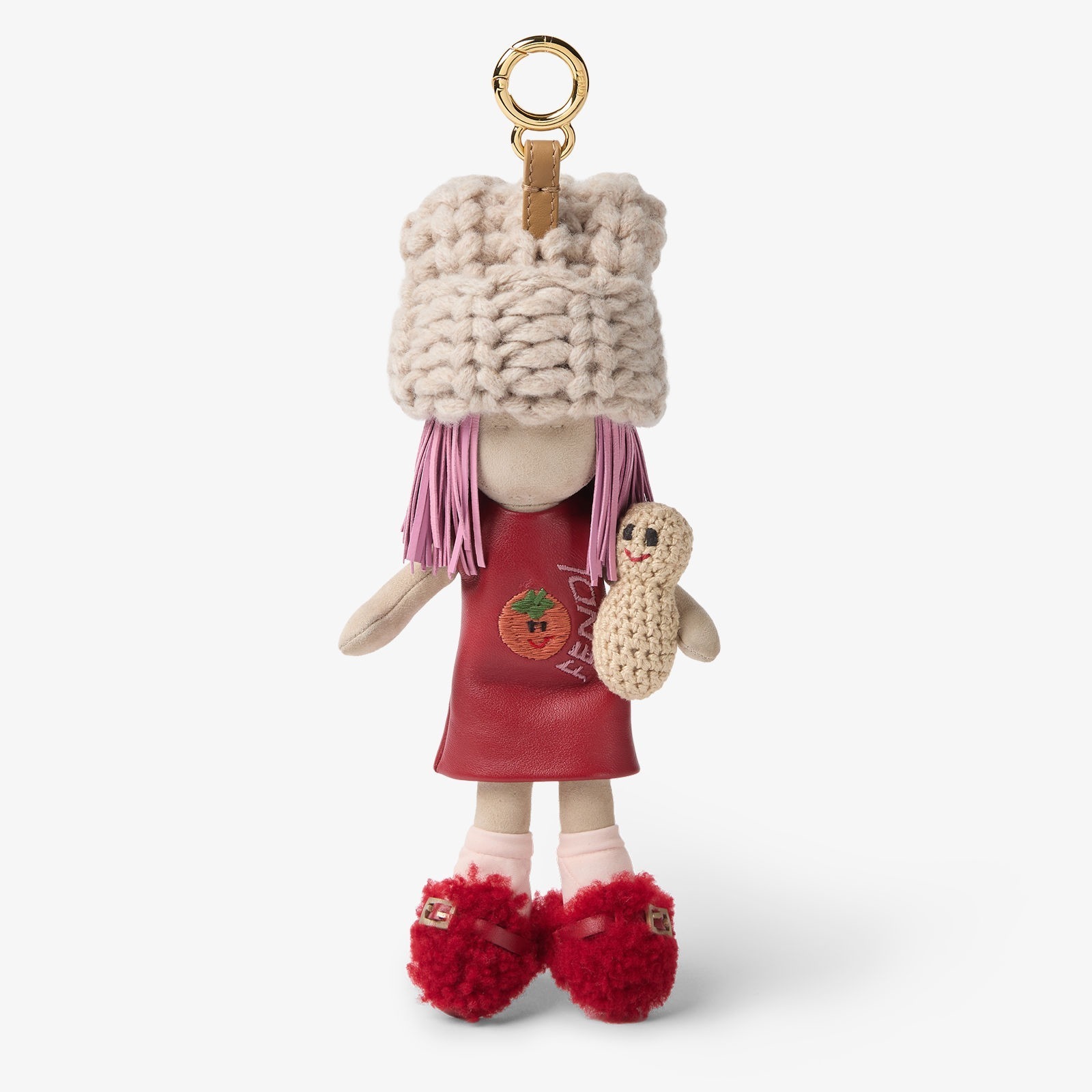 Adele 迷你挂饰和大号挂件身着饰有柿子和 FENDI 刺绣图案的红色纳帕皮革连衣裙,搭配米色针织帽和红色羊剪毛鞋子,手里还抱着一个钩针编织的花生玩偶,柿子和花生的图案寓意「好事发生」,寄托美好的新年祝福。