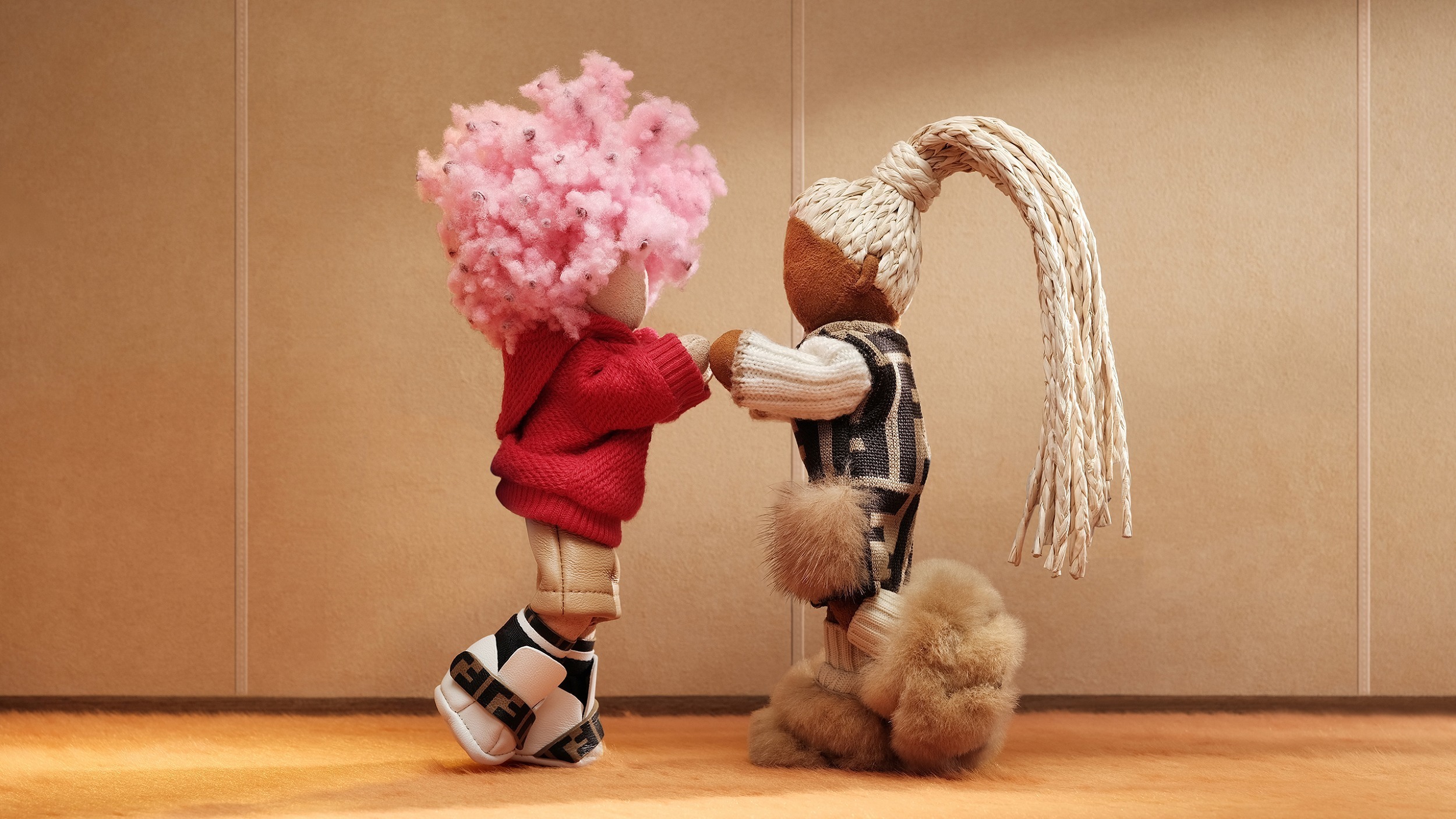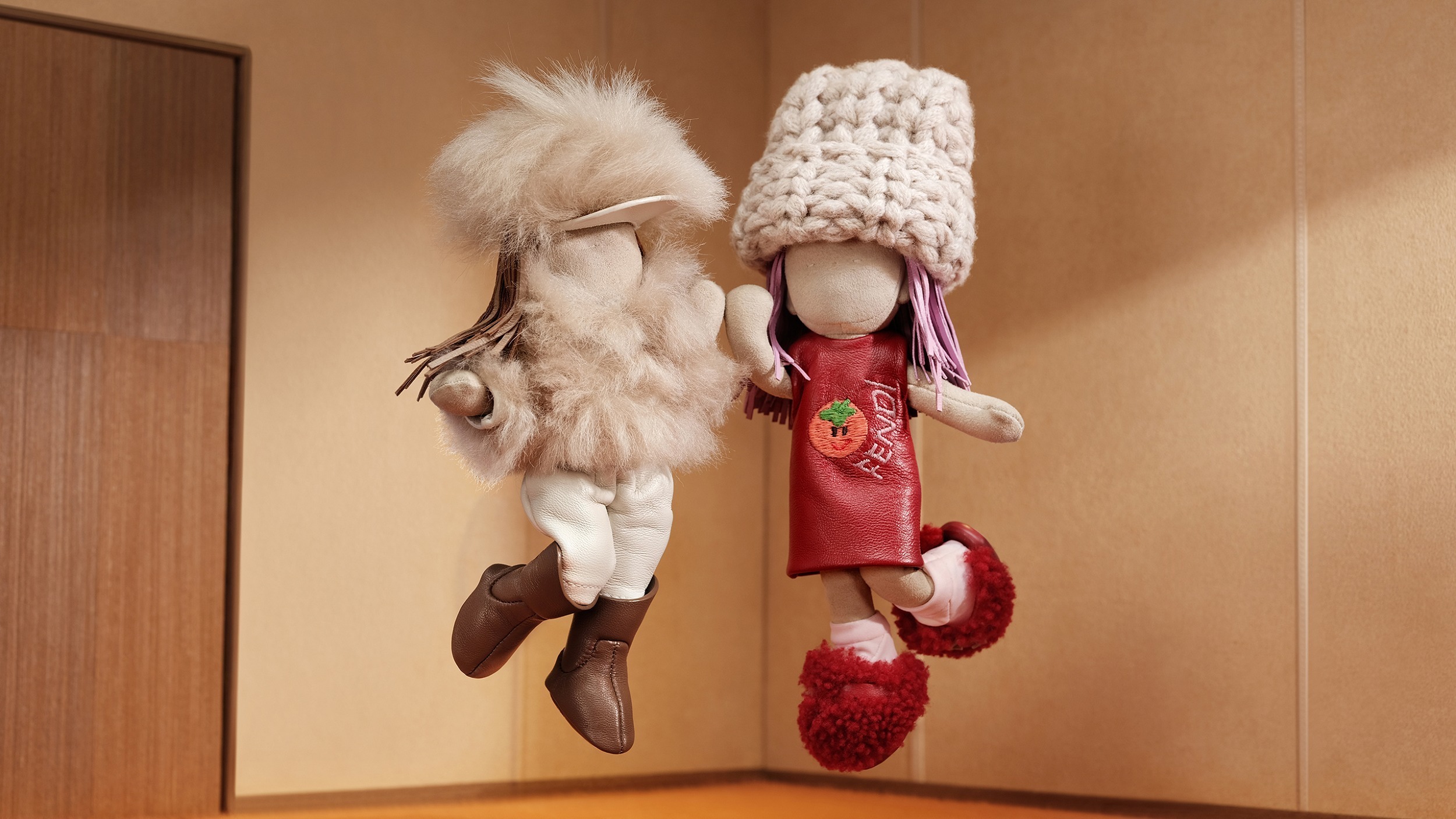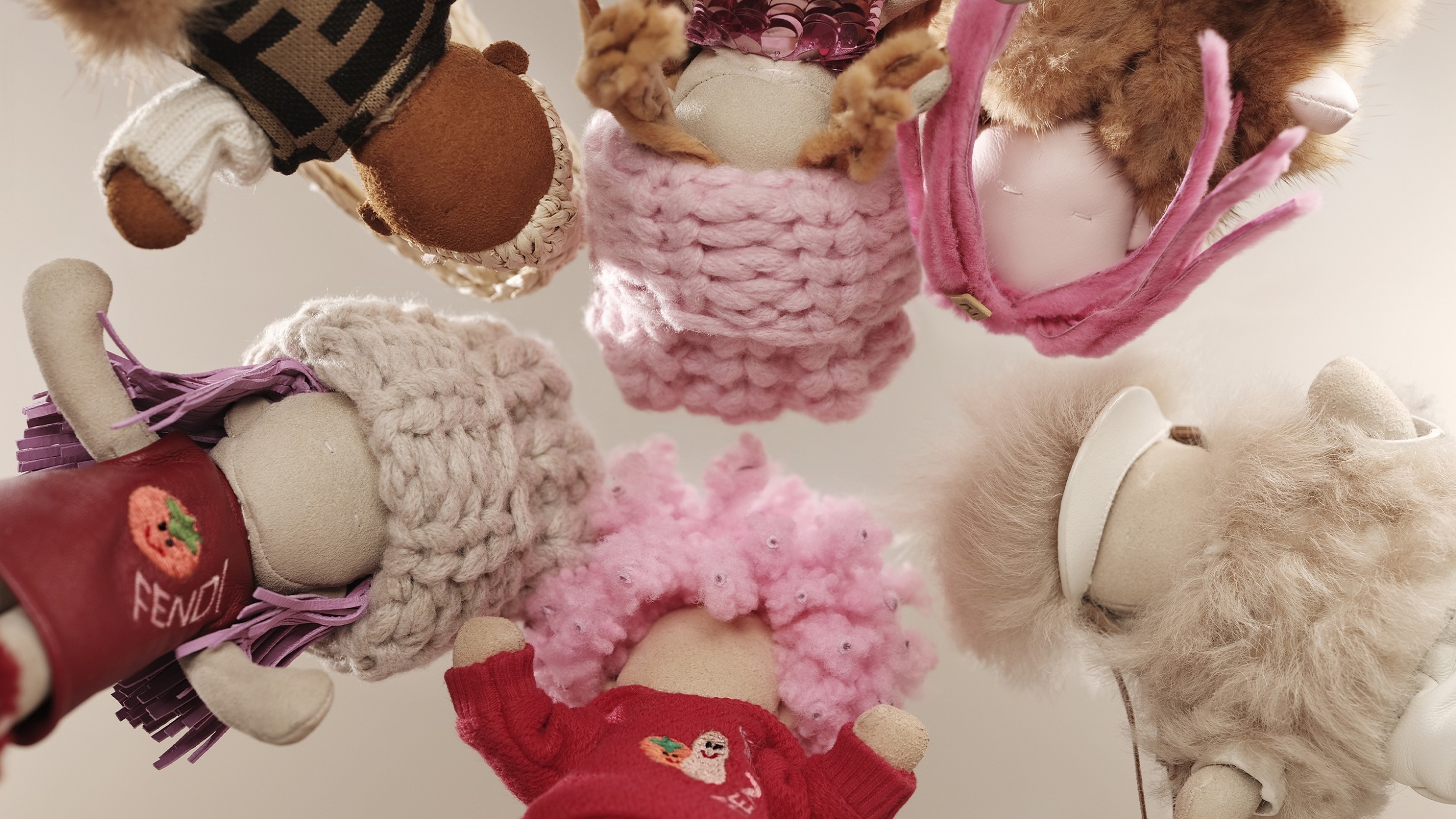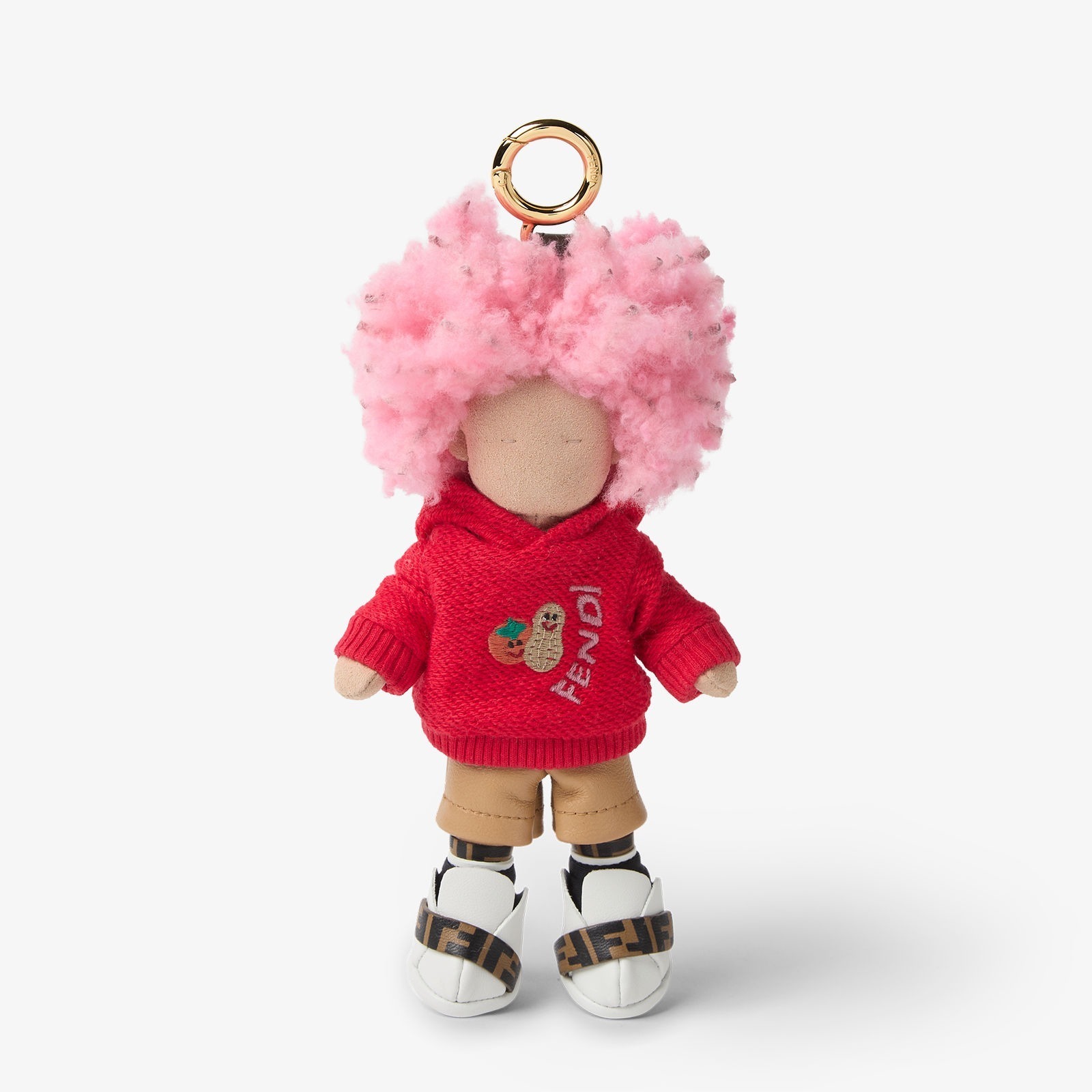 限定系列共推出2款迷你挂饰和一款限量版大号挂饰,Bread 迷你挂饰采用绒面材质搭配粉红色羊剪毛发饰,红色针织连帽卫衣上饰有柿子、花生和 FENDI 字样刺绣图案,搭配米色纳帕皮革长裤、配有FF饰带的白色纳帕皮革鞋履和黑色 Lycra 袜子。