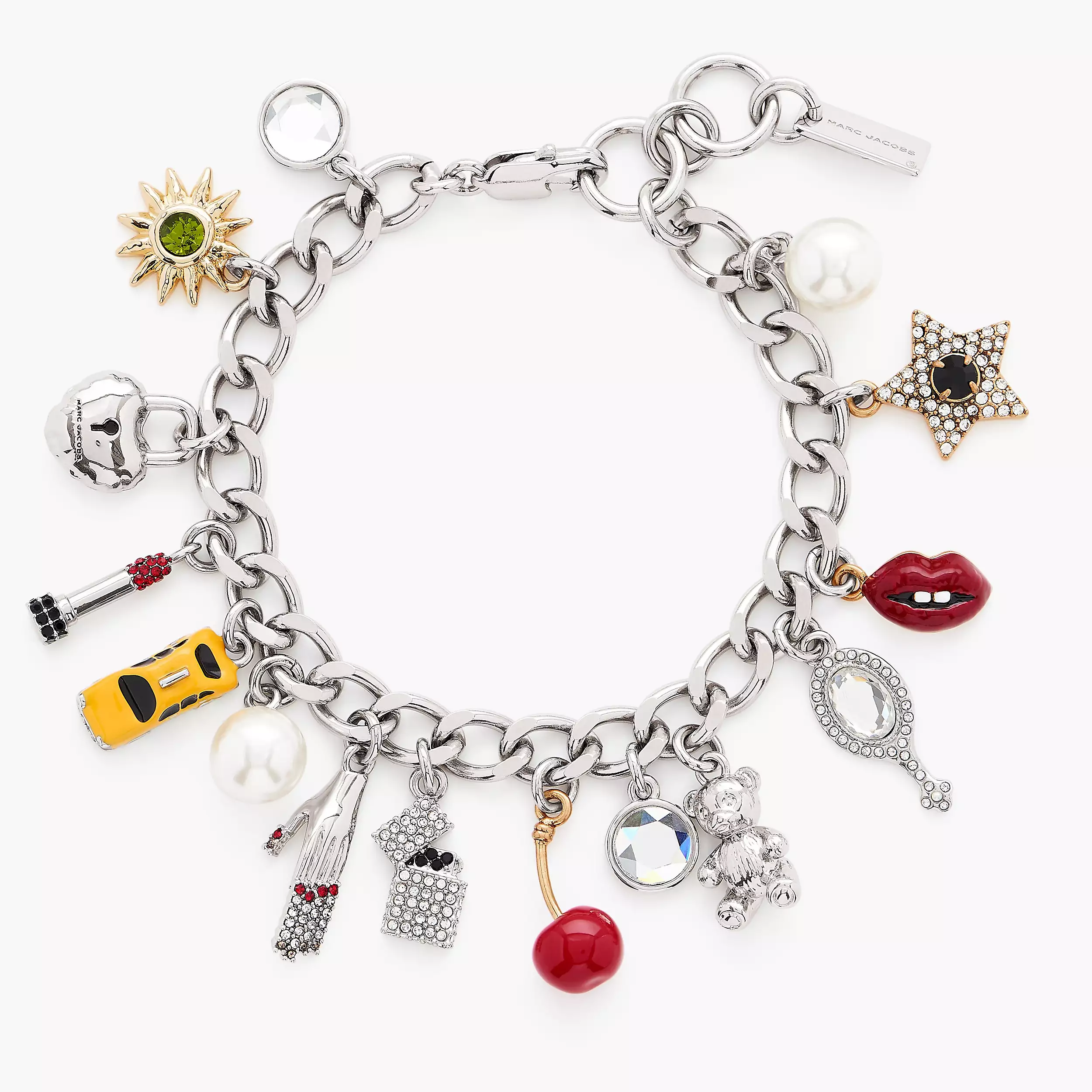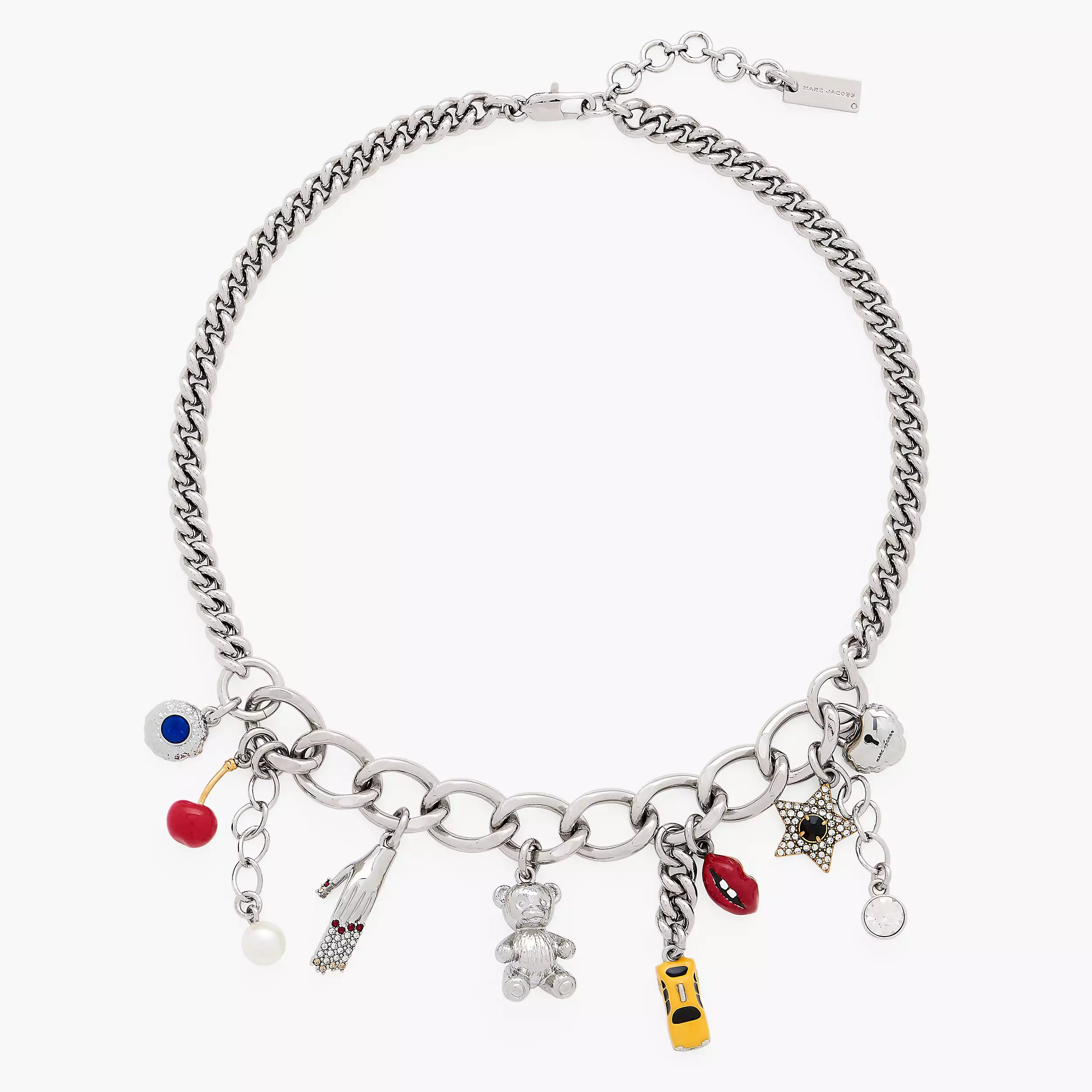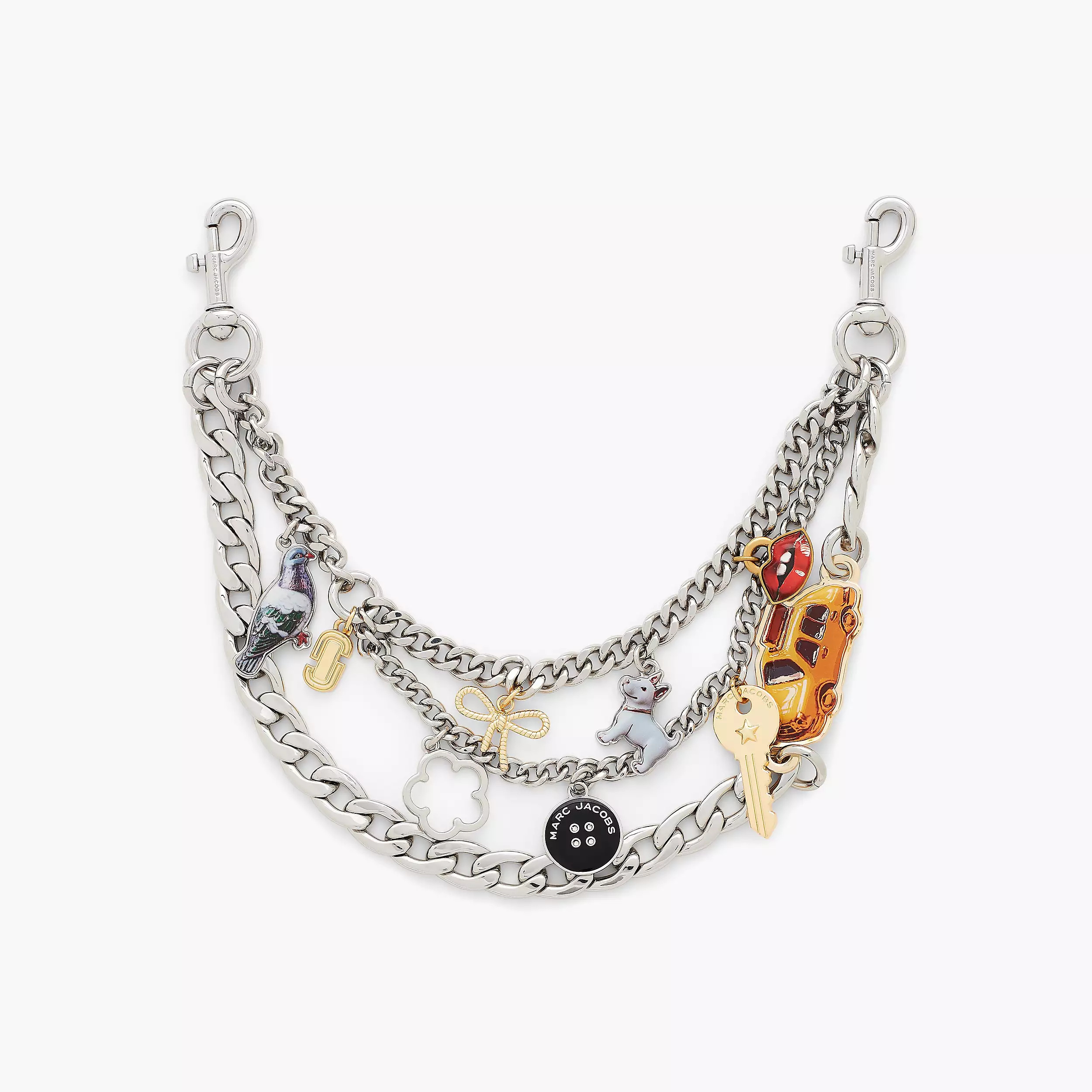 手链和项链以精心挑选的符号组合——从致敬纽约根源的出租车吊坠,到灵感源自 Marc Jacobs 本人造型的手指美甲图案……每一款吊坠都蕴含着丰富的意义,展现 Marc Jacobs 独有的品牌基因。