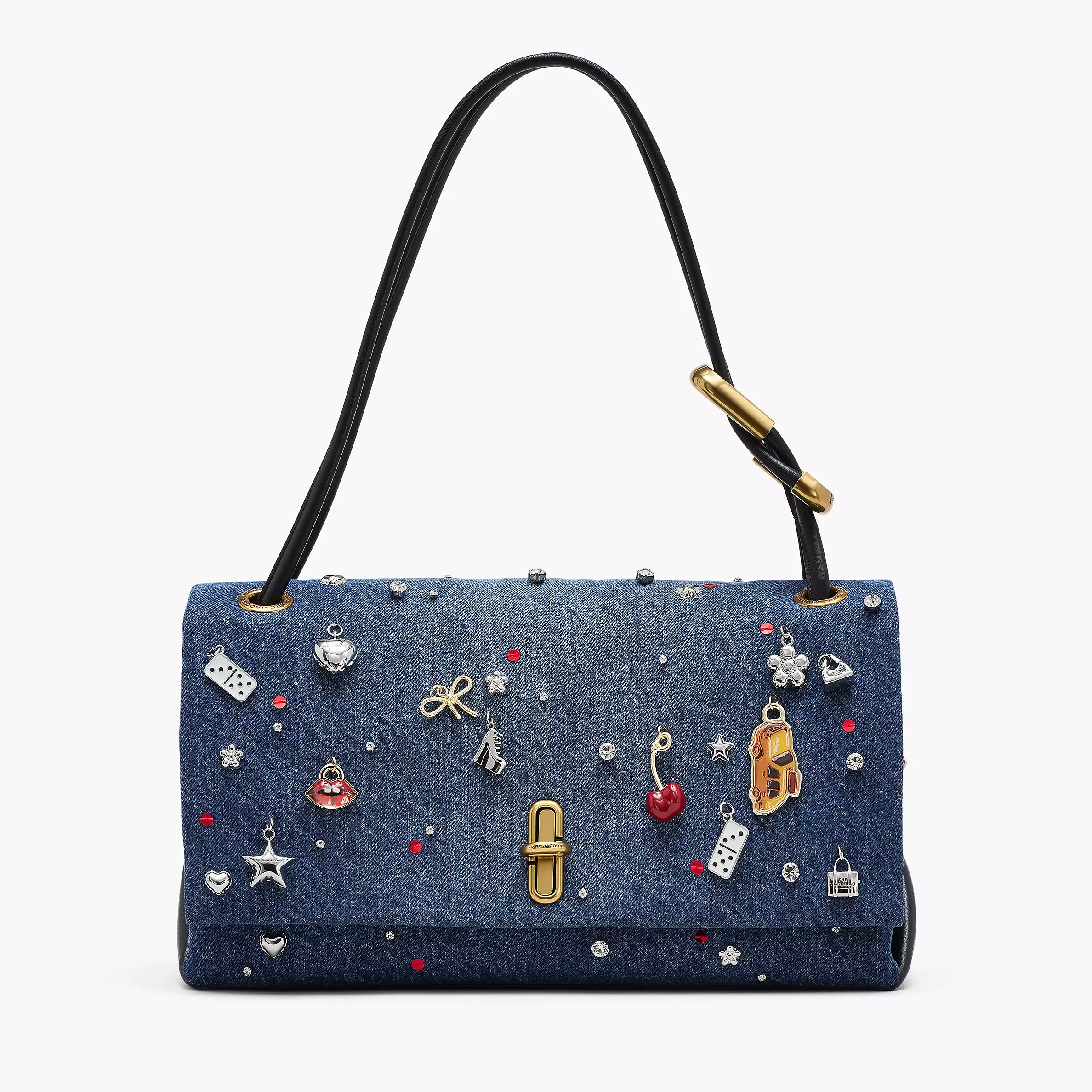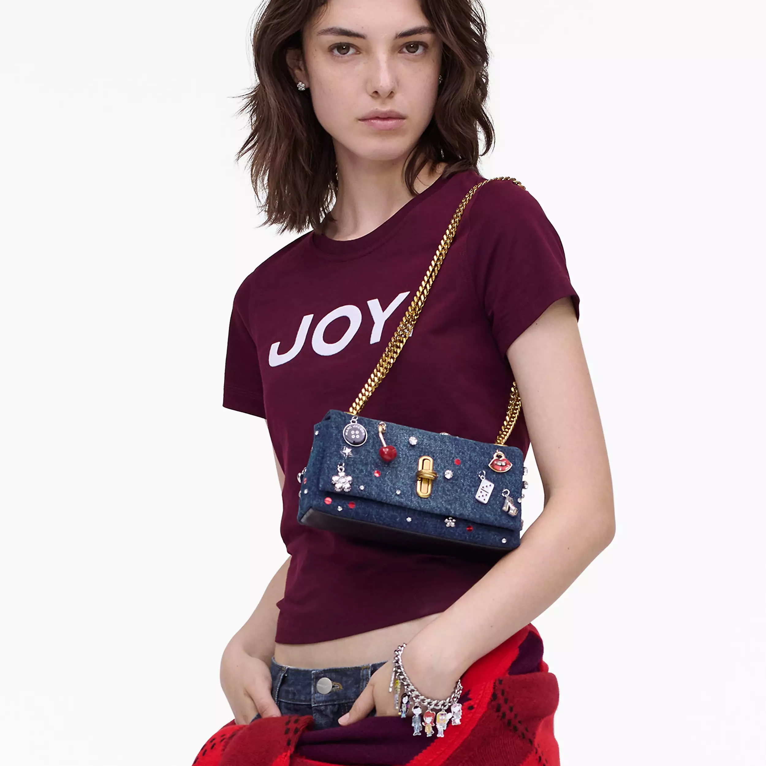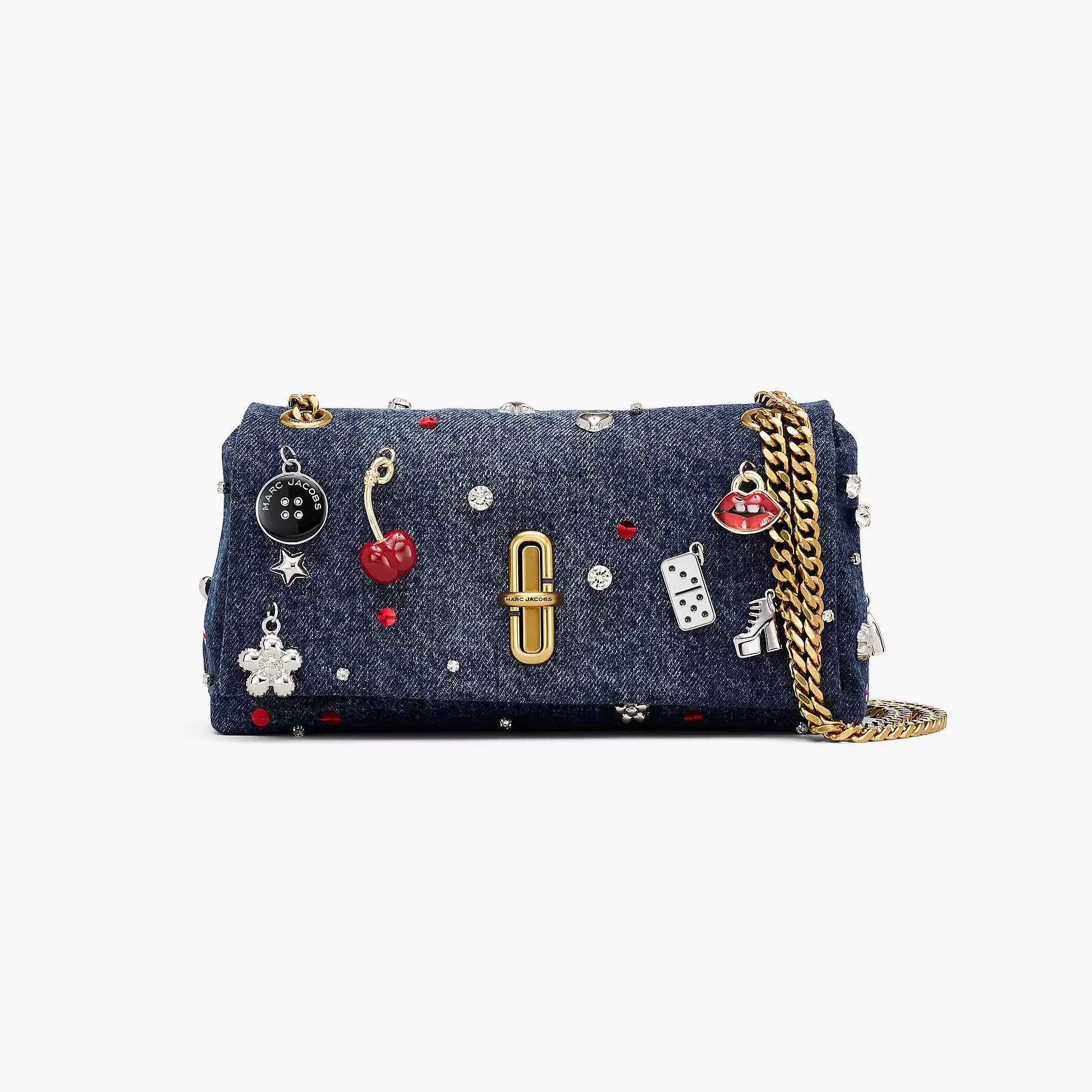 Dual 手袋以「J Marc 旋转锁扣」为主要设计元素,新作采用清新休闲的牛仔布为背景,亮点是包身垂挂精致立体的樱桃、纽约出租车、Kiki 高跟鞋、微缩托特包、骰子、花朵、五角星等琳琅满目的挂坠,营造出浮华又俏皮的街头气息。你还能看到璀璨水钻和亮丽的红色亮片妆点其间,更添灵动光芒。