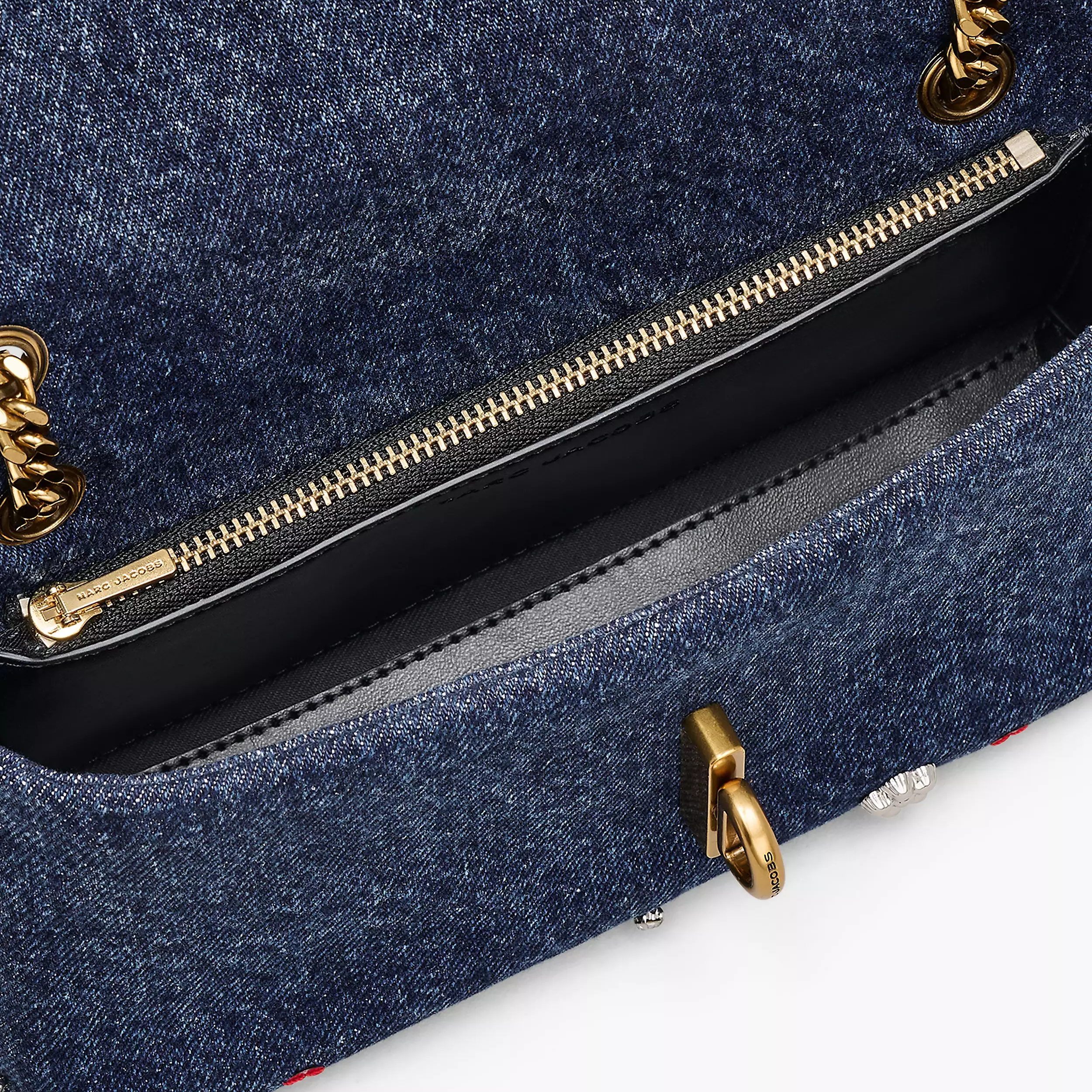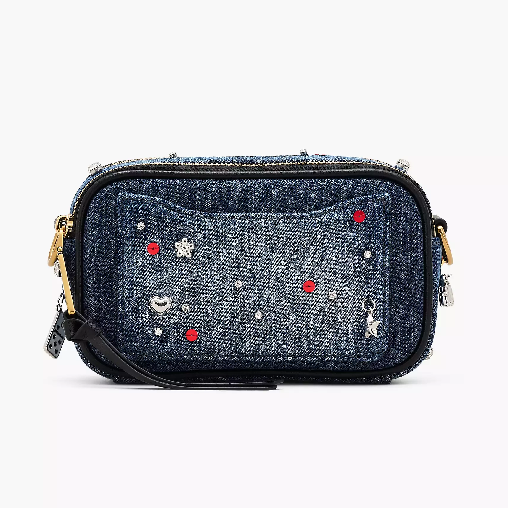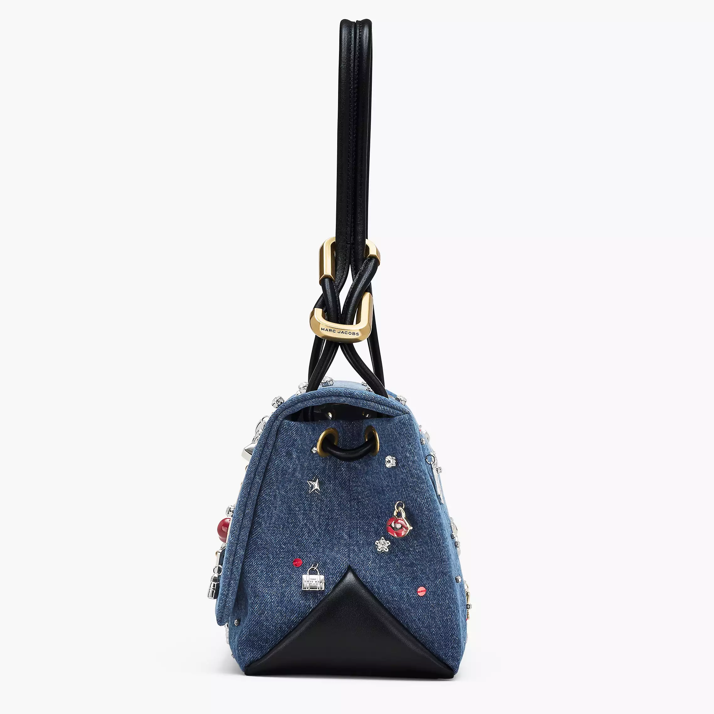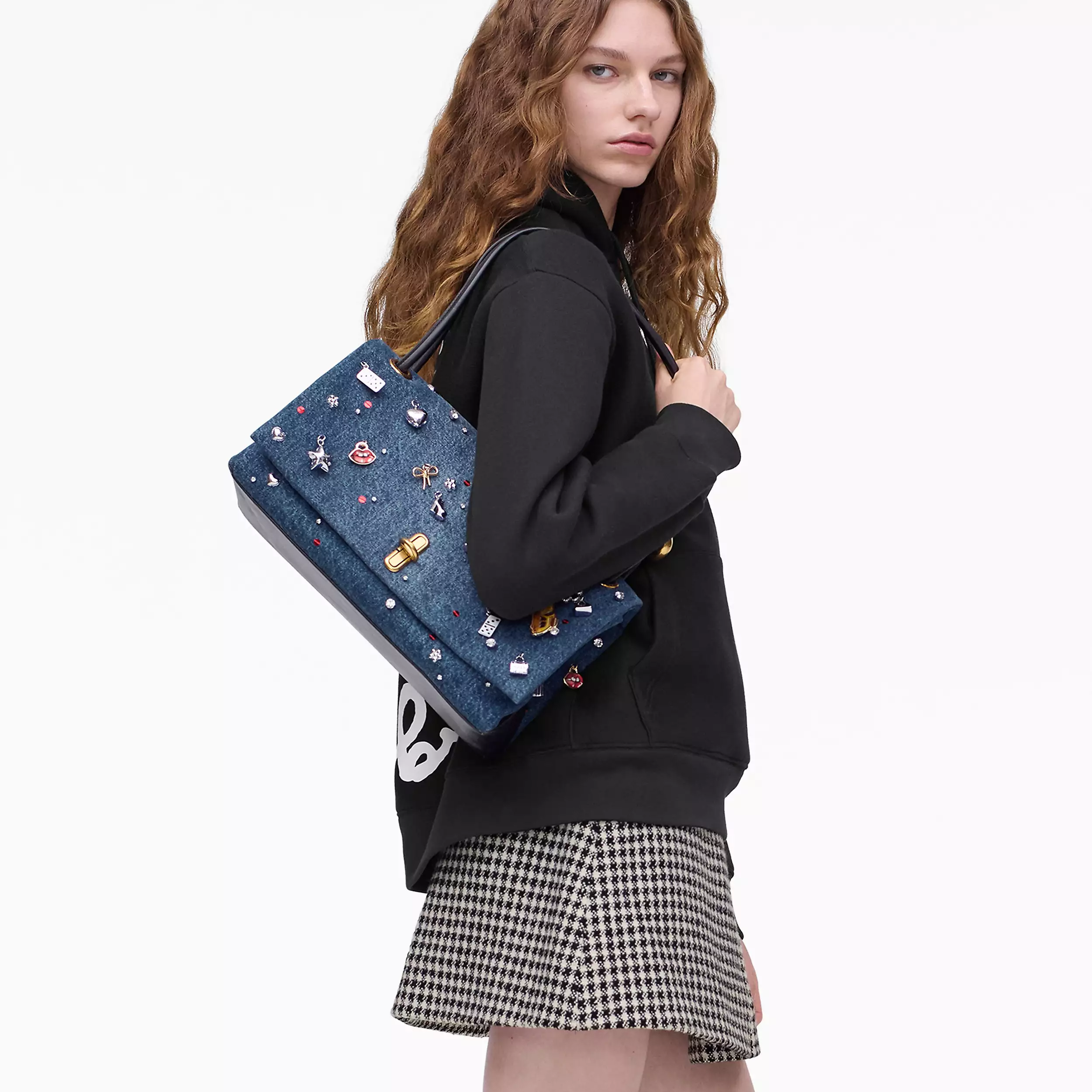 Dual 手袋以「J Marc 旋转锁扣」为主要设计元素,新作采用清新休闲的牛仔布为背景,亮点是包身垂挂精致立体的樱桃、纽约出租车、Kiki 高跟鞋、微缩托特包、骰子、花朵、五角星等琳琅满目的挂坠,营造出浮华又俏皮的街头气息。你还能看到璀璨水钻和亮丽的红色亮片妆点其间,更添灵动光芒。