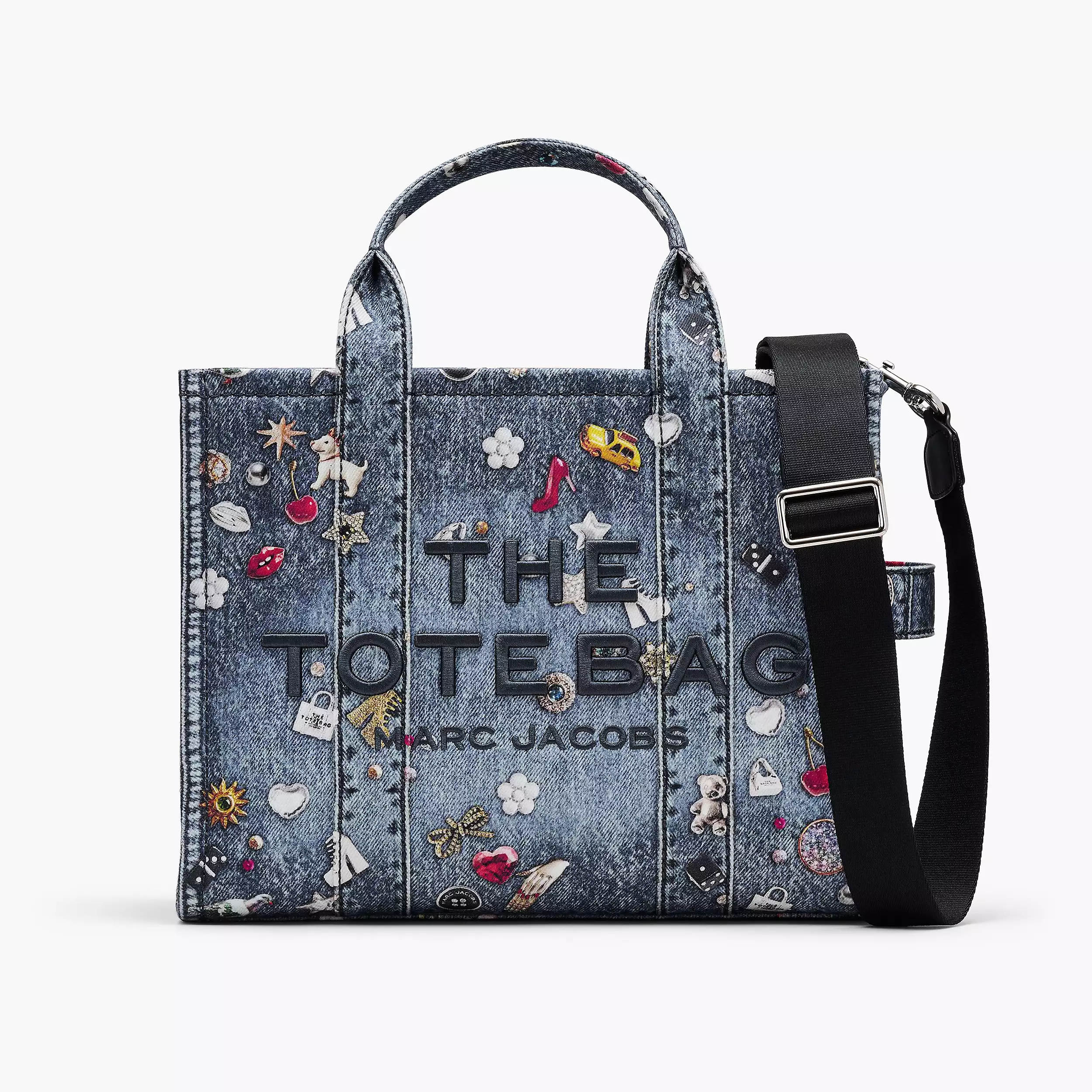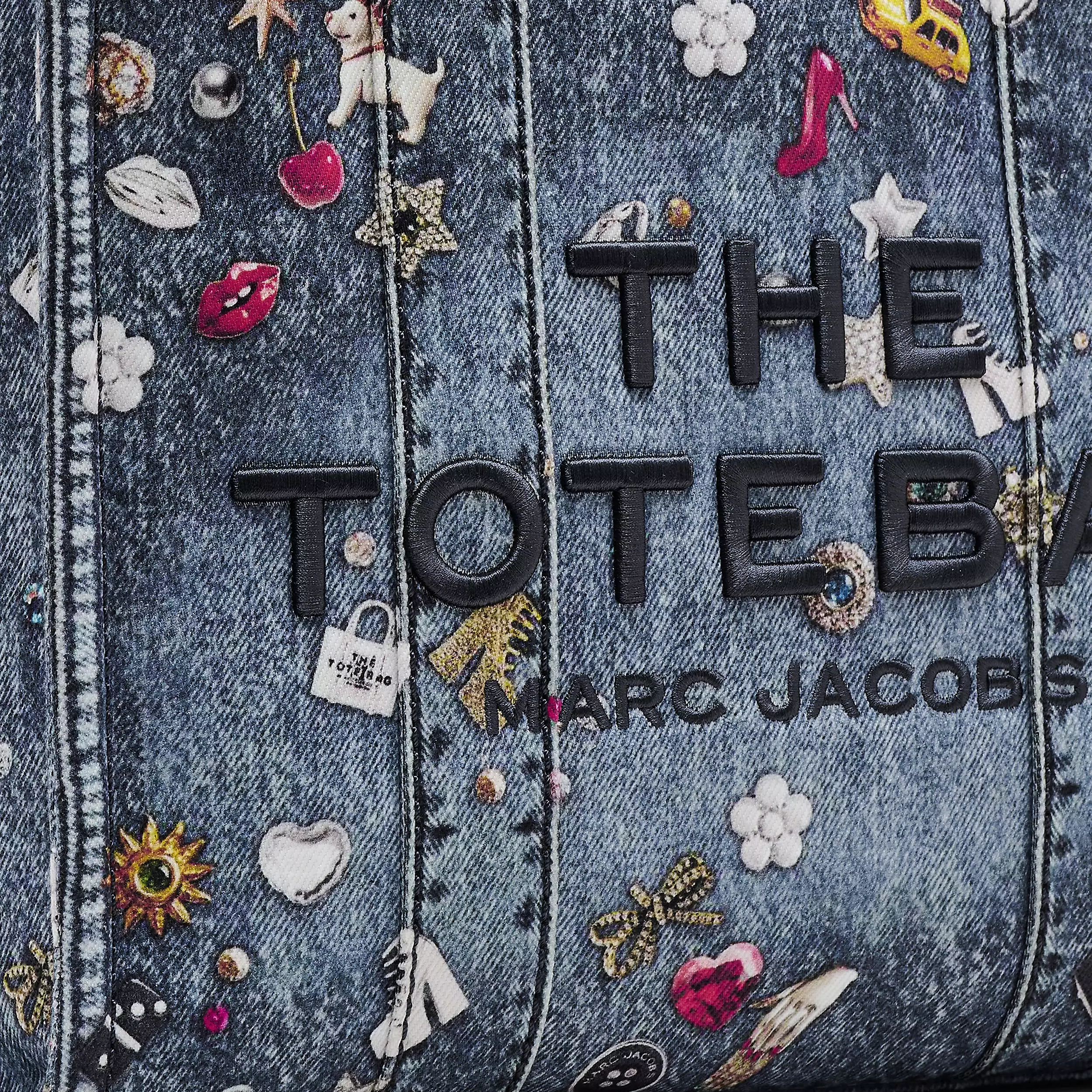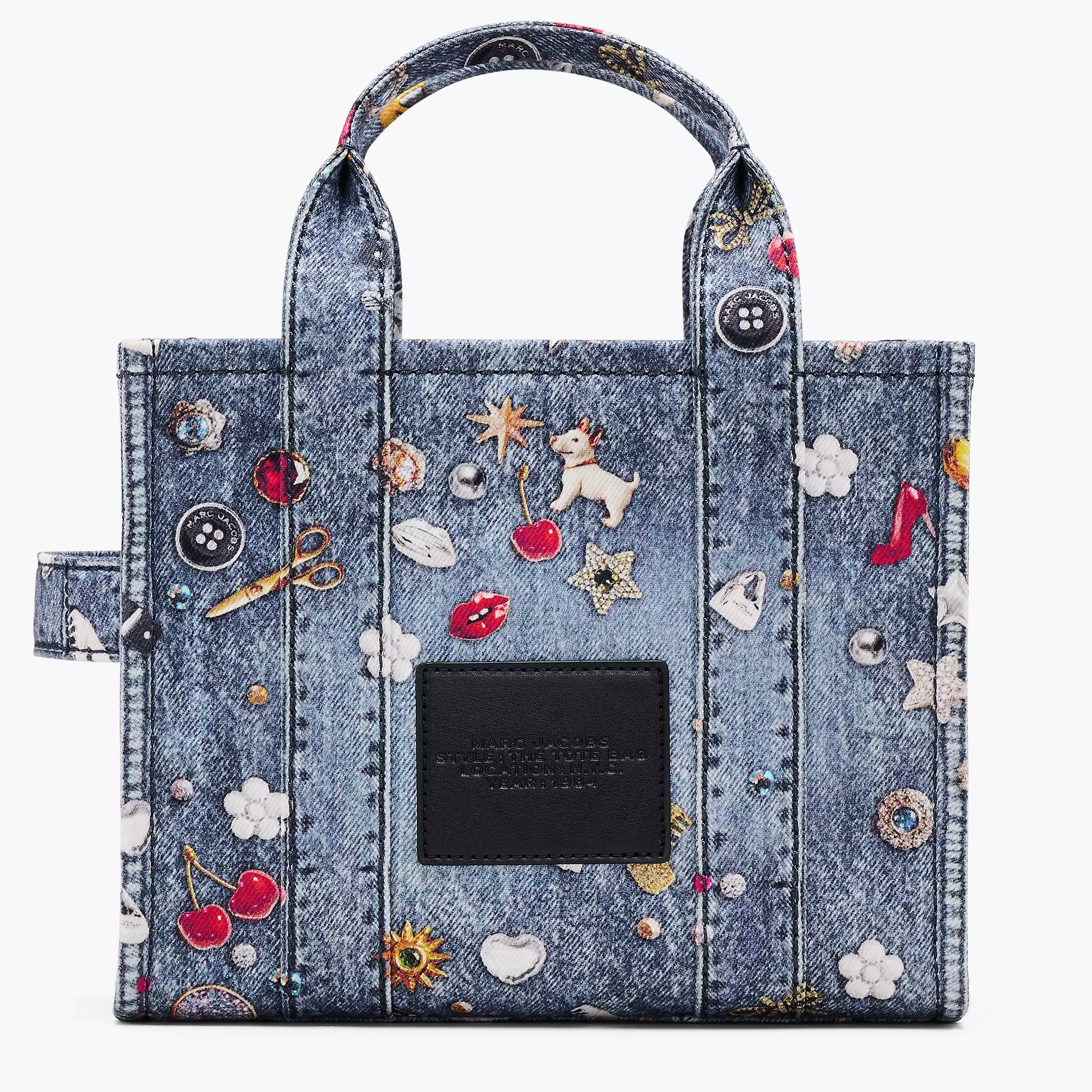 Tote 托特包以水洗丹宁面料制作而成,高跟鞋、蝴蝶结、爱心、小狗、纽扣、小熊……包罗万象的图案以错视风格图案印花跃然于包身,仿佛是设计师的灵感剪贴簿。