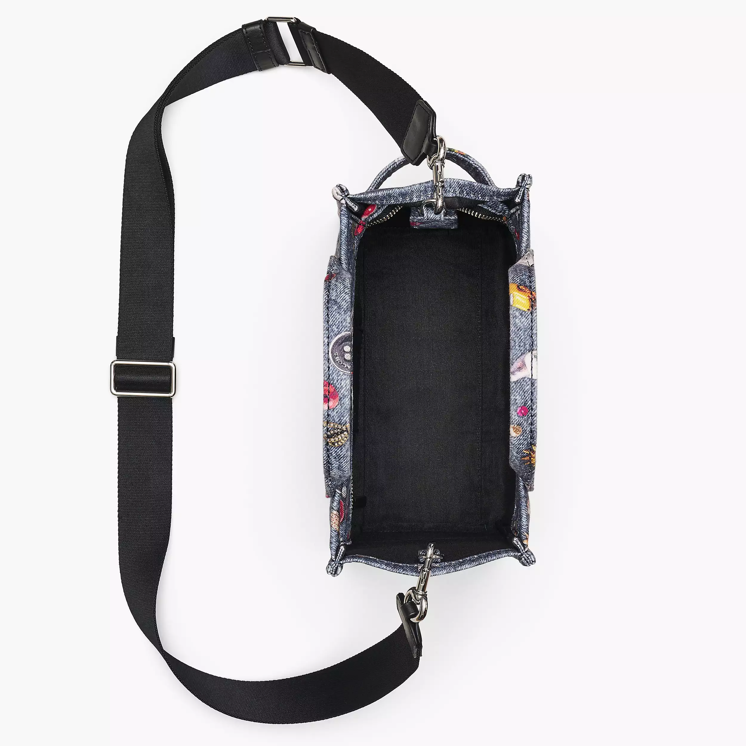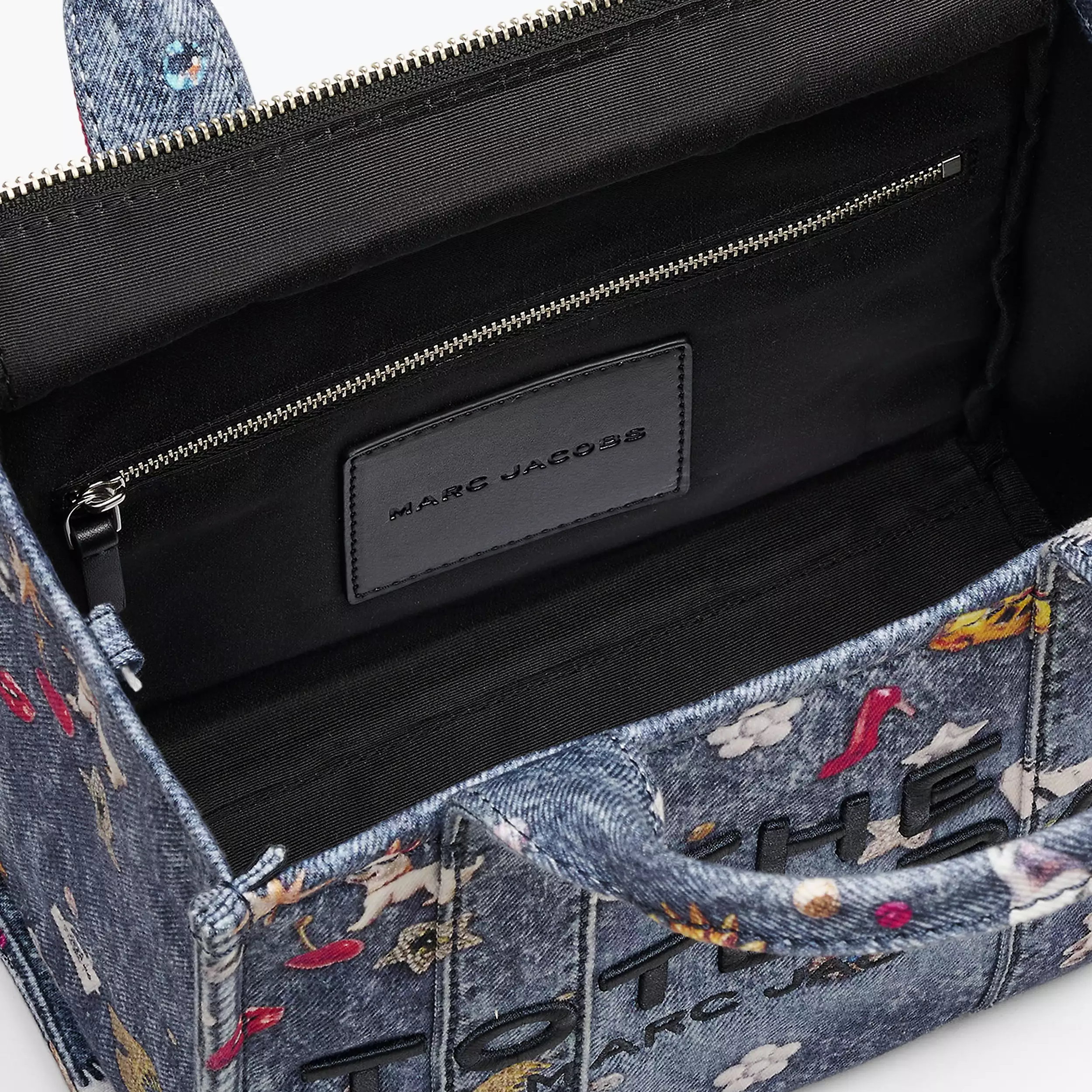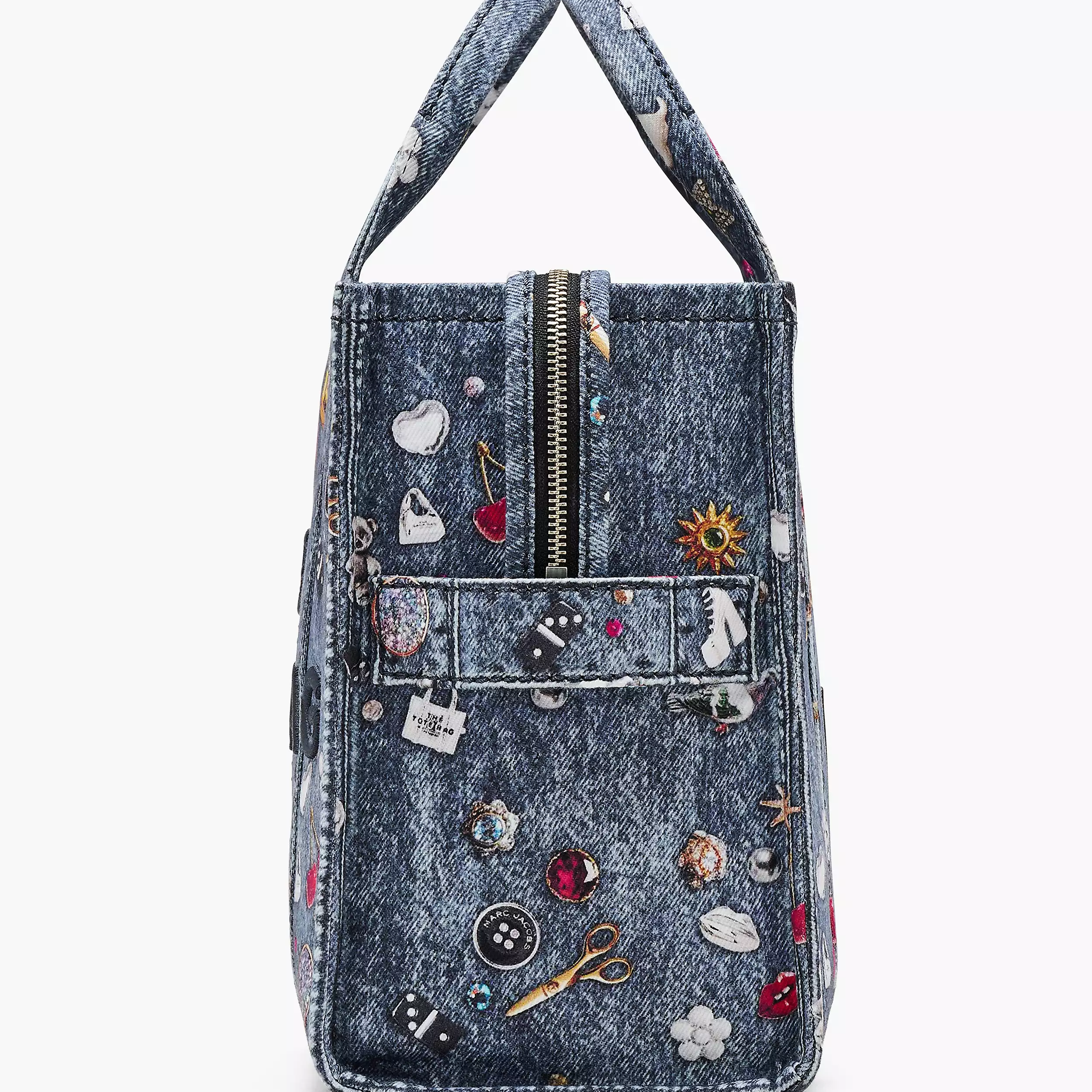 Tote 托特包以水洗丹宁面料制作而成,高跟鞋、蝴蝶结、爱心、小狗、纽扣、小熊……包罗万象的图案以错视风格图案印花跃然于包身,仿佛是设计师的灵感剪贴簿。