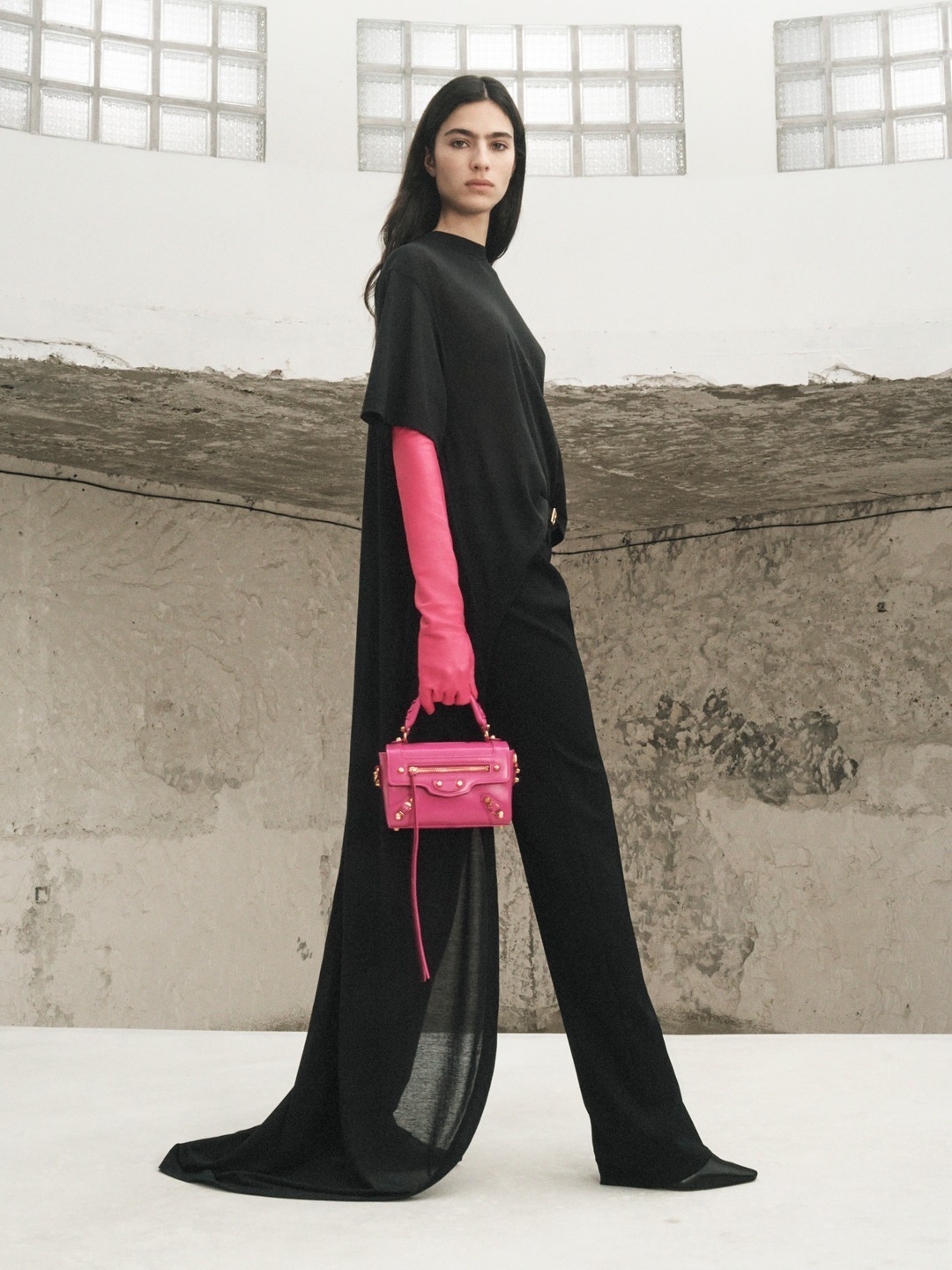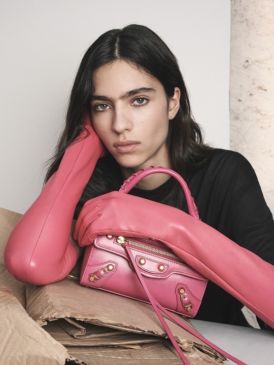 Balenciaga 本周释出夏季26系列广告片,这款新登场的 Le City 手袋采用小巧化妆盒构型搭配顶部单手柄。包包延续经典机车包的顶针状饰钉、小型金属搭扣加固的包角、拉链外袋、皮绳拉链头、编织手柄等标志性设计元素,顶部化妆镜便于随时整理妆容,精致小方盒构型为机车包增添优雅和俏皮格调。