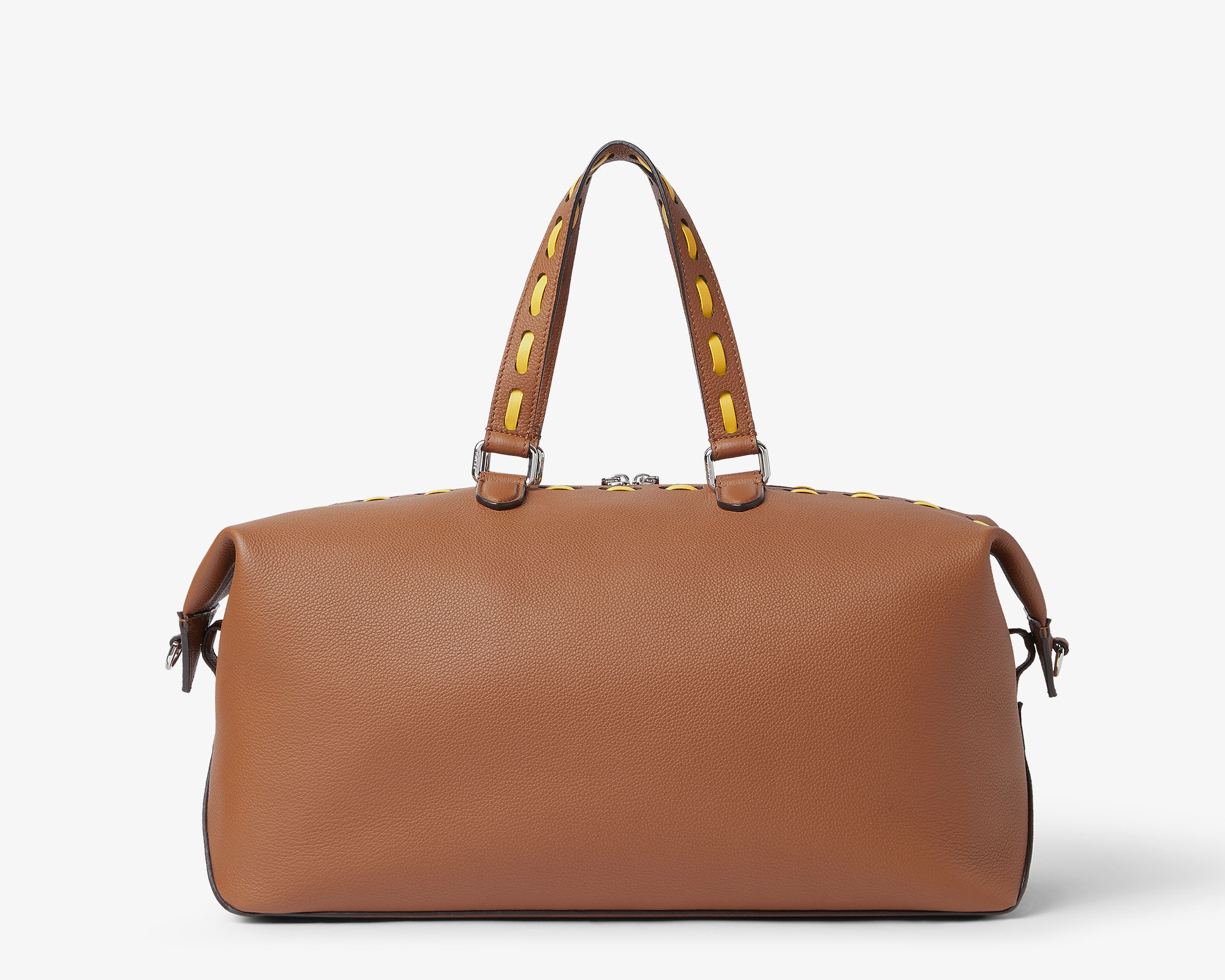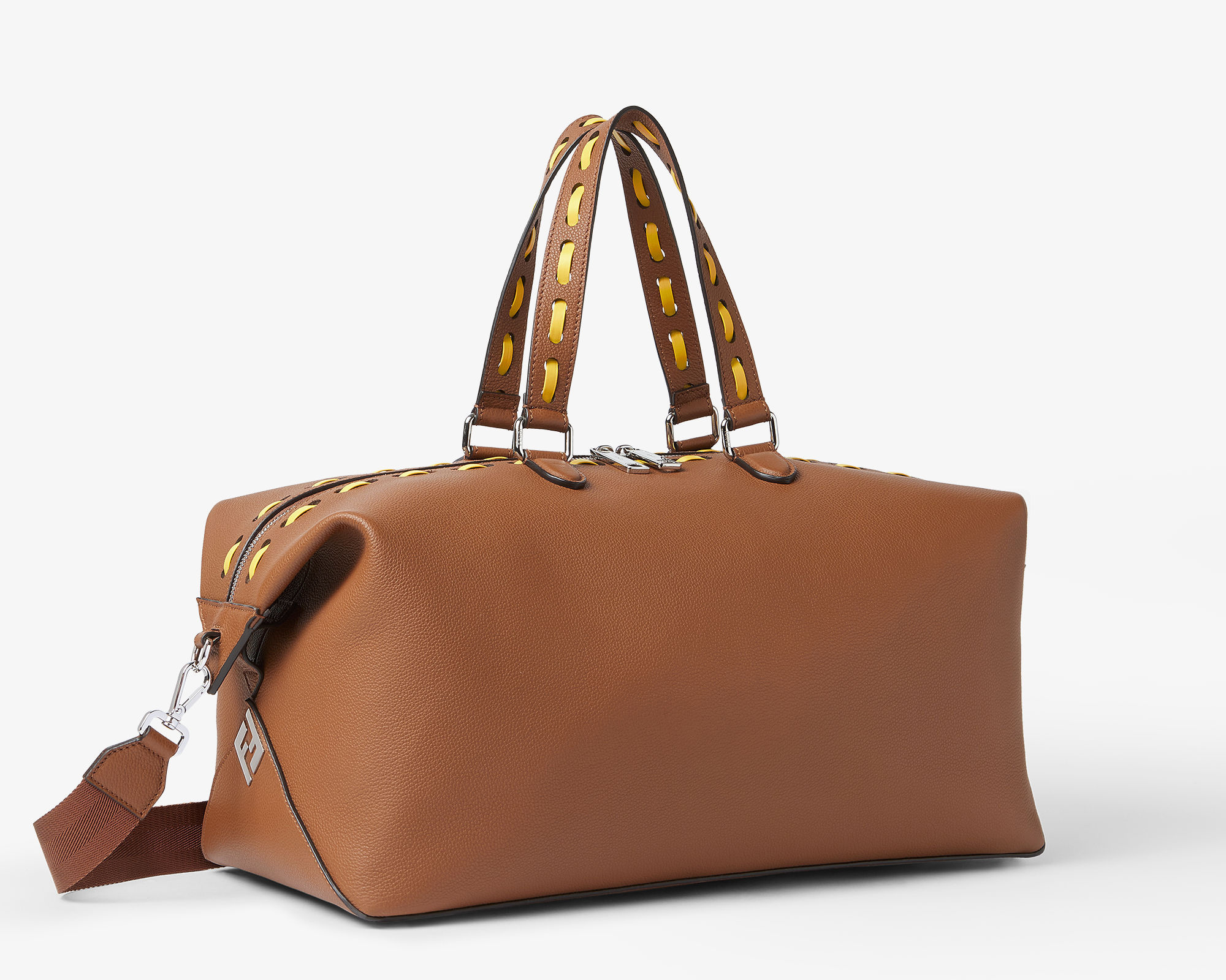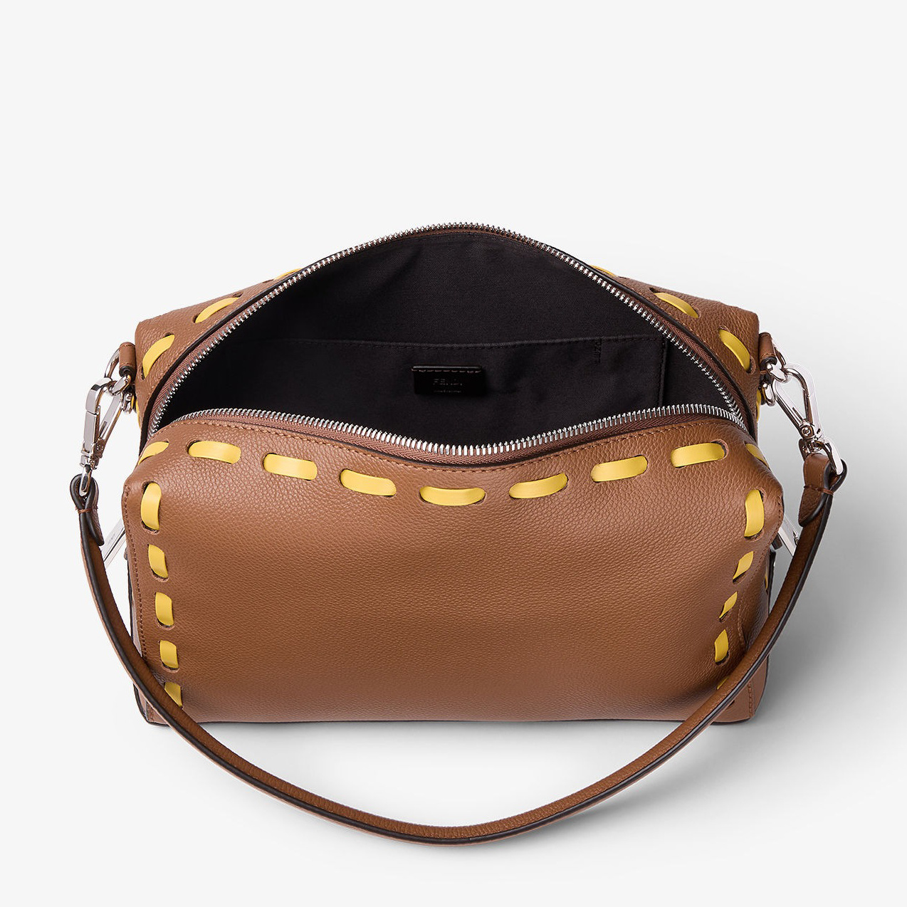 除了经典黑银配色之外本季还推出两只 Selleria 缝线装饰款,采用棕色全粒面小牛皮制作包身,45号尺寸点缀向日葵黄色手工皮革缝线,55尺寸饰有巧克力棕色皮革缝线,明线设计勾勒利落廓形,为包包增添灵动细节。