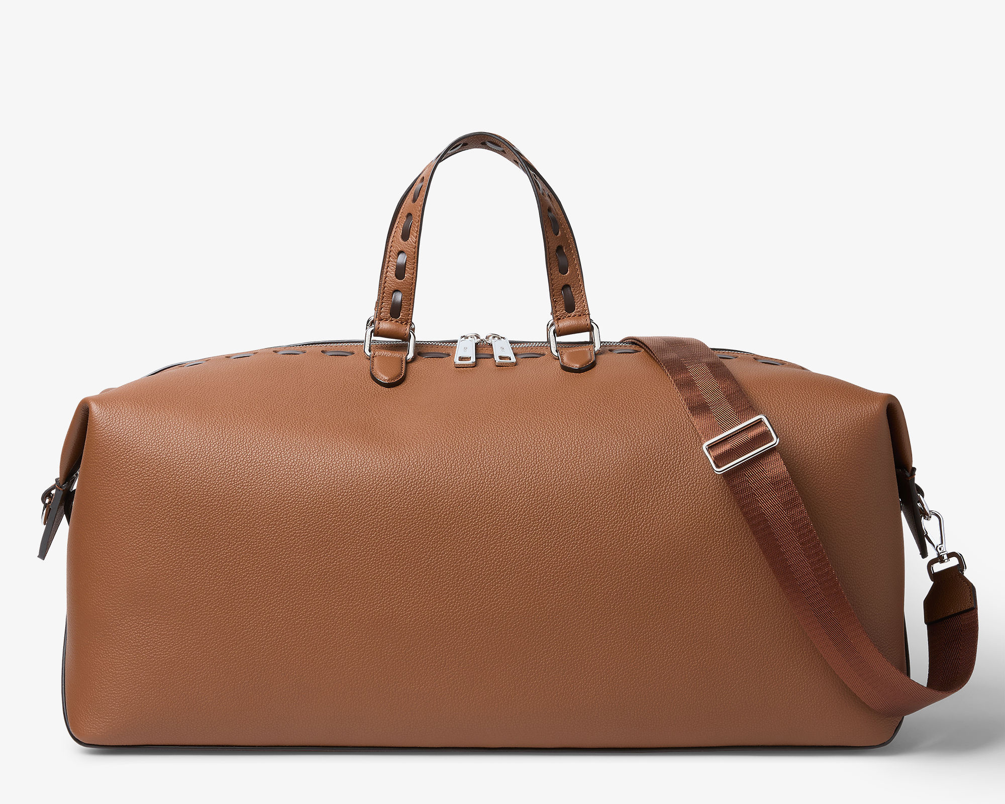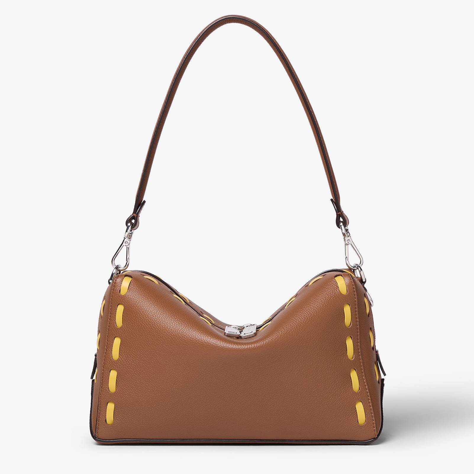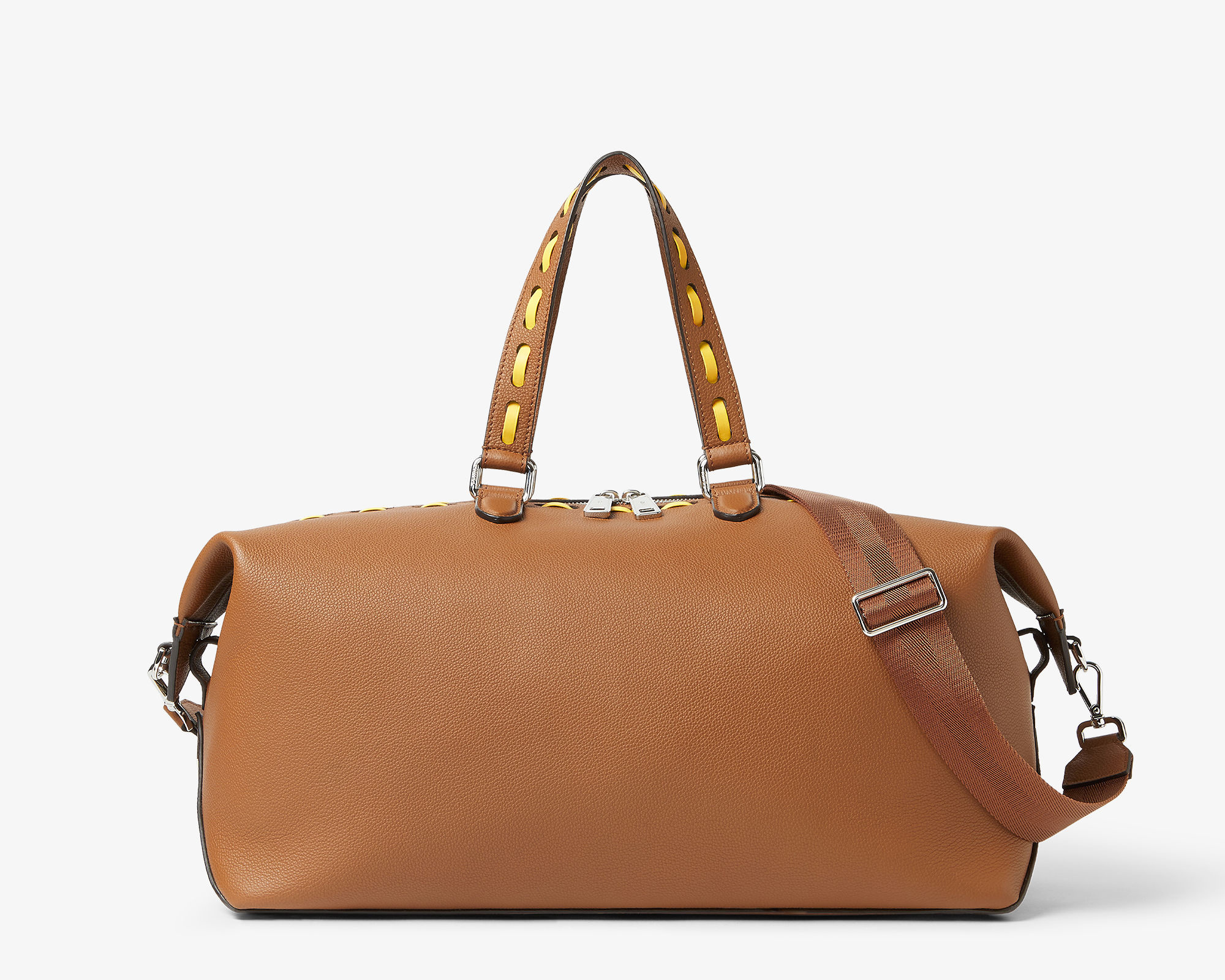 除了经典黑银配色之外本季还推出两只 Selleria 缝线装饰款,采用棕色全粒面小牛皮制作包身,45号尺寸点缀向日葵黄色手工皮革缝线,55尺寸饰有巧克力棕色皮革缝线,明线设计勾勒利落廓形,为包包增添灵动细节。