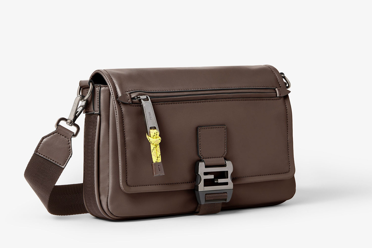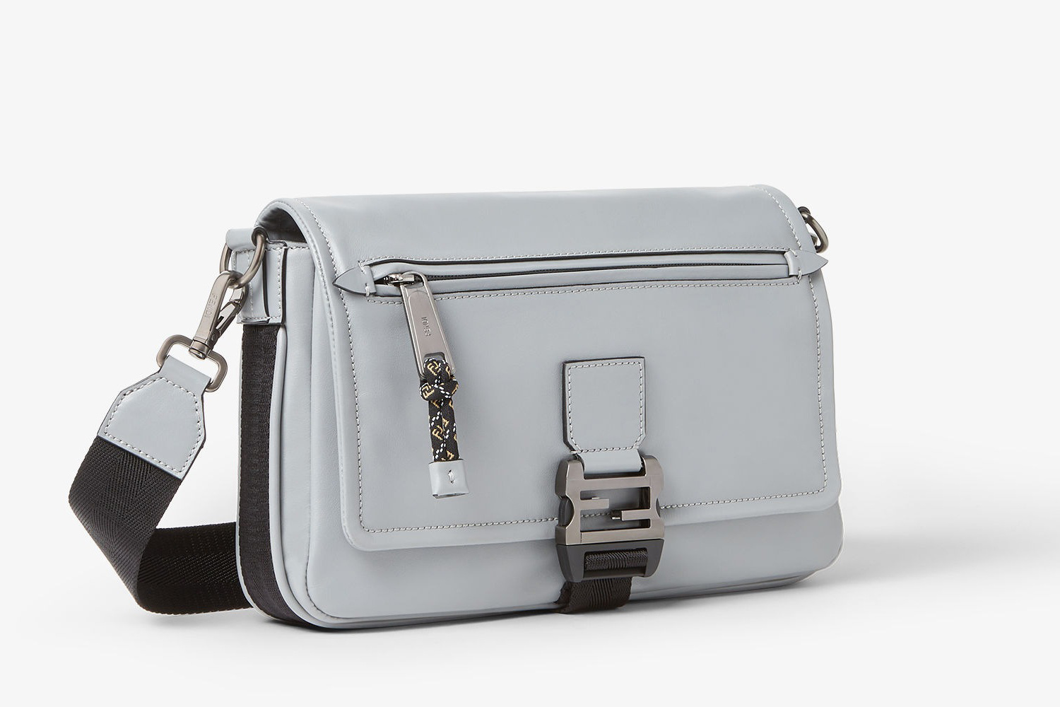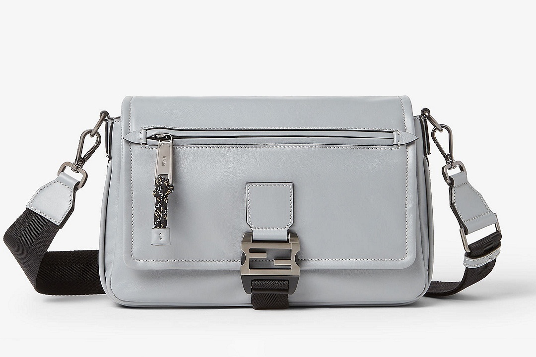 新款 FENDI Flux 邮差包采用光滑牛皮革塑造洗练翻盖包廓形,拉丝银灰色 FF 金属搭扣和绳索拉链头为包包注入户外机能风格,科技布料肩带可拆卸和可调节,前置拉链口袋便于随手取放物品,内部可收纳11英寸平板电脑、智能手机和日常必需品,推出浅灰色、棕色黑色3种配色,低饱和单色展露内敛智感。