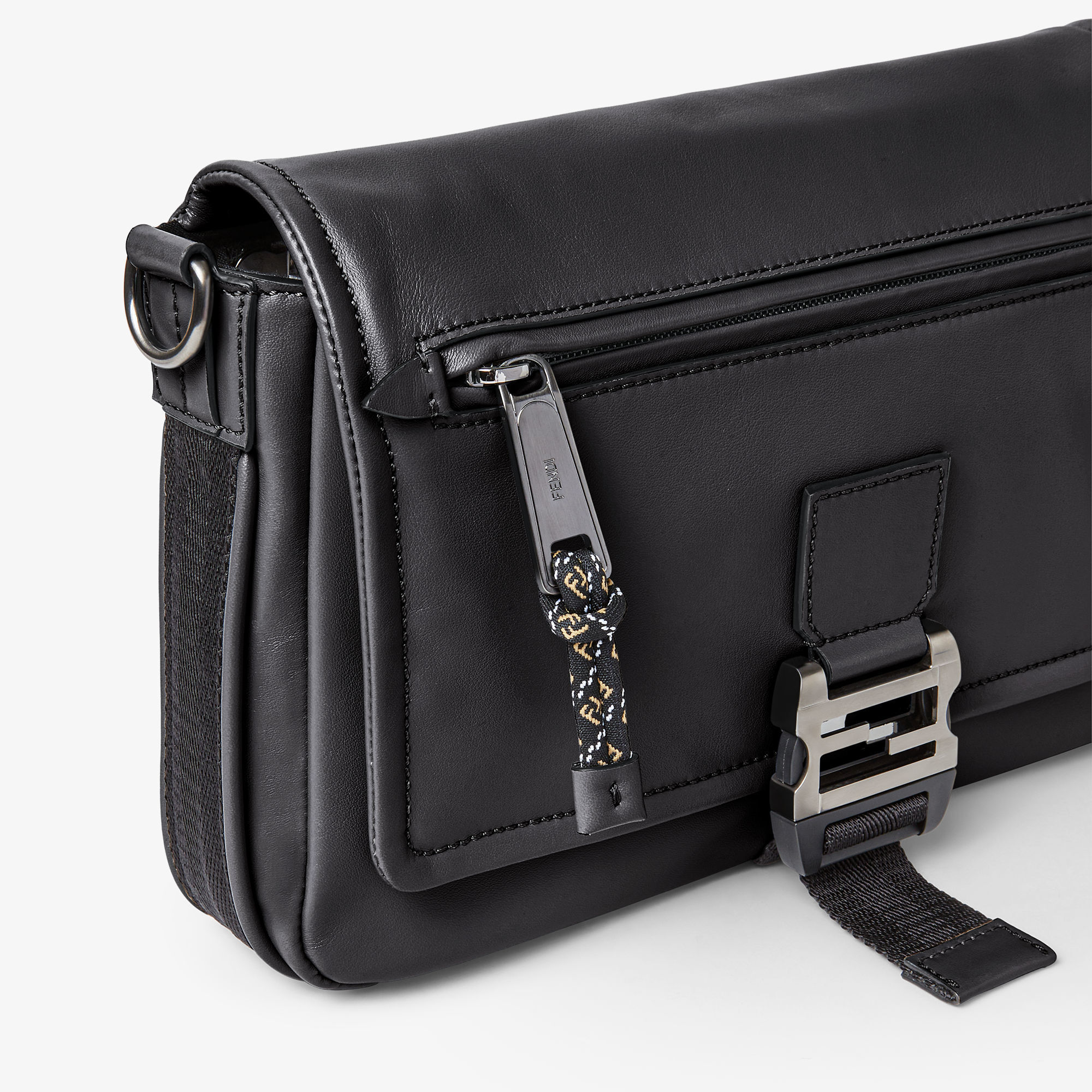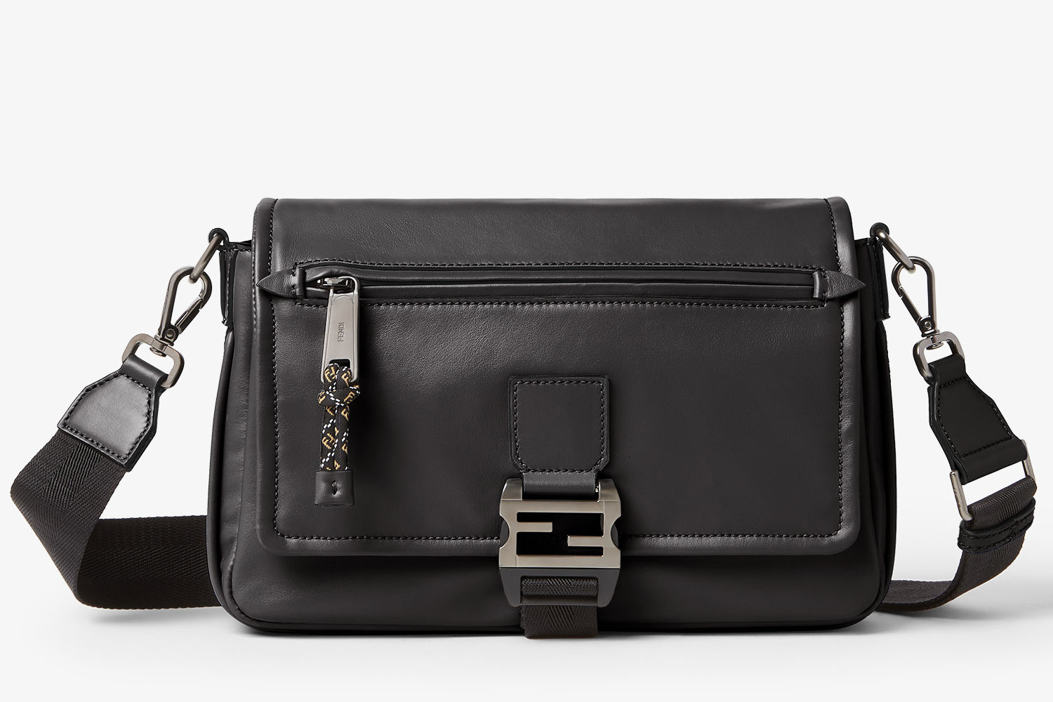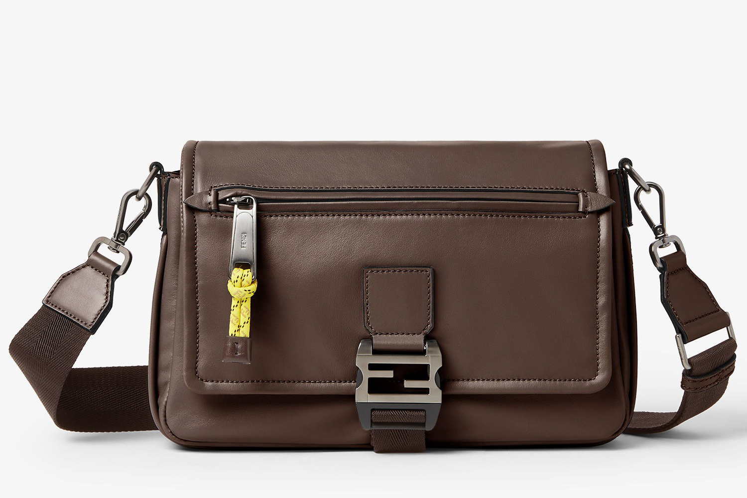 新款 FENDI Flux 邮差包采用光滑牛皮革塑造洗练翻盖包廓形,拉丝银灰色 FF 金属搭扣和绳索拉链头为包包注入户外机能风格,科技布料肩带可拆卸和可调节,前置拉链口袋便于随手取放物品,内部可收纳11英寸平板电脑、智能手机和日常必需品,推出浅灰色、棕色黑色3种配色,低饱和单色展露内敛智感。