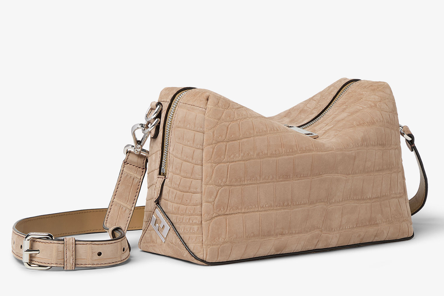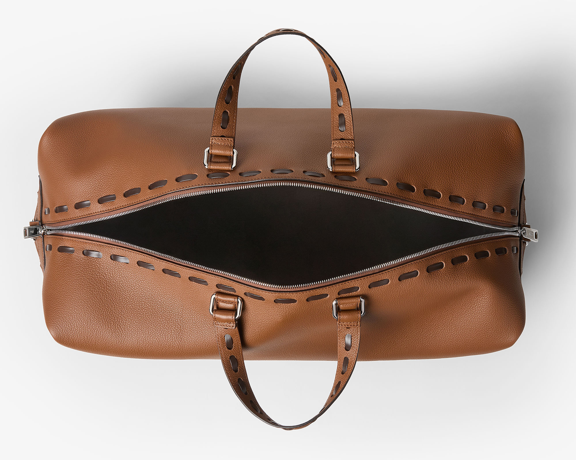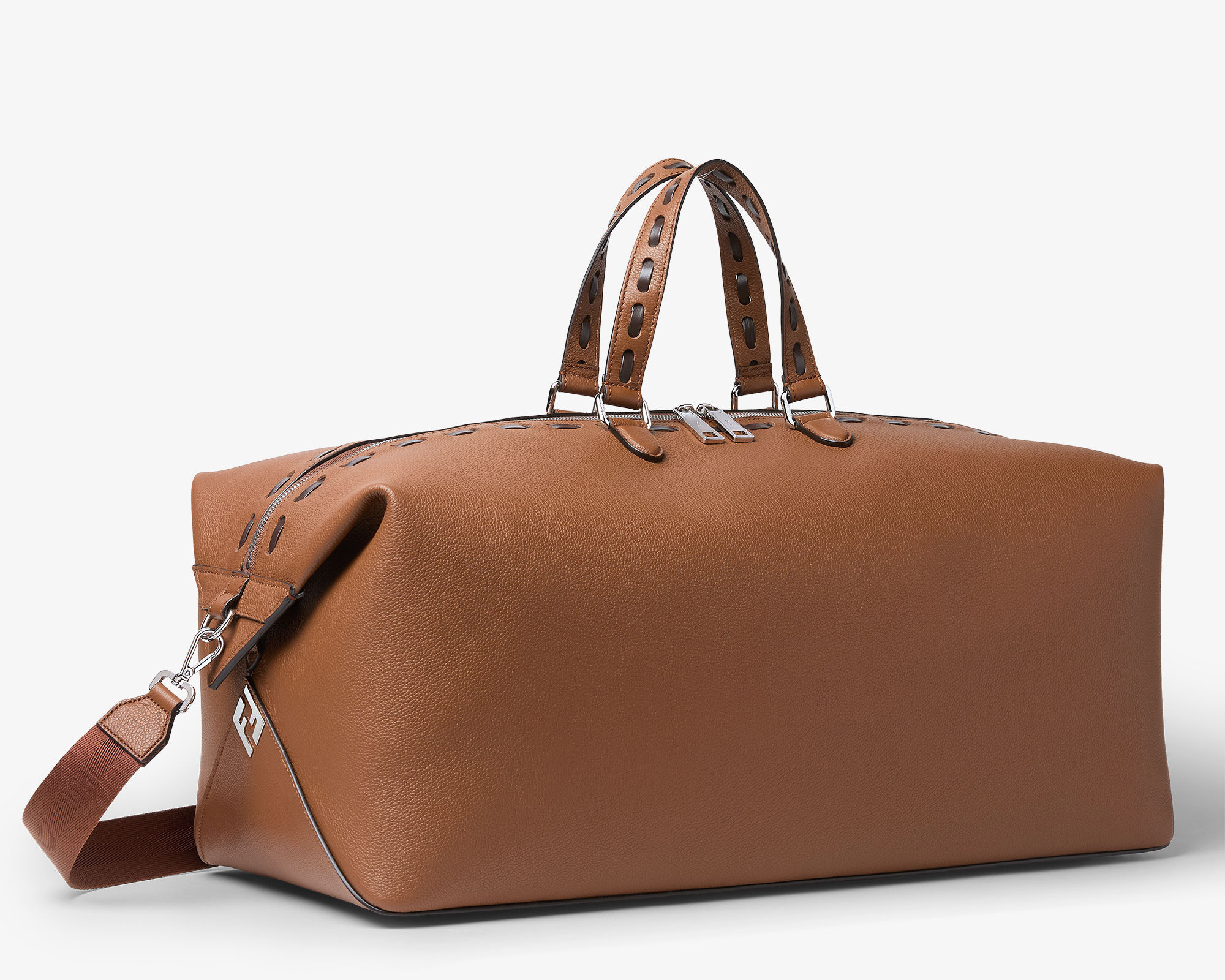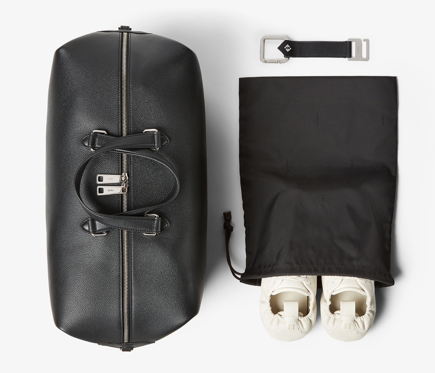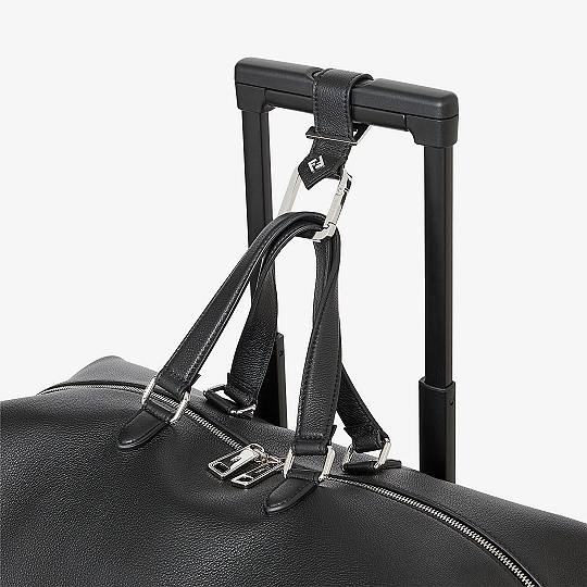 全新 FENDI Lui 行李袋采用柔软的全粒面小牛皮材质,双向拉链开合便于放置大件行李,边角FF金属徽饰作为点睛。包包最大亮点是侧边的按扣设计,空包时可以折叠成扁扁的一片,内部还配有防水尼龙防尘袋,带弹簧扣的皮革绑带可以将包包固定在行李箱的把手上,非常适合旅途使用。推出45厘米宽度和55厘米宽度两种尺寸,里衬为科技布料,配有衬垫提手和可调节可拆卸式肩带,可手提或肩挎。