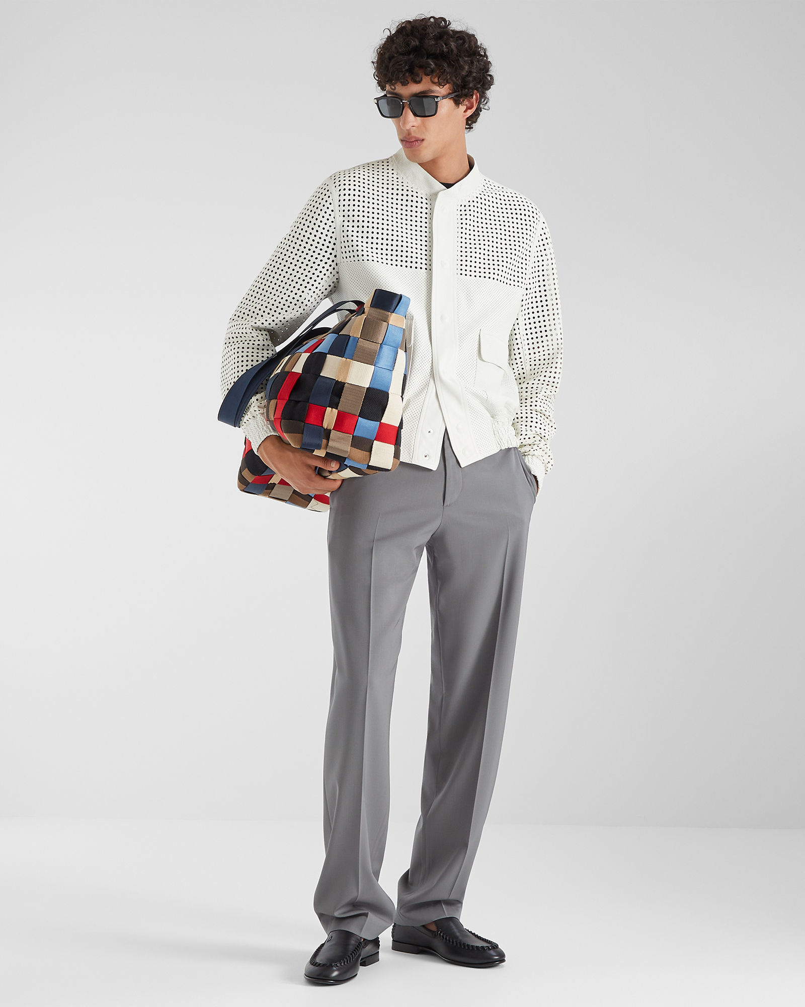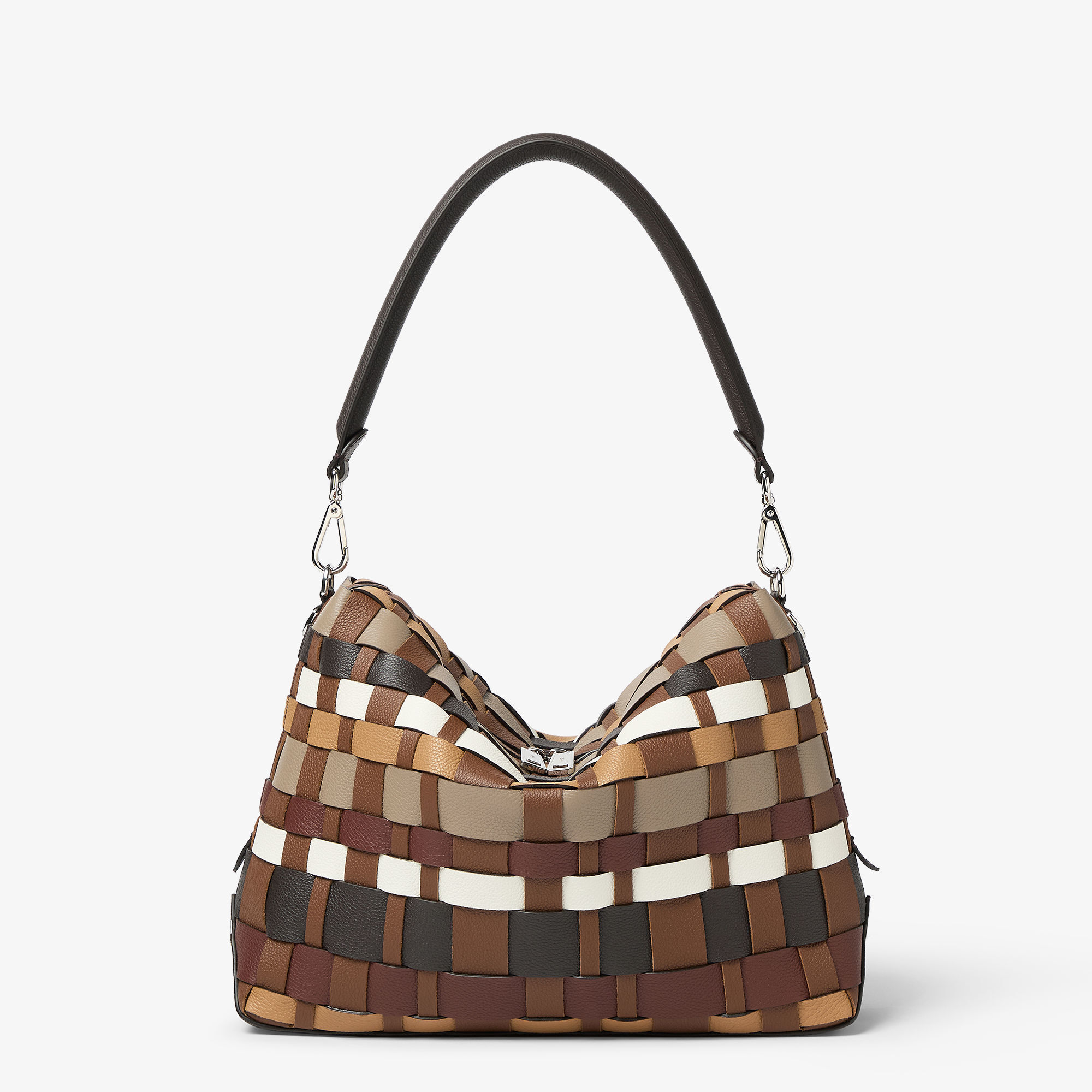 Lui 大号手袋采用不同宽度和色调的牛皮革条手工编织出柔软廓形,白色、沙色、卡其色、棕色、巧克力色等同色调组合交叠错落;大号 Shopper 购物袋将皮革条与色彩缤纷的尼龙织带巧妙交织在一起,轻盈迈入斑斓之季。