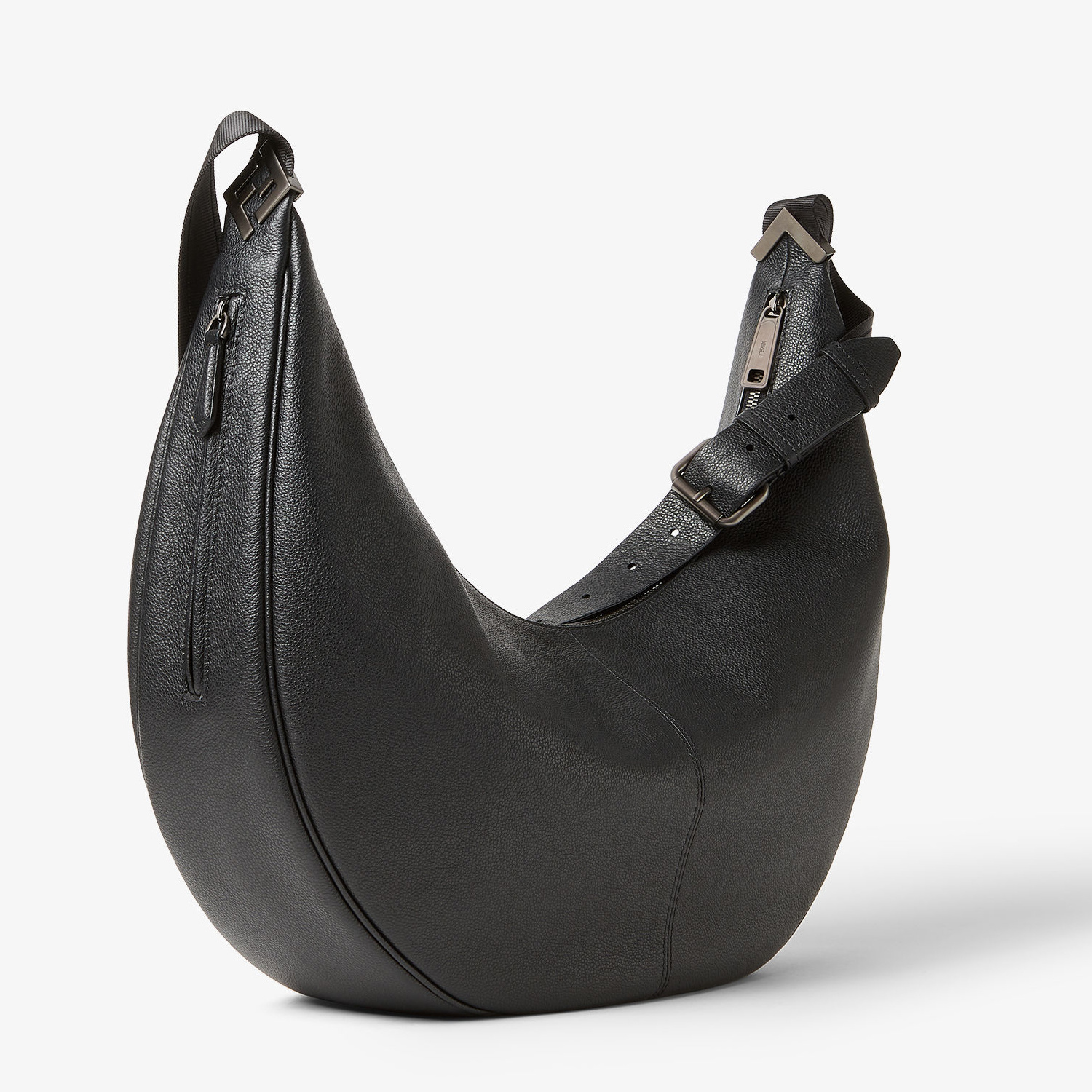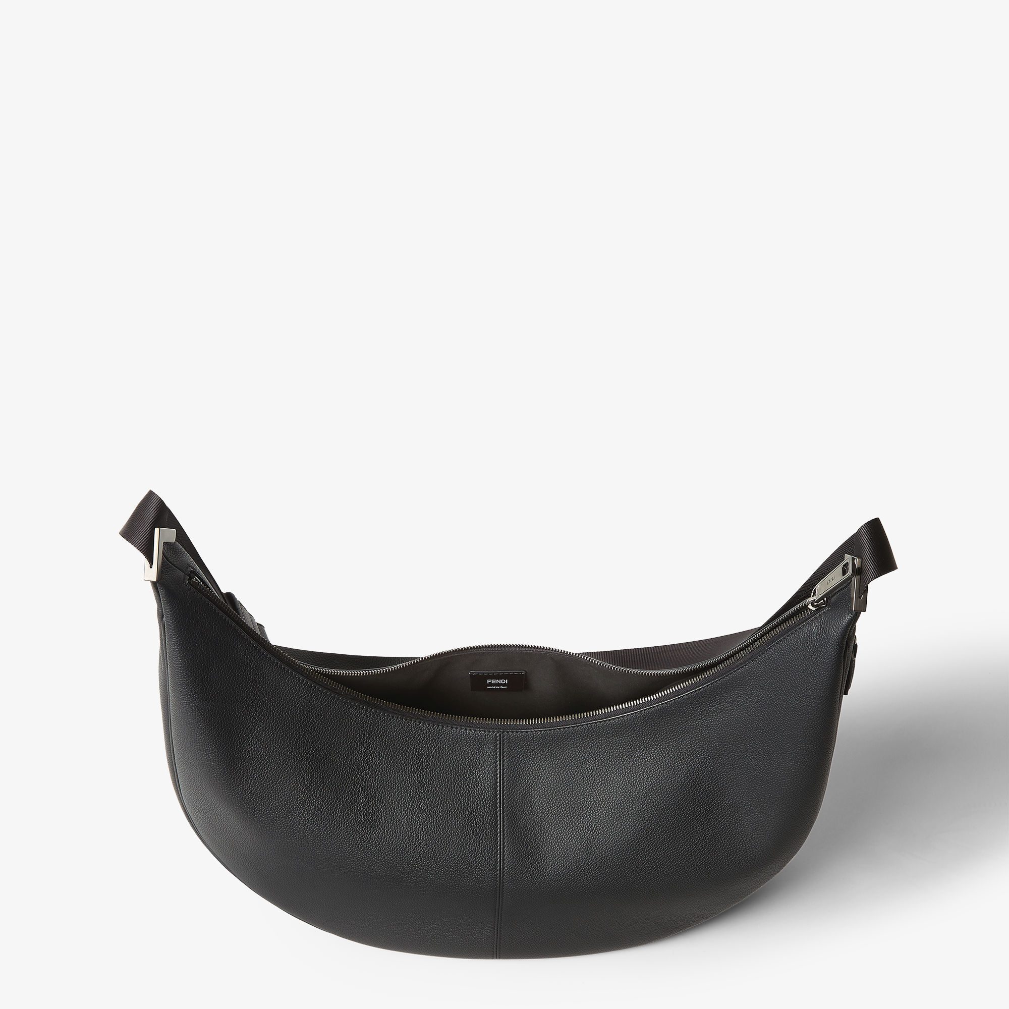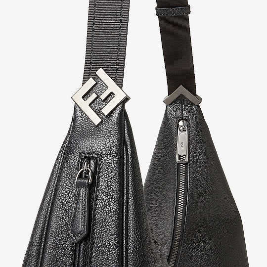 Melon 肩背包推出新款大号尺寸,延续轻松随性的月牙廓形,包包采用黑色全粒面小牛皮制作而成,配有实用侧拉链口袋和FF金属贴花,简约版型调动搭配灵感,探寻日常的无限可能。