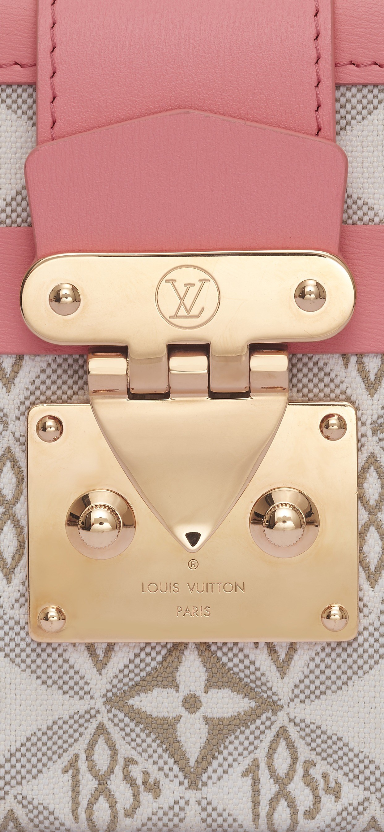 Tumbler 锁扣、皮革饰钉等元素灵感则来自1858年 LV 推出的首款平顶旅行箱——用于加固行李箱的榉木条和铆钉,演化为小牛皮条饰边与金属圆铆;LV 1886年发明配备2个弹簧扣的单锁系统「Tumbler」锁扣,让每位客人的所有行李箱均可使用同一锁匙开关。· 这只包包怎么背? ·