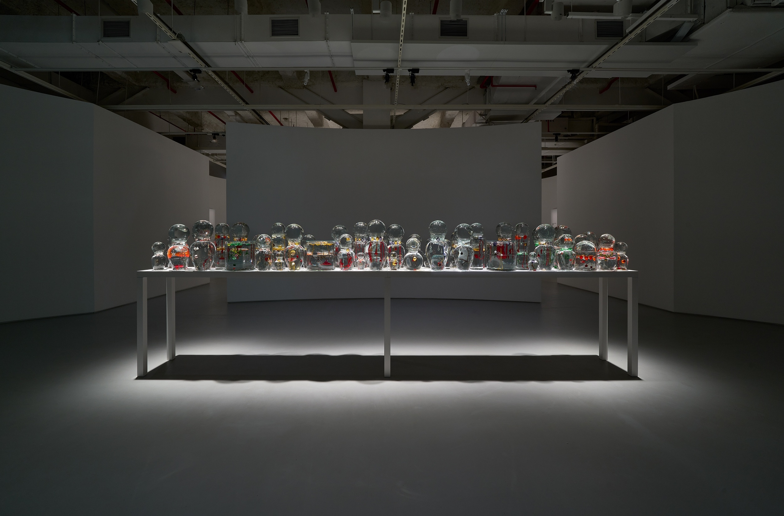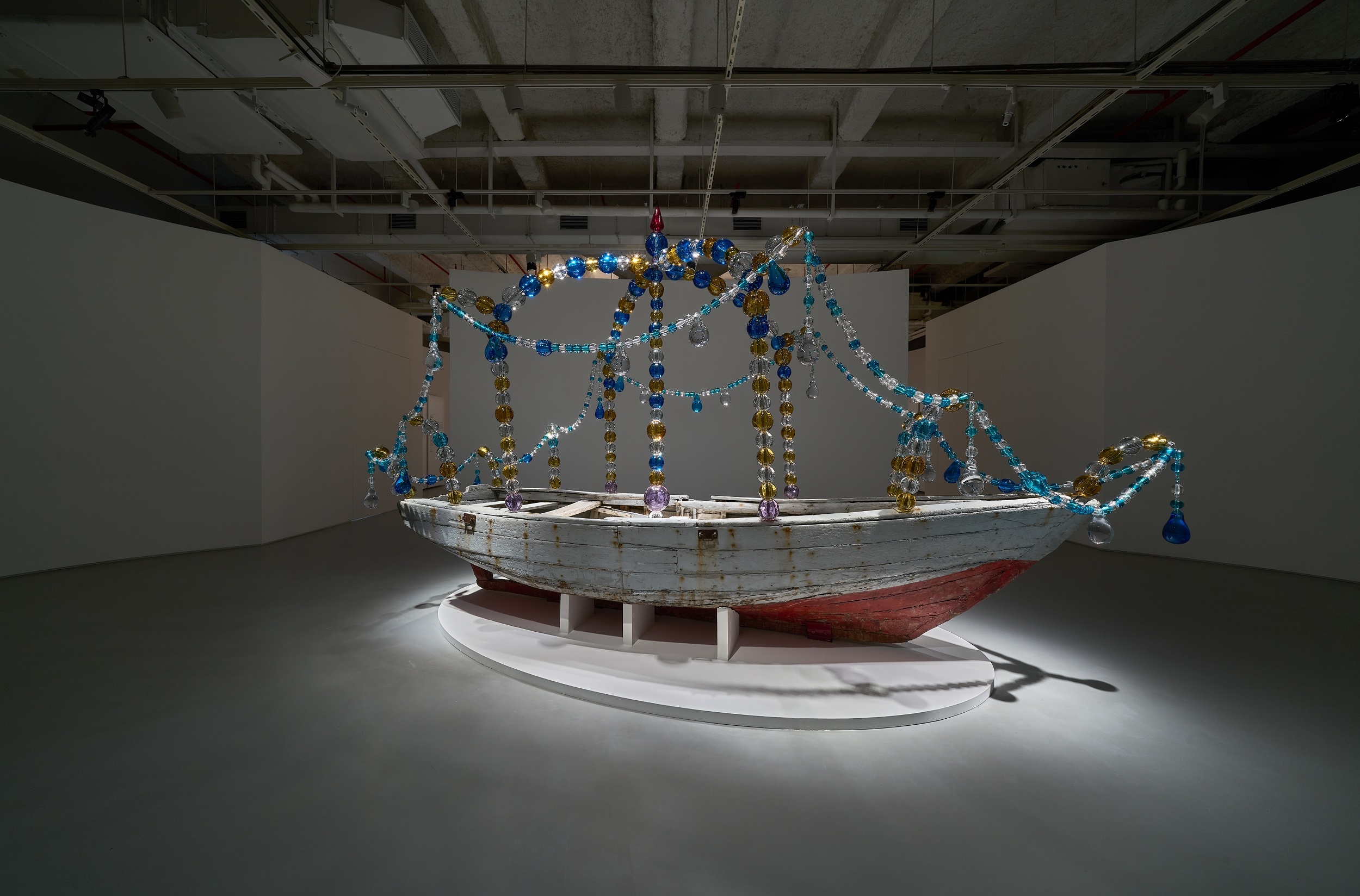 欧托尼耶将本次展览构思为情感与空间的组合。《拉格利马斯》(2002)在装满清水的玻璃瓶中漂浮着眼泪般闪烁的小型物件,唤起对祈祷和沉思空间的想象。《泪之船》(2004)源自在迈阿密海滩发现的一艘小船,致敬移民历史与个体记忆,以璀璨的玻璃珠加冕,将悲剧转化为希望。