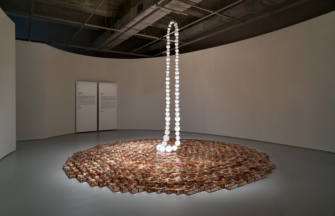 在最后一个展厅中,两件重要作品相互呼应。《白色野花环》(2009)是一条纪念碑式的项链,灵感源自夏威夷岛上欢迎陌生人的迎宾花环以及具有神圣意义的「身光」形态,向那些因记忆而依然在场的灵魂致敬。《瑰色河流》(2026)是为此次展览特别创作的场域特定装置,由手工铸造的玻璃砖铺展于地面,宛如一条流光溢彩的粉色河流。