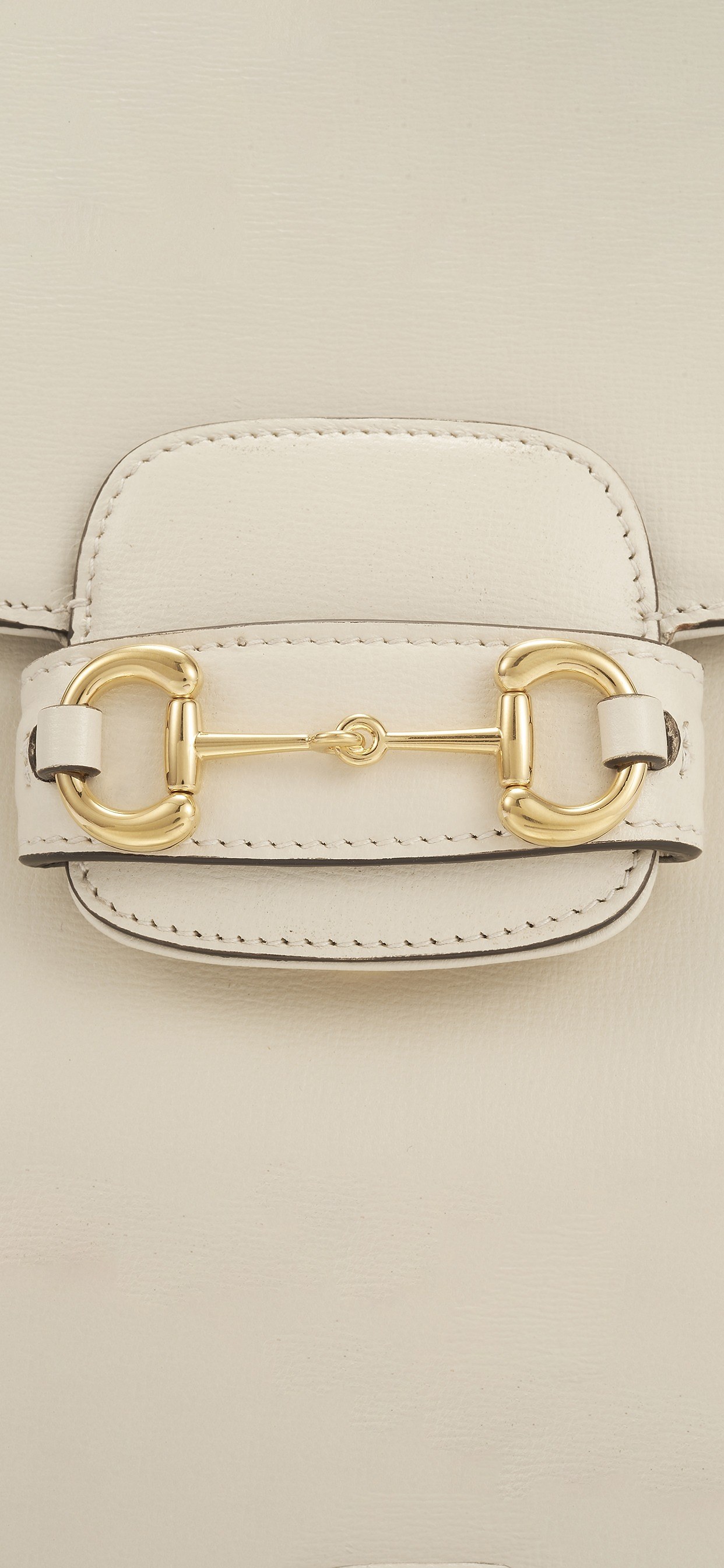 手袋延用象牙白色皮革制作,搭配标志性的「马衔扣」元素,包包亮点是开合方式和手拎包相比有所不同——佩戴者需要将翻盖从马衔扣中提拉抽出,依然简单方便,但给人感觉更具仪式感。