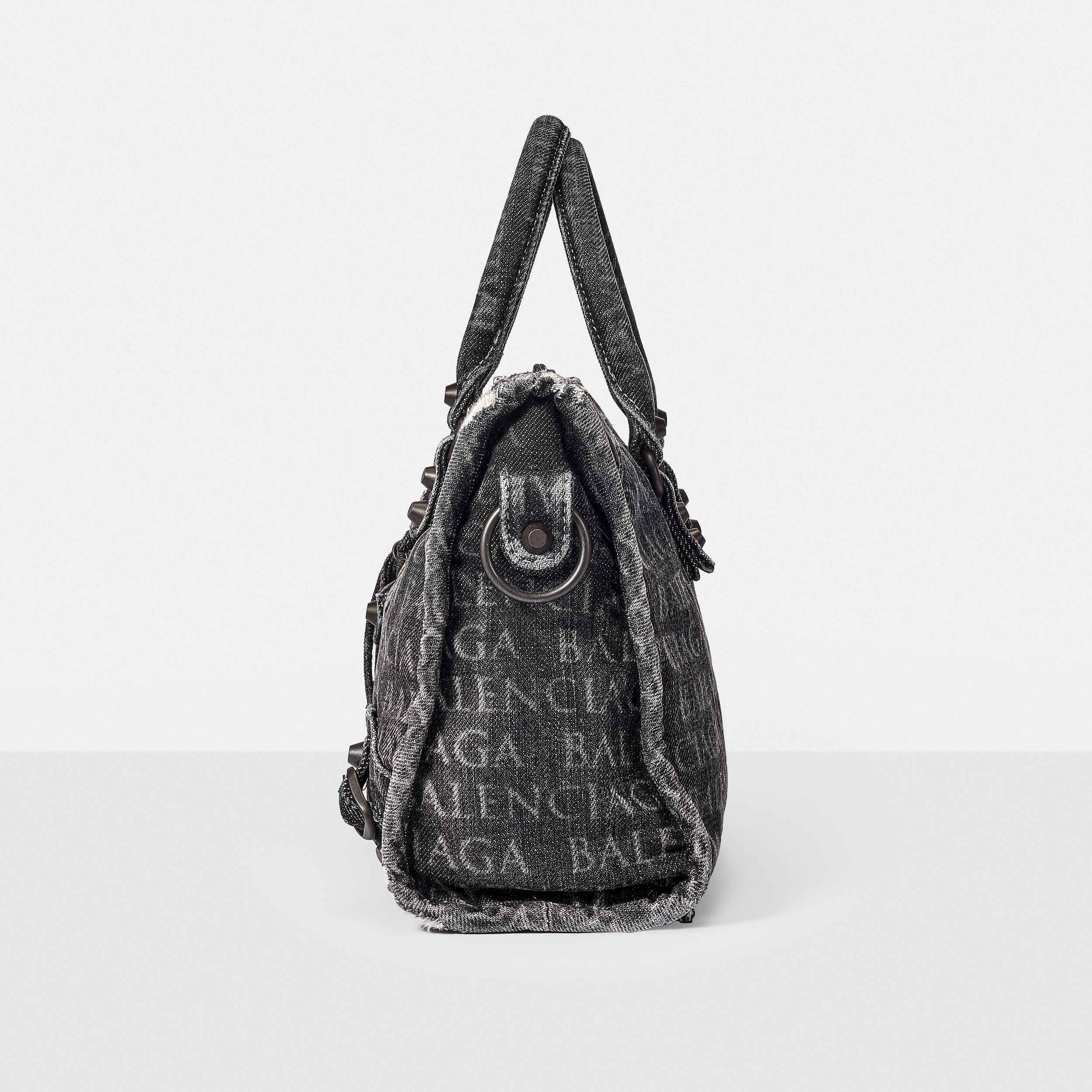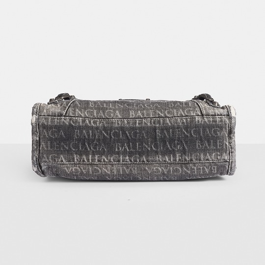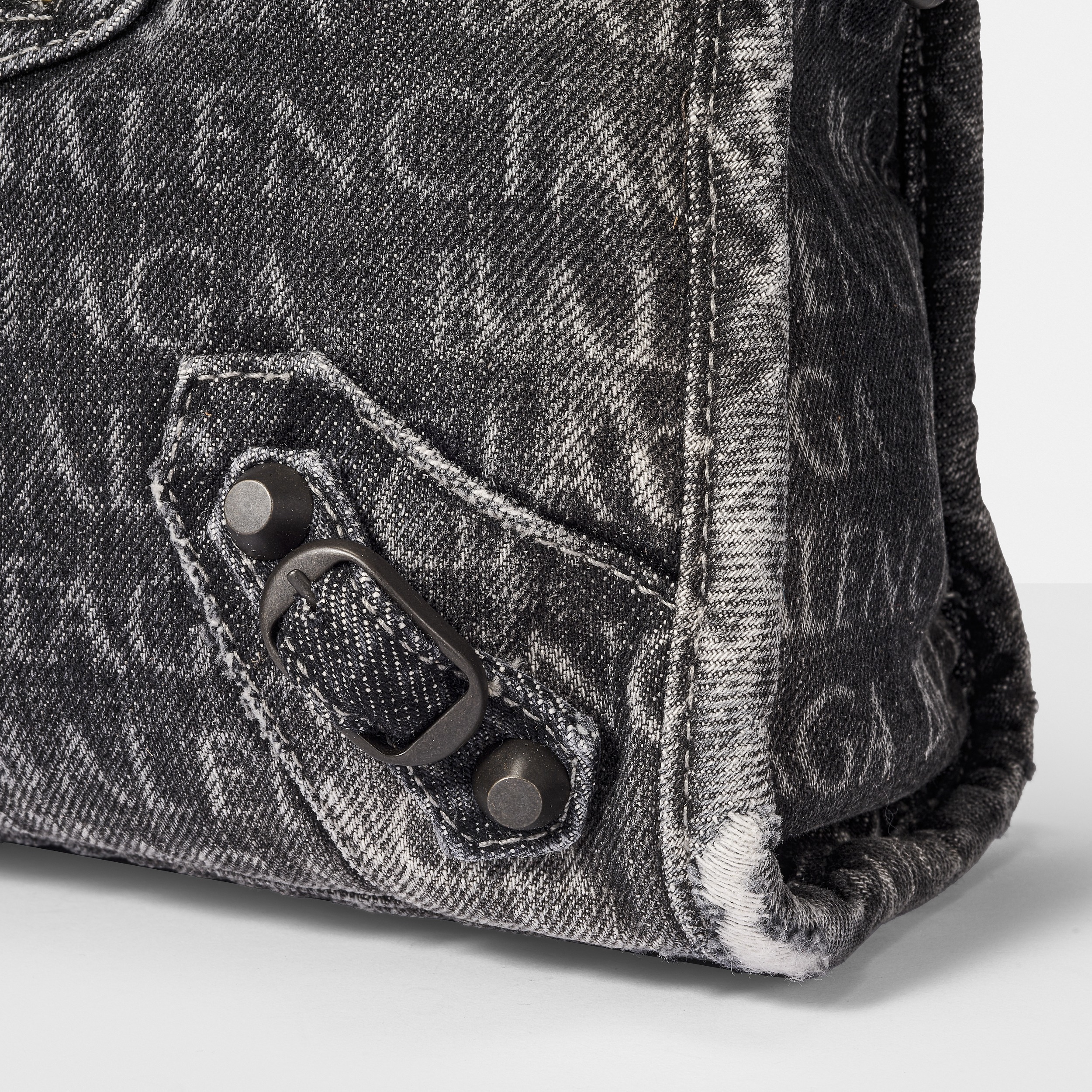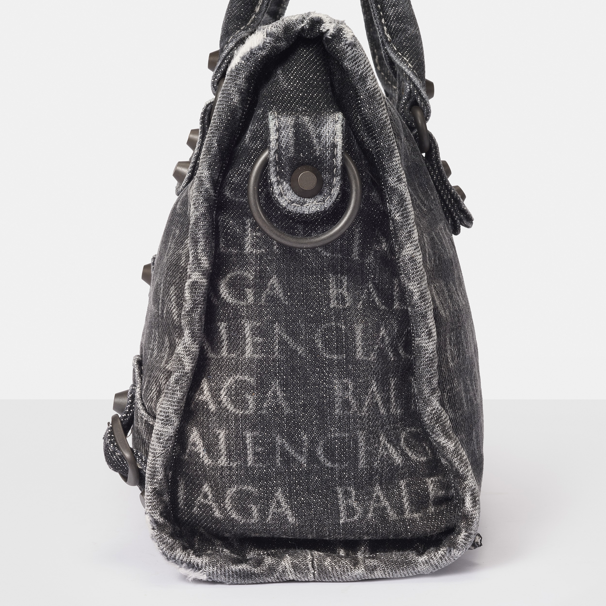 这只 Le City 小号机车包通过水洗工艺在牛仔布上装饰 Type fade allover 全幅品牌标志,像是循环滚动的广告灯牌,营造出强烈的视觉冲击力。