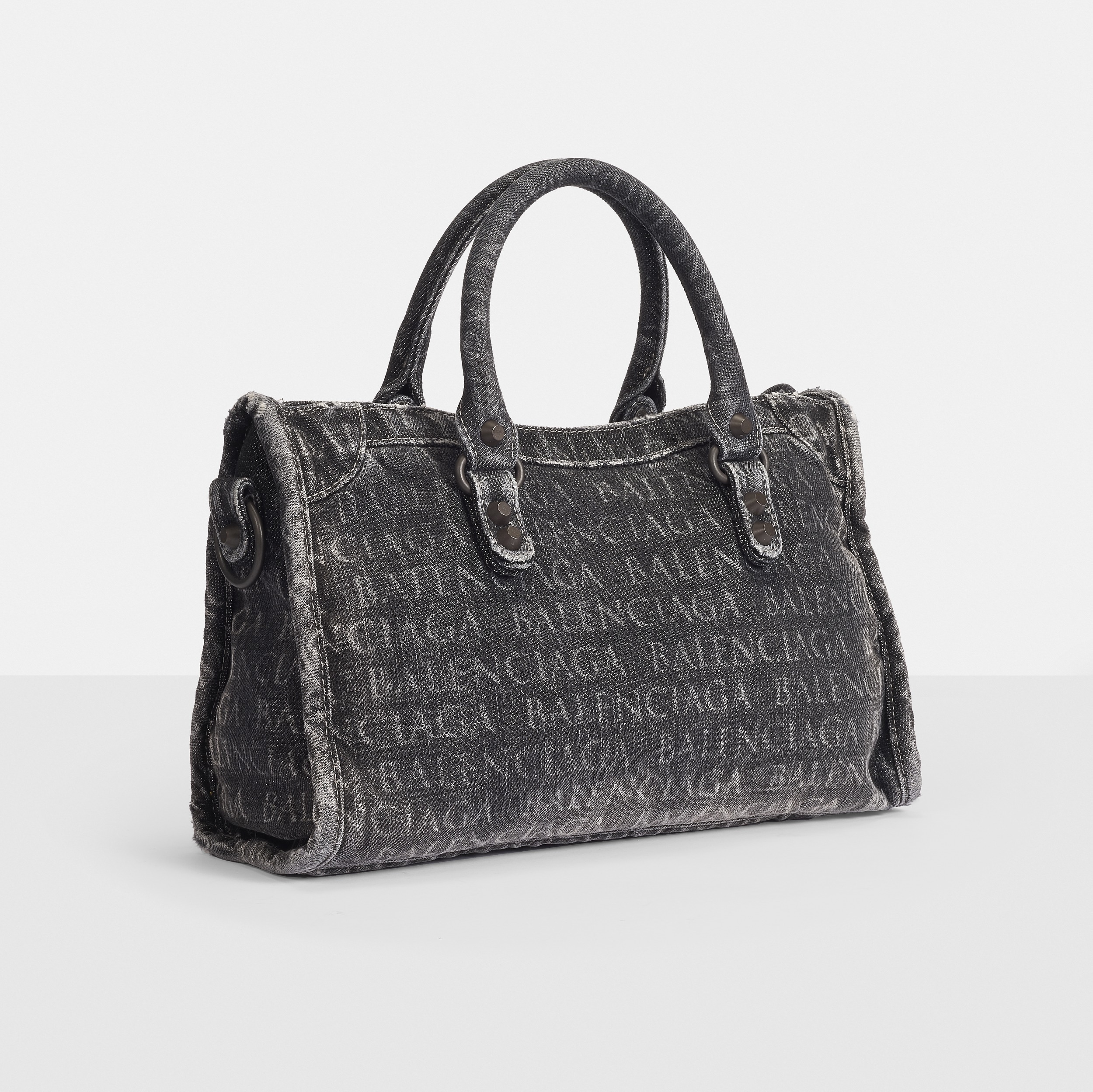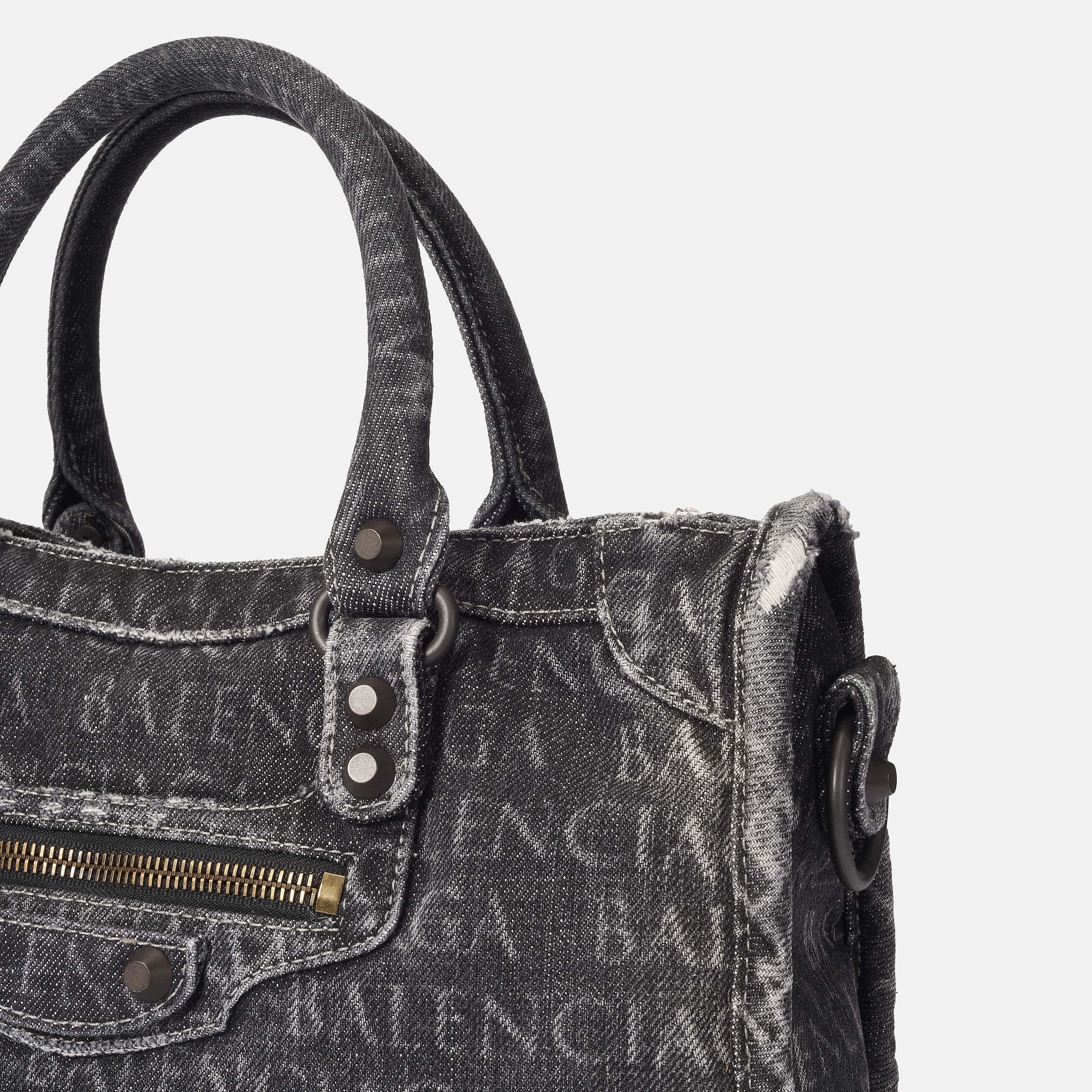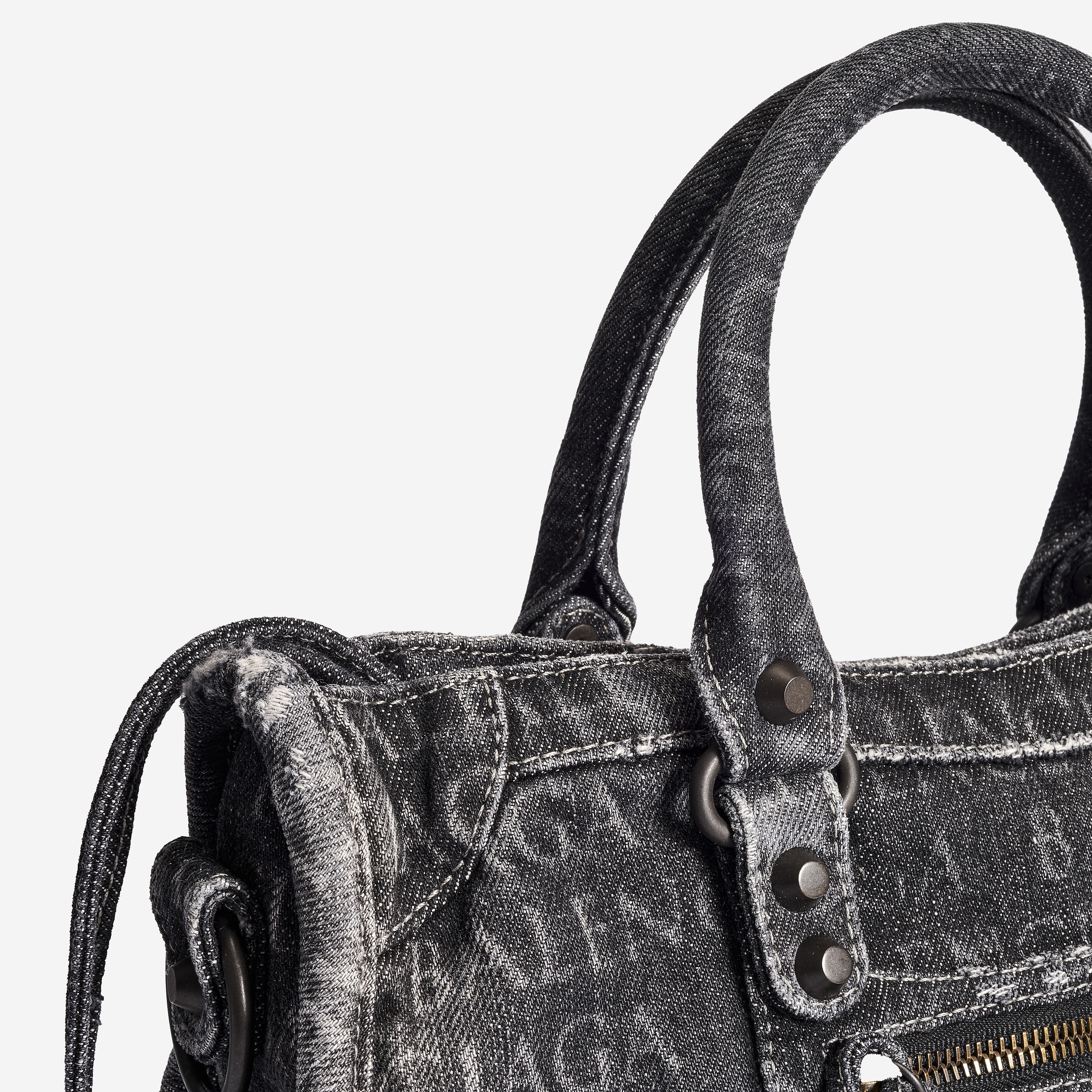 这只 Le City 小号机车包通过水洗工艺在牛仔布上装饰 Type fade allover 全幅品牌标志,像是循环滚动的广告灯牌,营造出强烈的视觉冲击力。