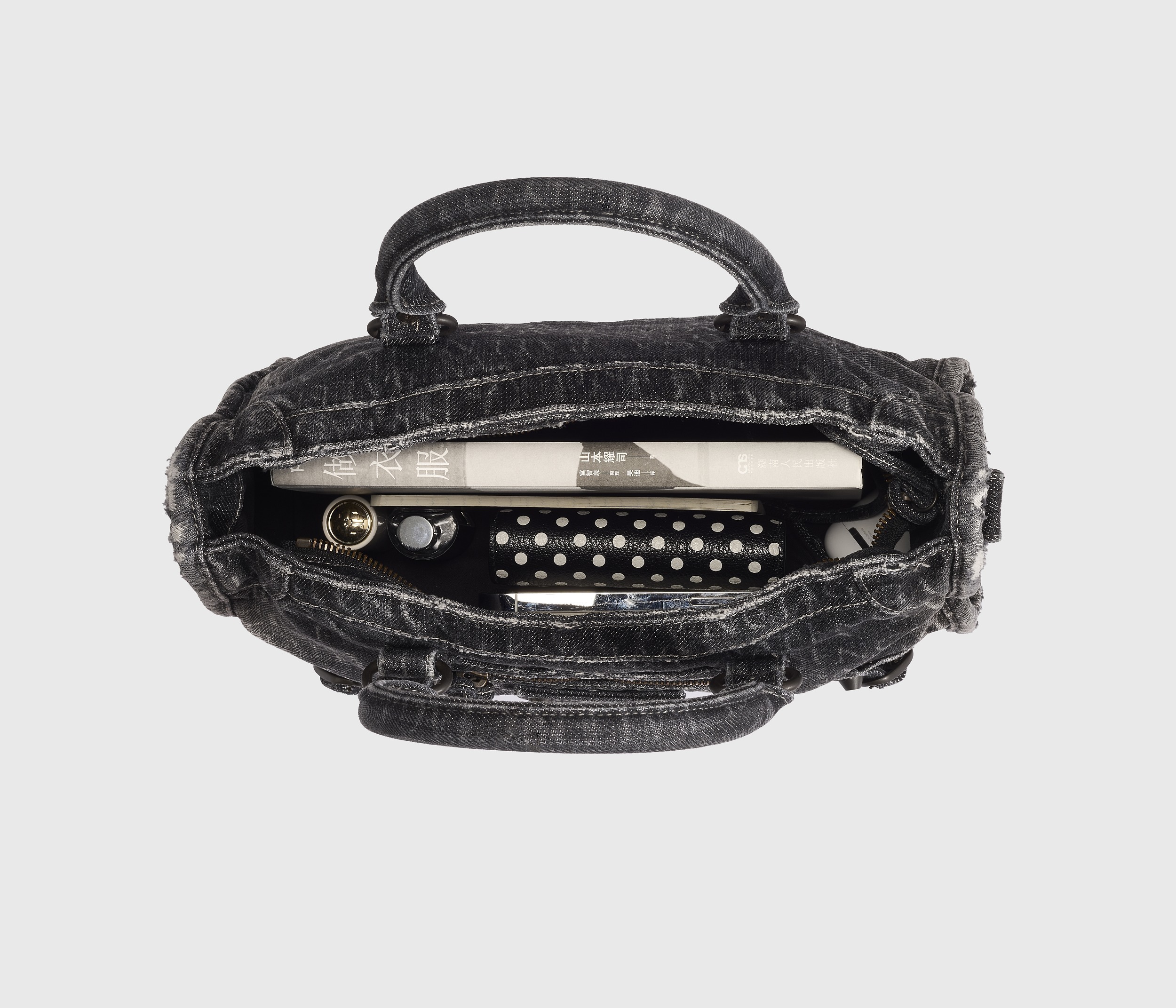 包包采用棉质牛仔布制作而成,通过染色、水洗、打磨等工艺模拟褪色和磨损效果,呈现出经年累月使用后的陈旧感,赋予包包以独特个性。
