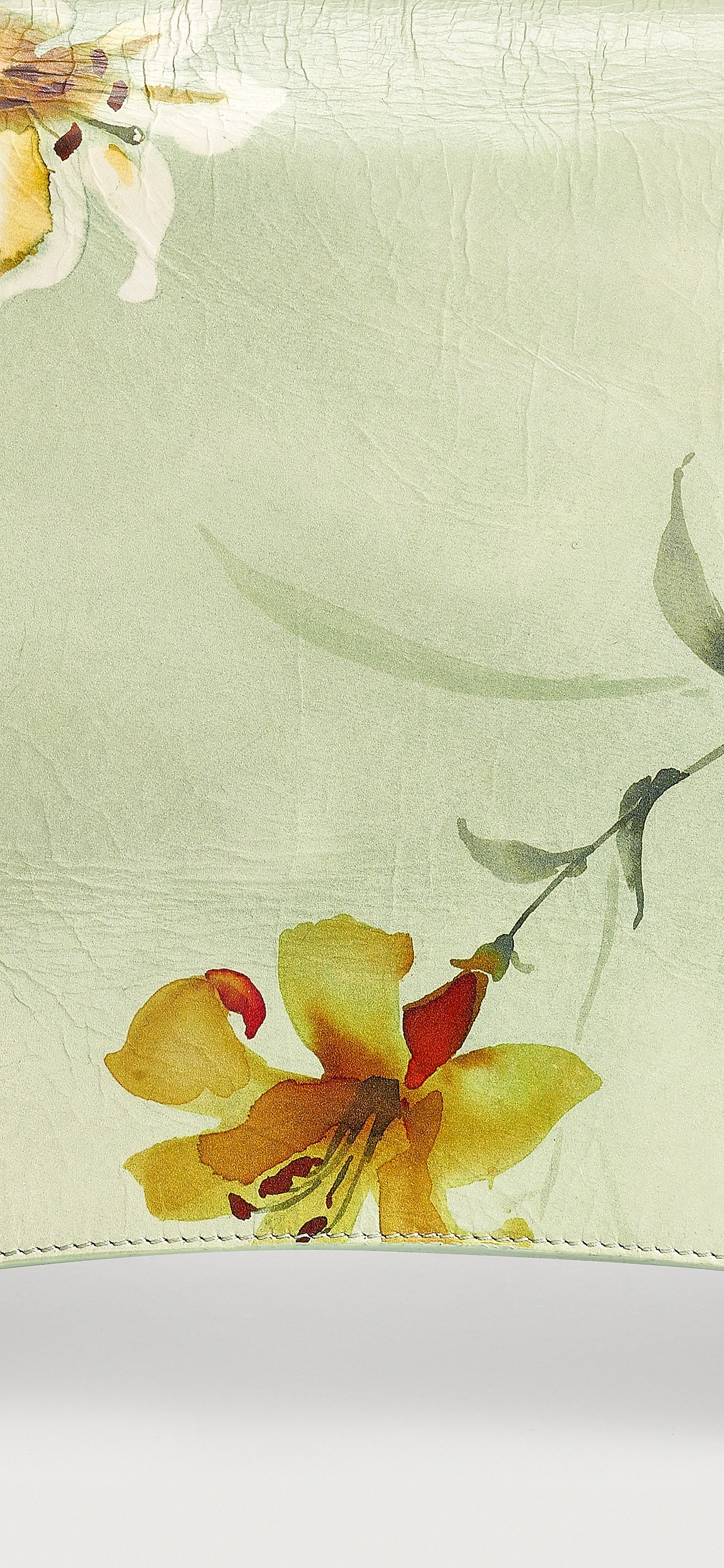 包包以清新恬淡的浅绿色为背景,铺印白色和黄色百合花水彩图案,并一直蔓延到包底和肩带部分,素净花卉和充满意境的留白为包包增添浪漫雅致情调,与超大包型营造出的强势气场形成微妙平衡。