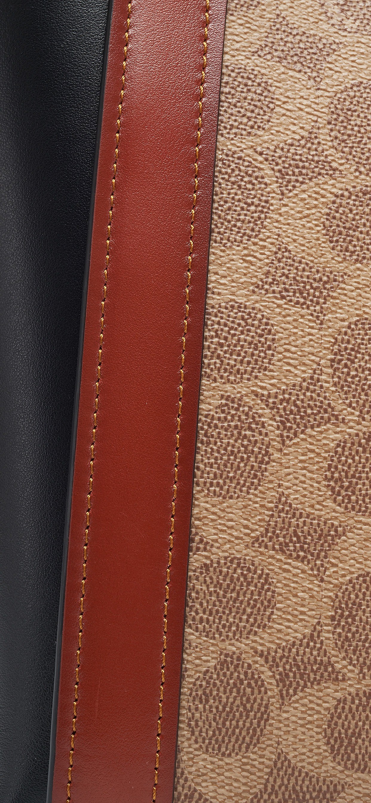 Signature C 经典标志帆布诞生于20世纪90年代末,由前创意总监 Reed Krakoff 设计,将弯月形 C 字母翻转组合,形成如同花瓣、蝴蝶造型的独特 Pattern,深浅卡其色复古且不易过时。包包的拼接处全部采用黄褐色明缝线,线条感非常强,平整细腻的走线对工艺要求也很高。