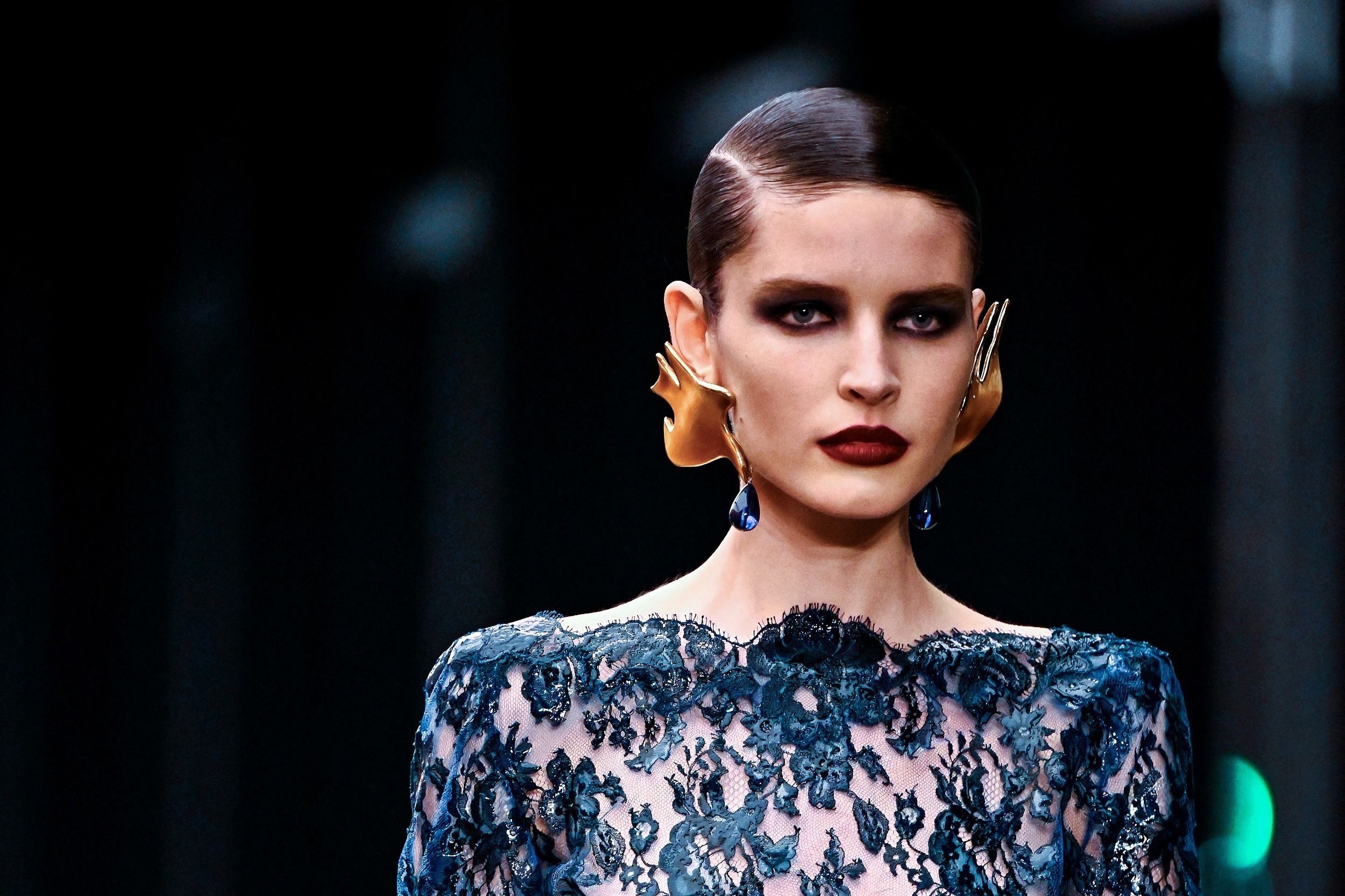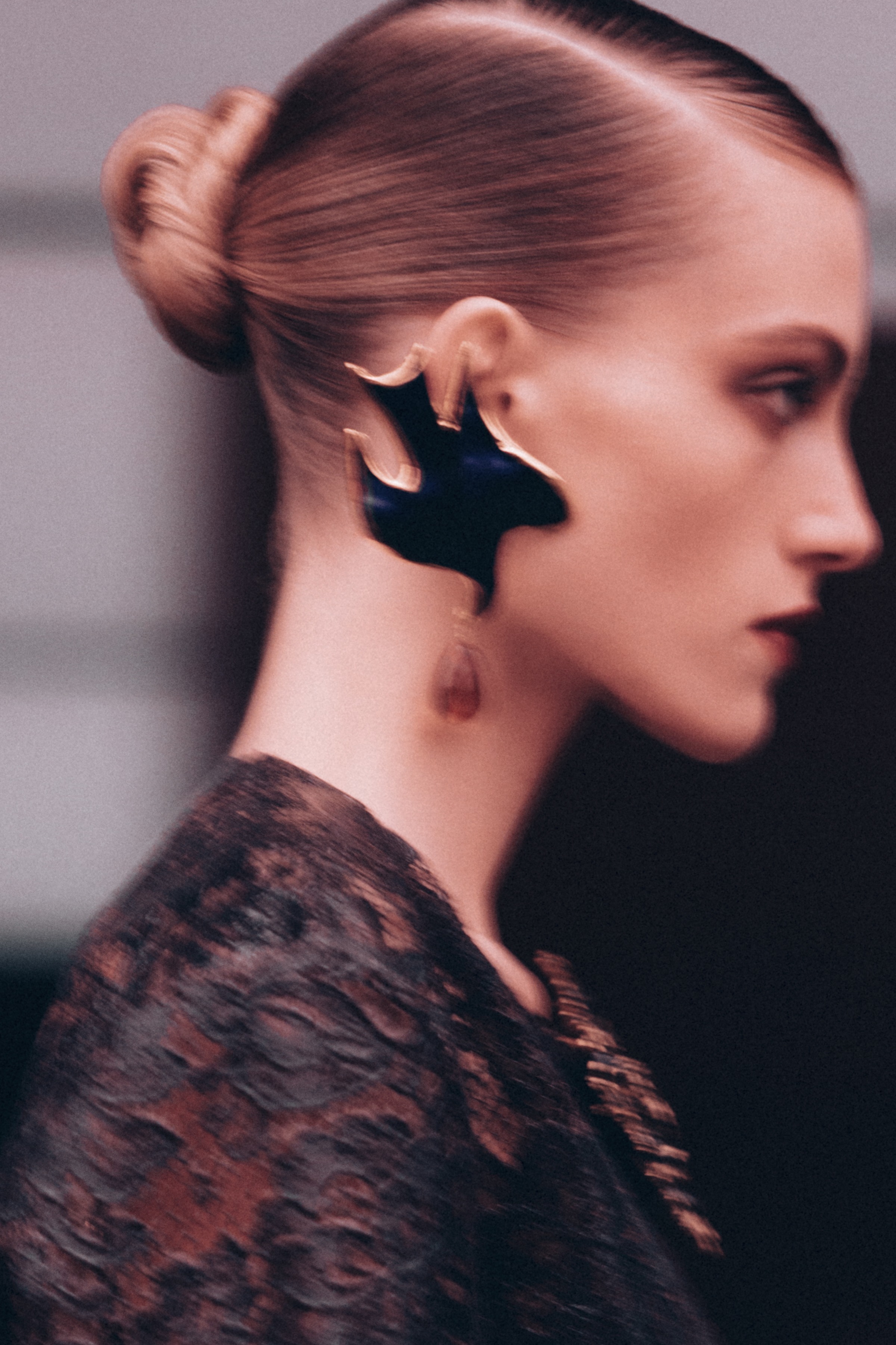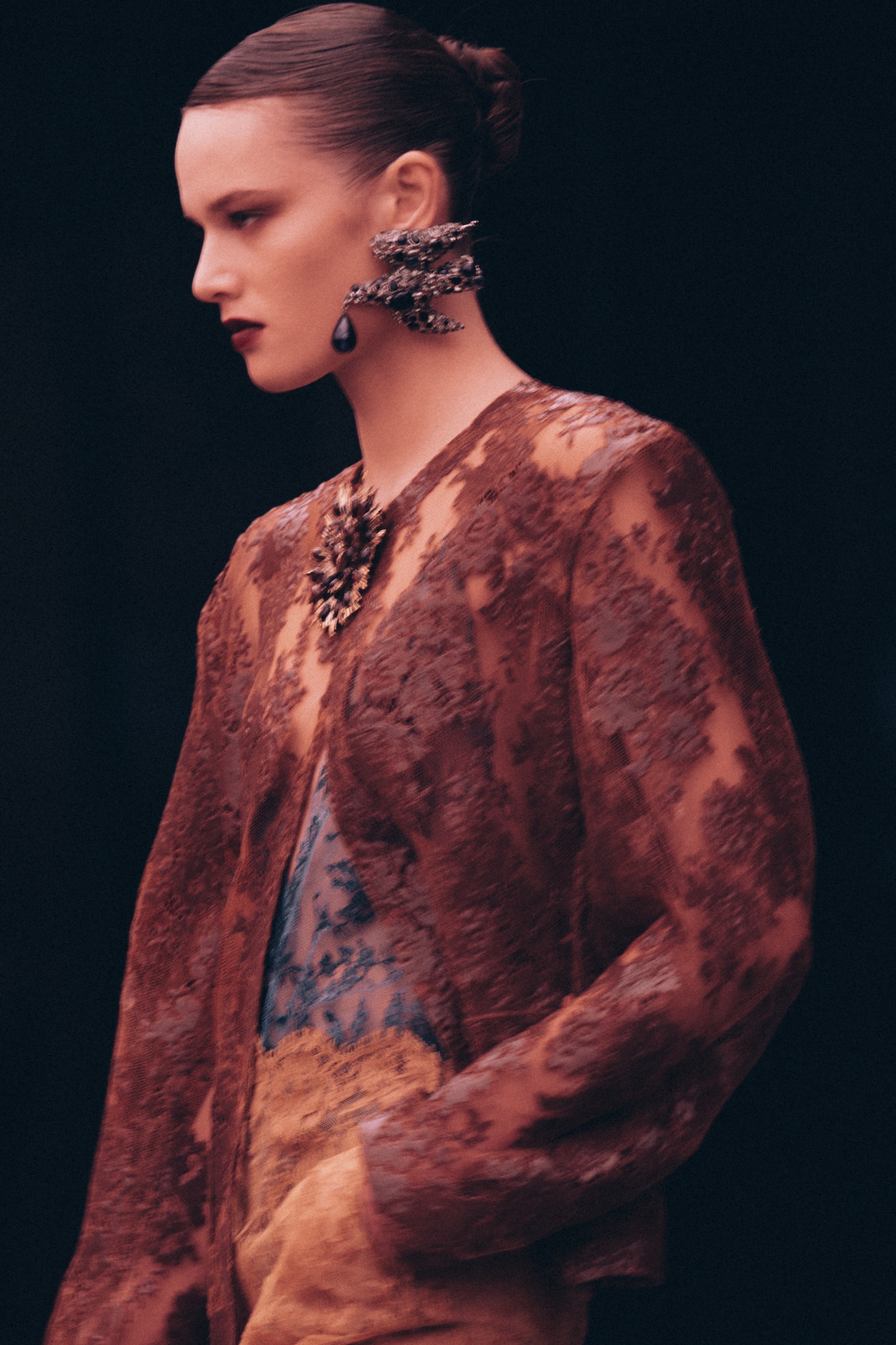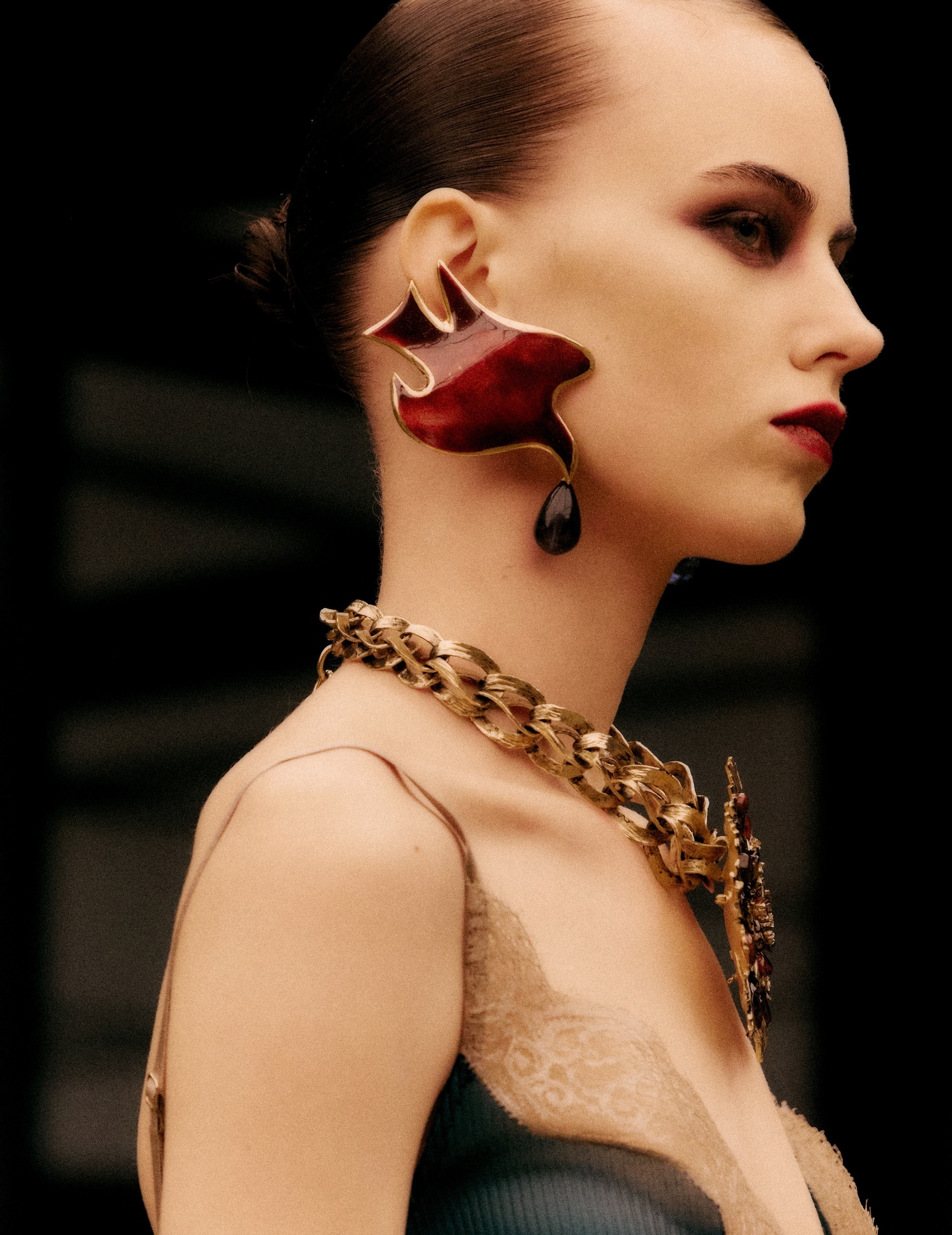 模特妆容复刻自 Helmut Newton 镜头下 Saint Laurent 广告女郎的经典形象——侧分油头向后梳成发髻,搭配烟熏眼妆、颧骨修容和暗红唇色。服装染上油画般的色彩,从赭石、青绿、法蓝渐次过渡到深棕色调,最终由雕塑感十足的鸽形珠宝点亮。(左右滑动浏览更多图片)