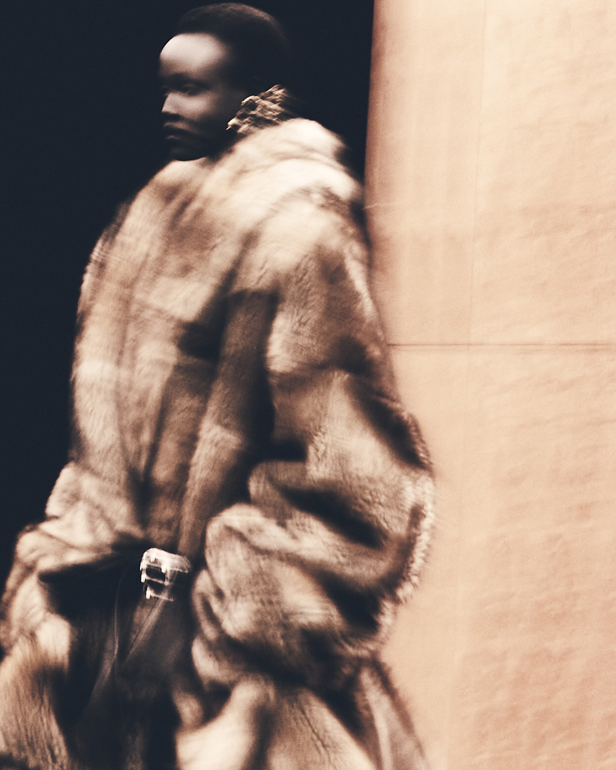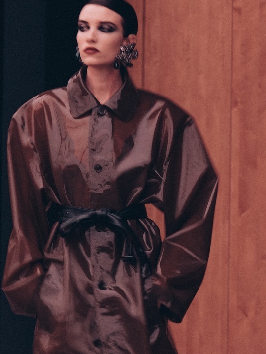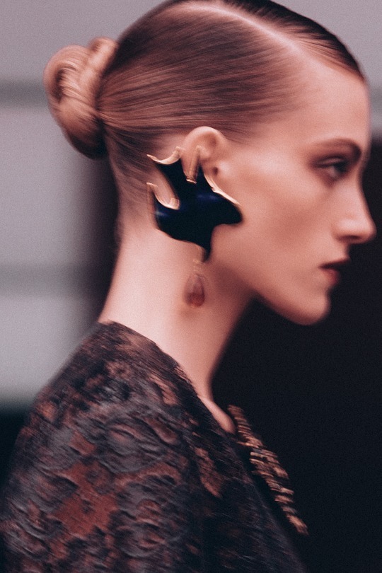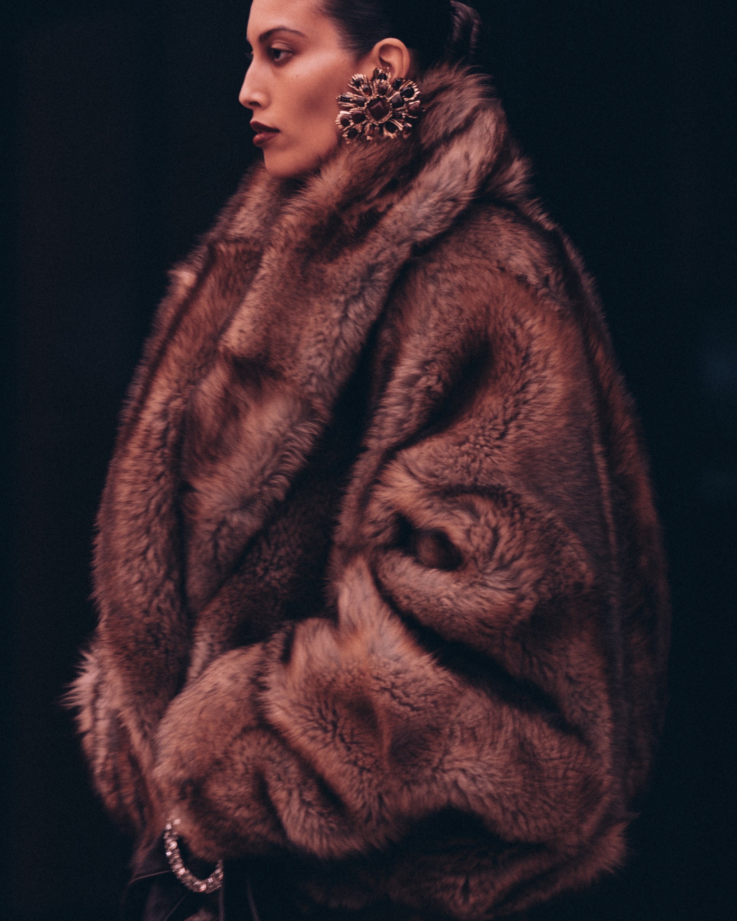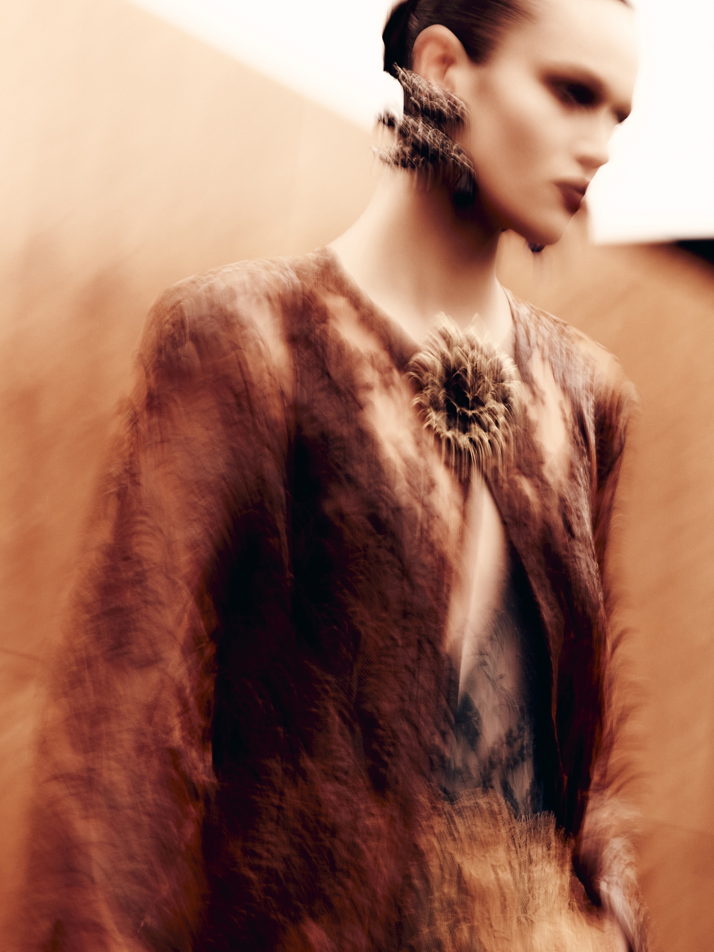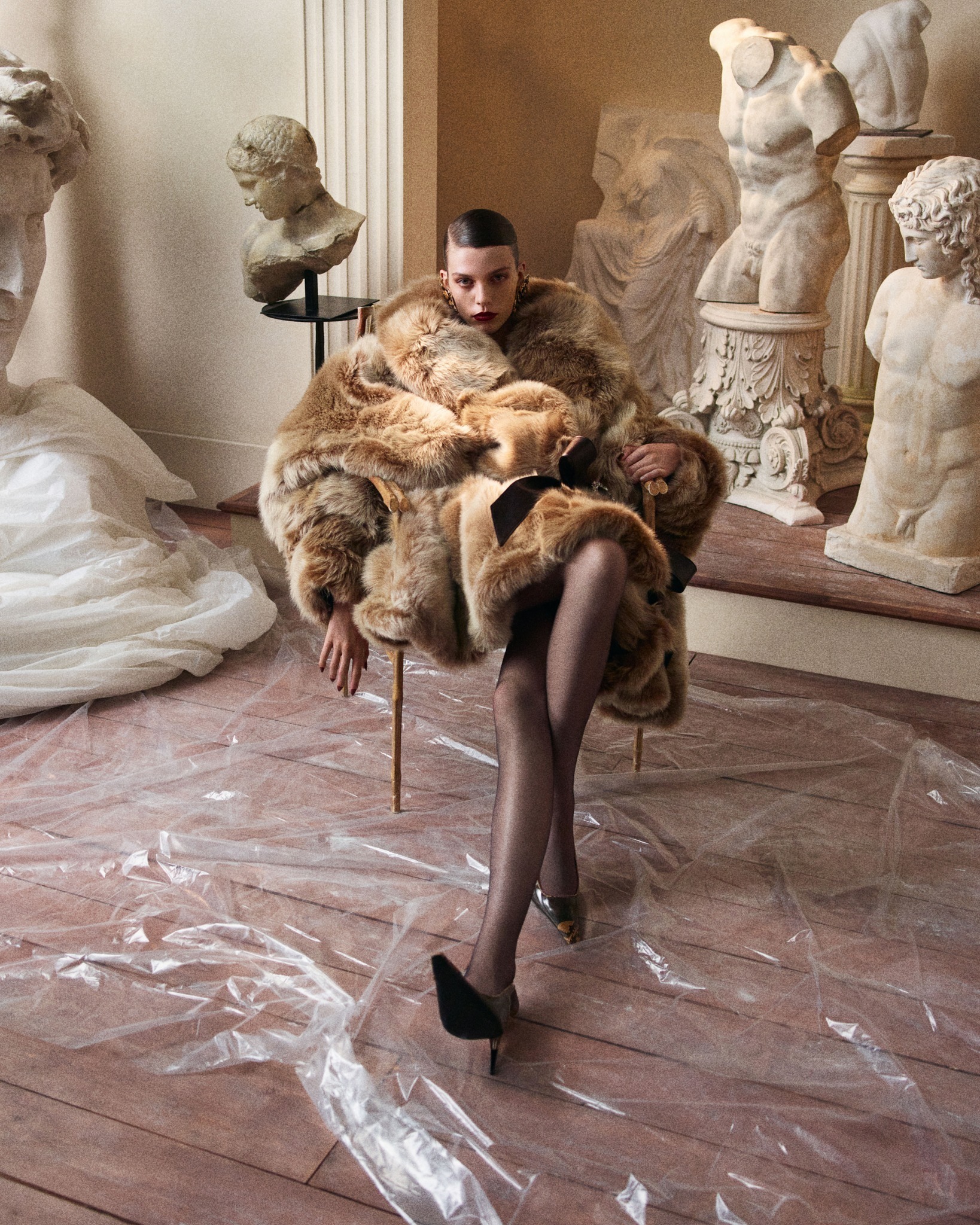模特妆容复刻自 Helmut Newton 镜头下 Saint Laurent 广告女郎的经典形象——侧分油头向后梳成发髻,搭配烟熏眼妆、颧骨修容和暗红唇色。服装染上油画般的色彩,从赭石、青绿、法蓝渐次过渡到深棕色调,最终由雕塑感十足的鸽形珠宝点亮。(左右滑动浏览更多图片)