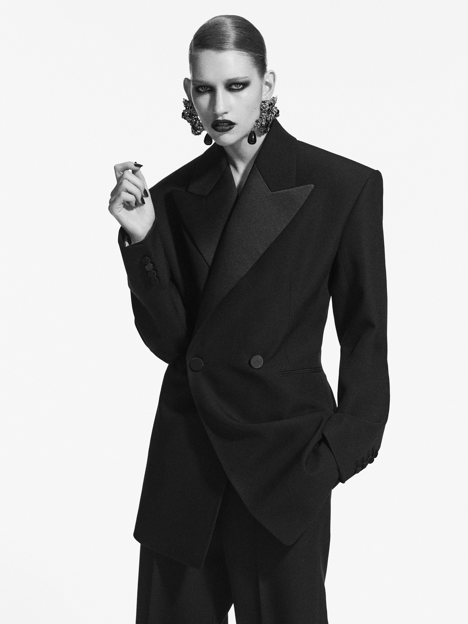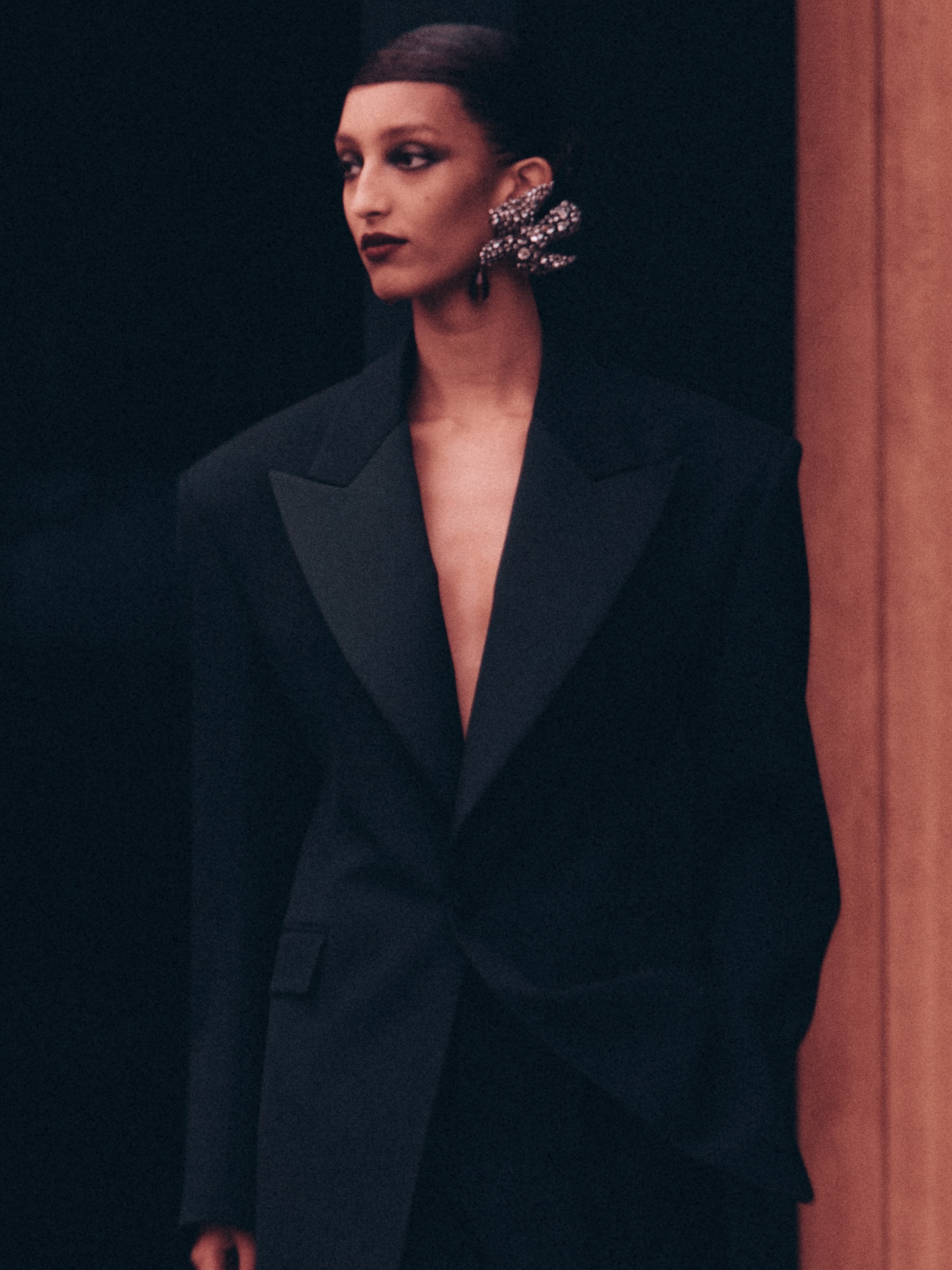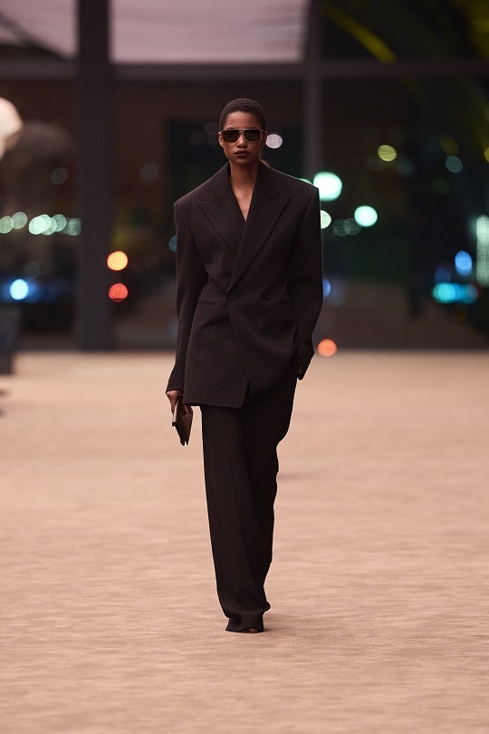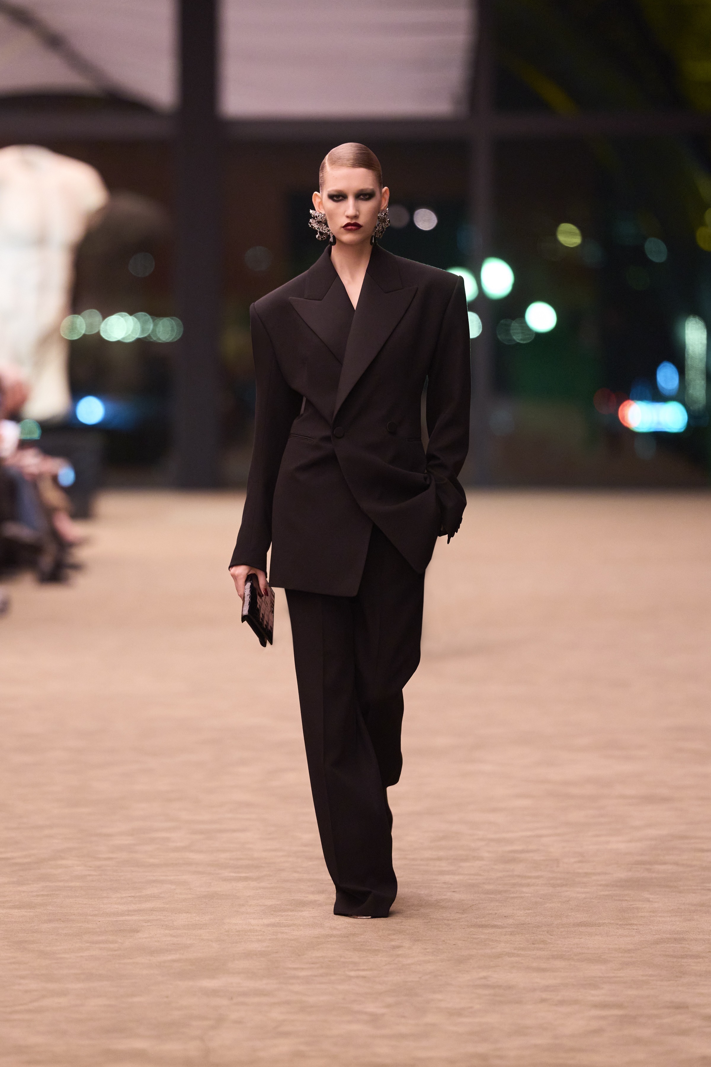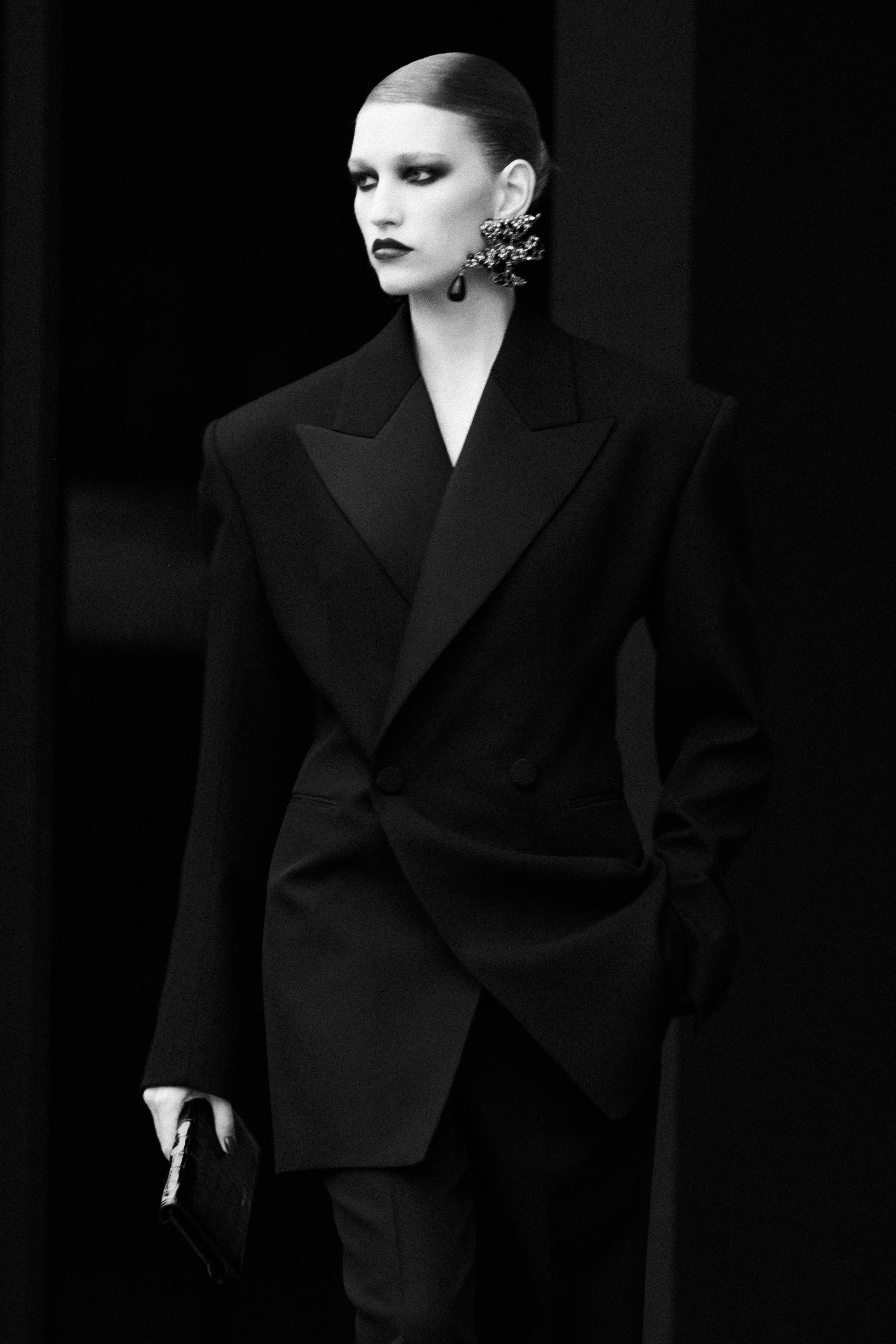 本季秀场共发布49套造型,其中14套为单排或双排扣黑色燕尾西装,藉此致敬品牌经典「吸烟装」诞生60周年。设计师借鉴男装的斜肩线条,搭配更流畅、无衬里的柔软剪裁,诠释刚柔并济的女性力量。