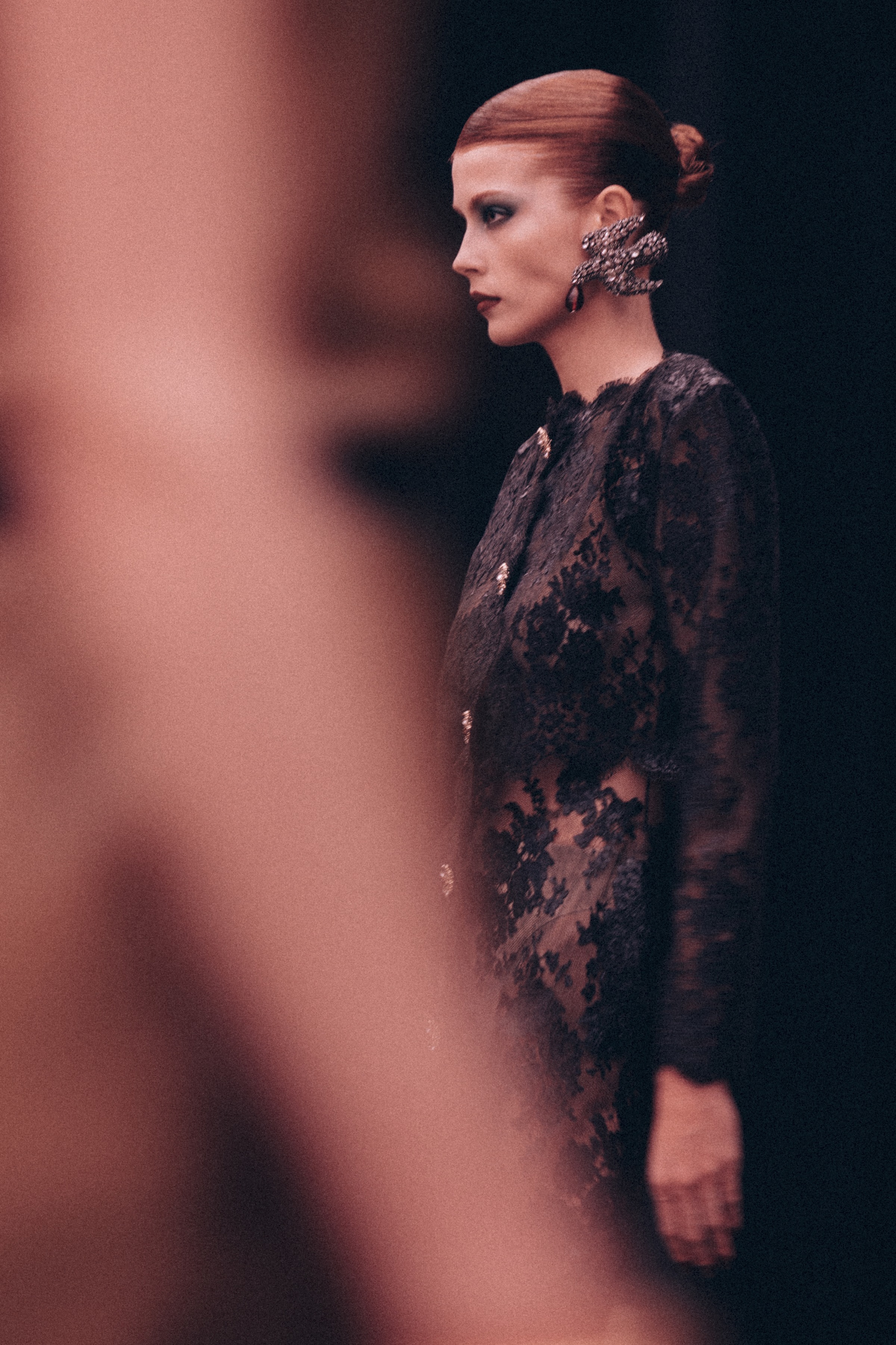 晚装部分大胆运用硅涂层轻薄蕾丝:蕾丝宛如精裁面料般挺括有型,西装则流淌着柔软灵动的魅力——传统范式在此反转,脆弱蜕变为力量,型格之间展露风情。