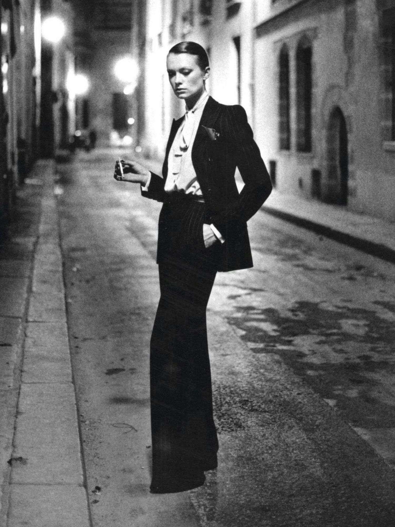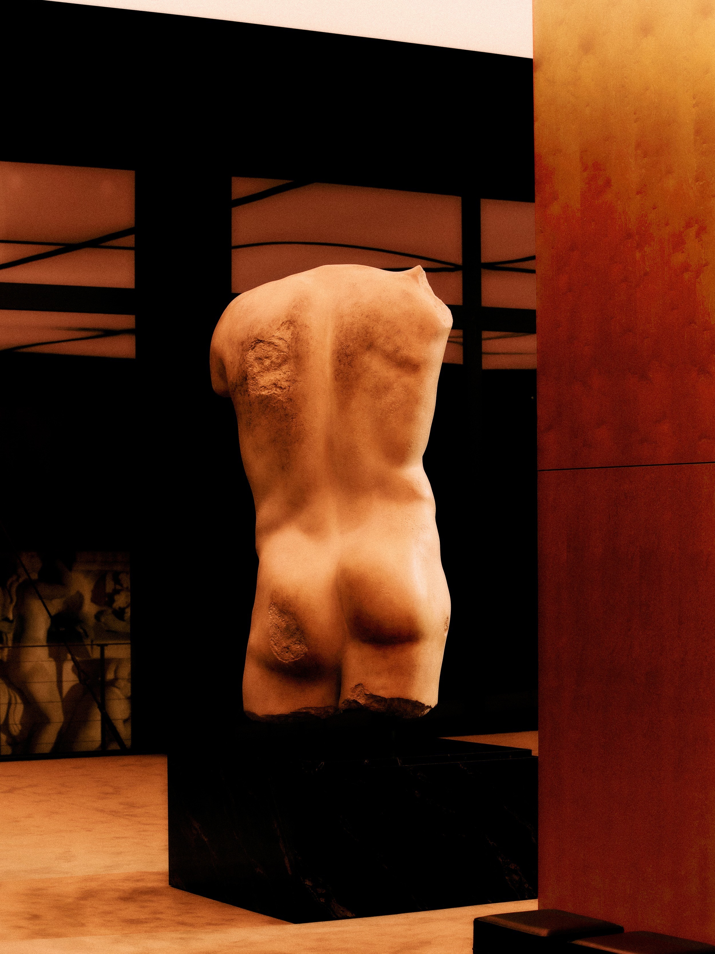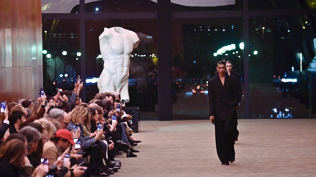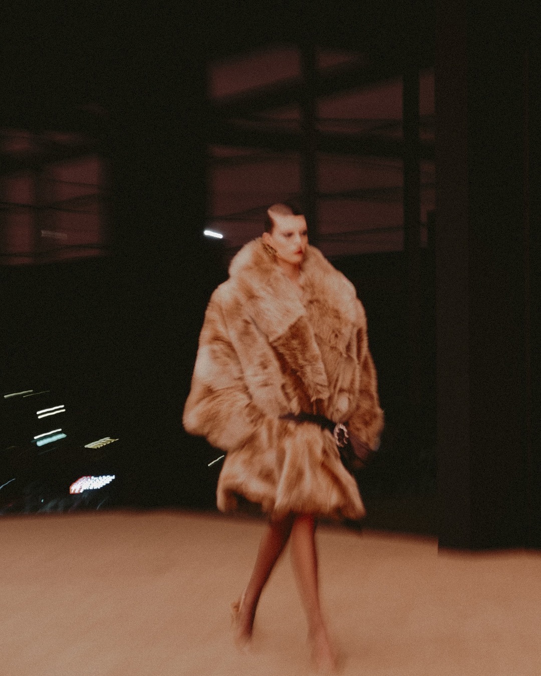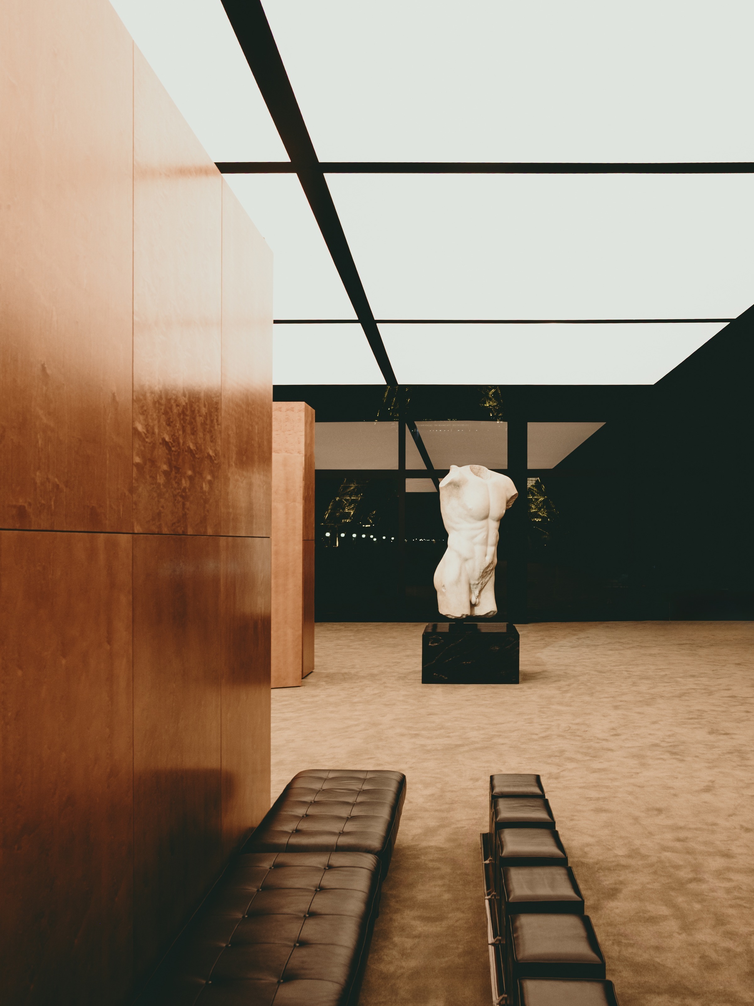为烘托电影氛围感,Vaccarello 打造现代主义极简场景:通透的玻璃、木质与皮革构筑的私密寓所,巨型复刻雕像伫立秀场中央——原作曾陈列于品牌创始人 Yves Saint Laurent 先生的私人住所。透过玻璃幕墙埃菲尔铁塔隐约可见,仿佛时刻提醒着观众「巴黎才是 Saint Laurent 永恒的故乡」。