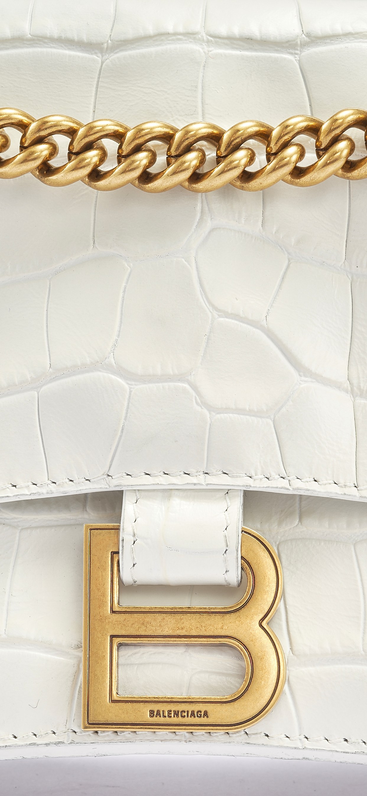 Balenciaga 春季23系列推出小号尺寸 Crush 肩背包,硬朗的包身线条和 Hourglass 如出一辙,最特别之处莫过于顶部提手幻化成金属链条肩带。