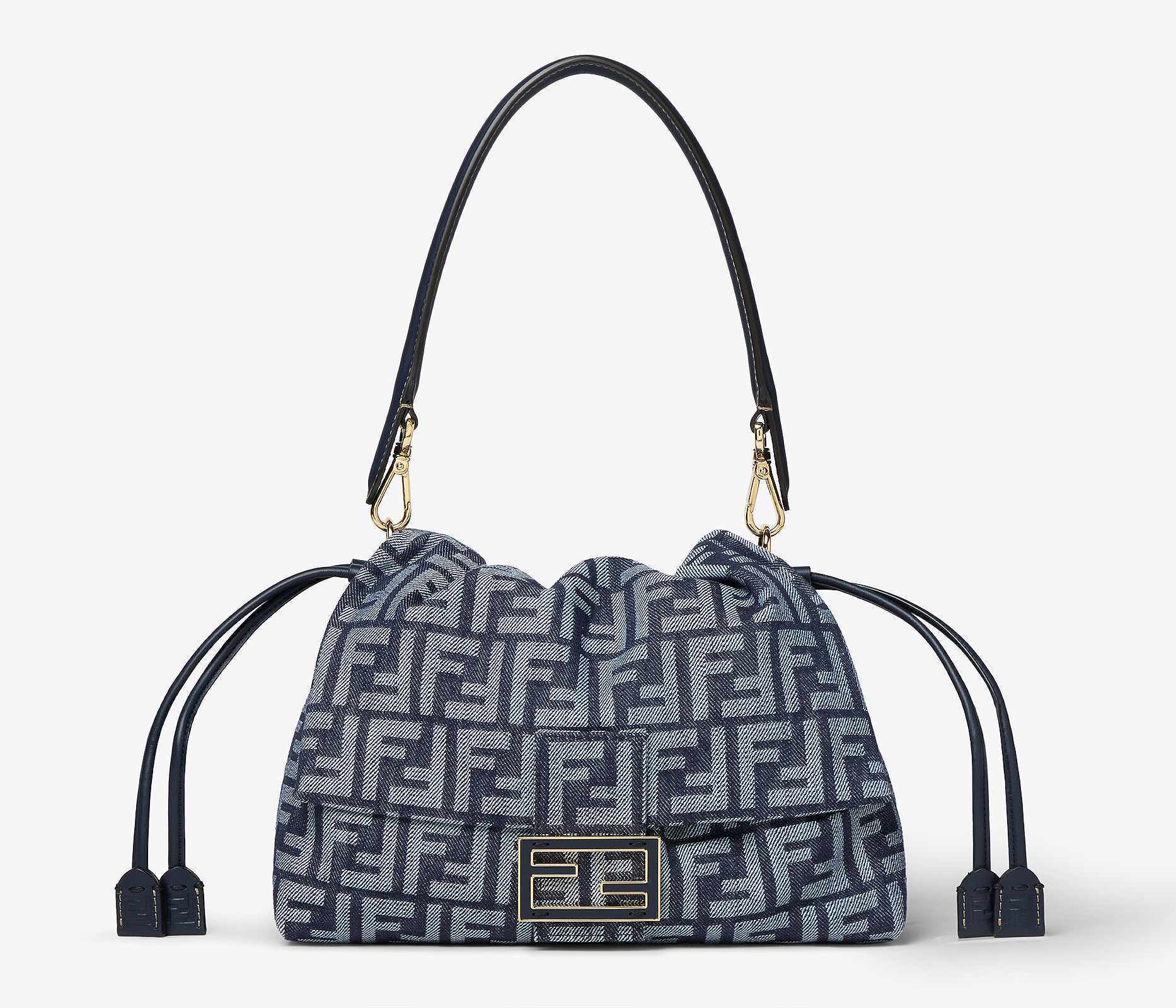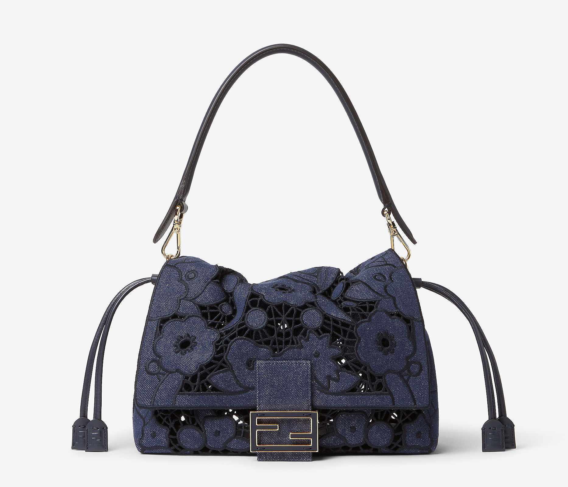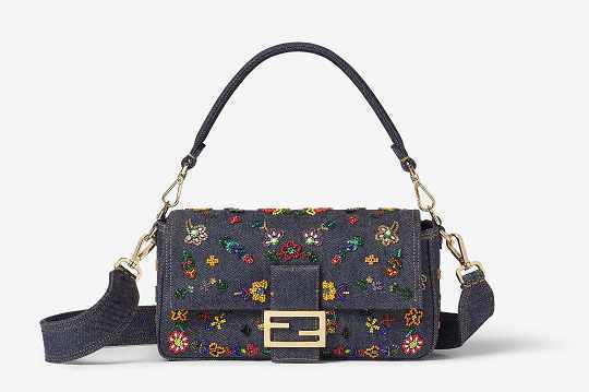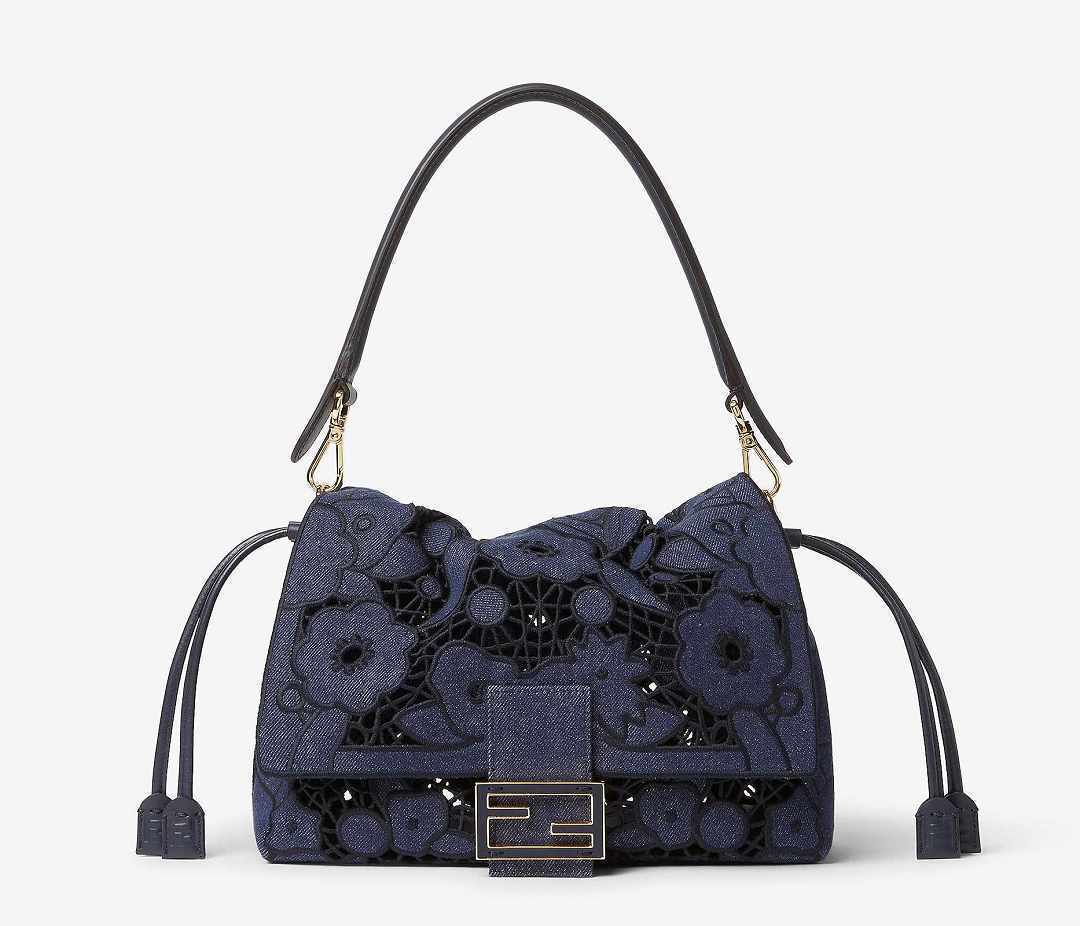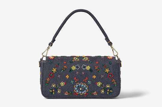 这组包包以深蓝色牛仔布为主要材质,通过镂空刺绣或串珠工艺在包身妆点浪漫花卉元素,或以纯色极简设计、FF提花布料登场,复古丹宁营造出轻松街头气息。