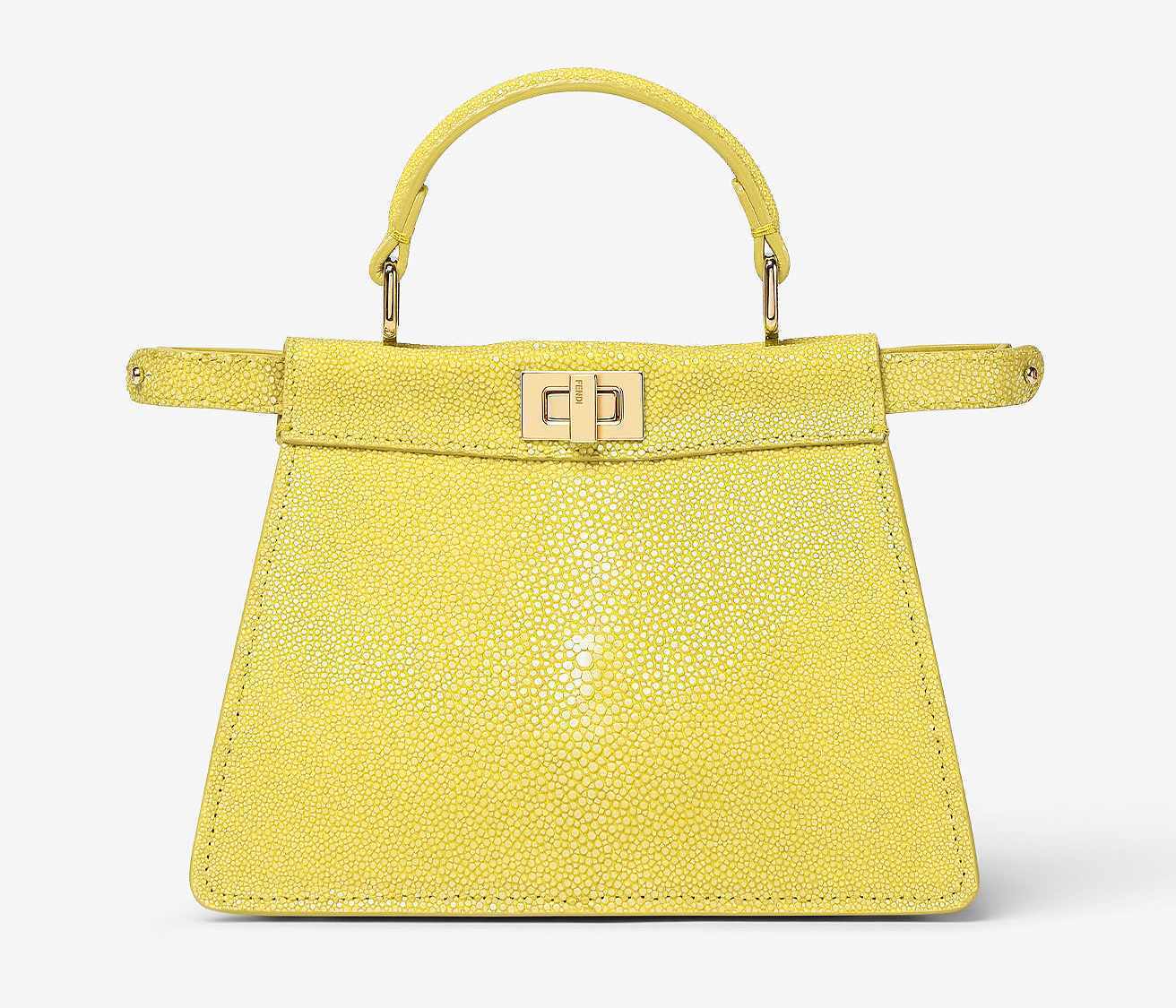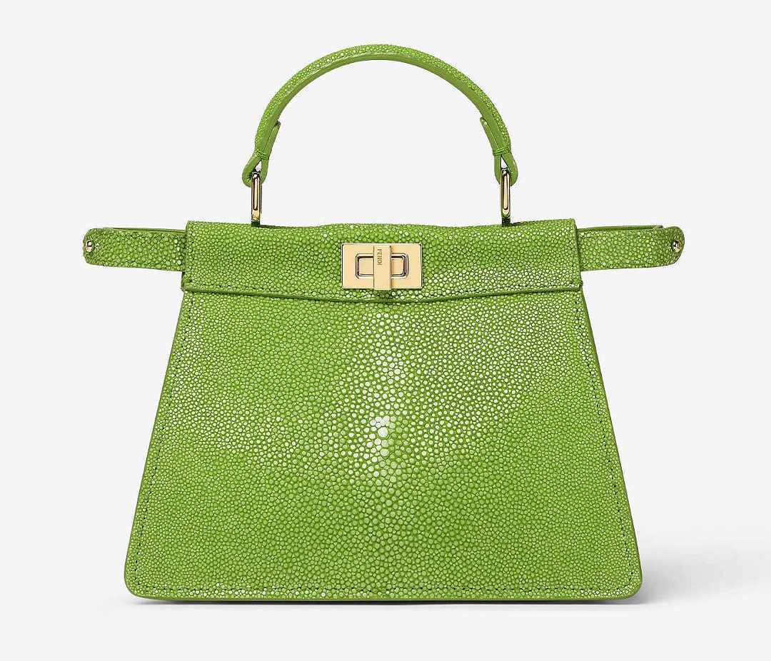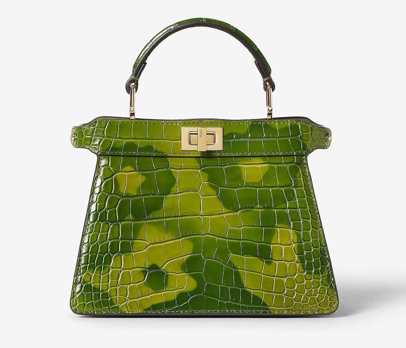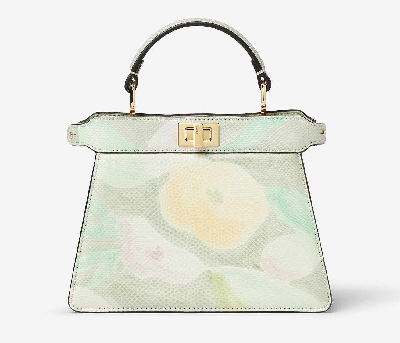 Peekaboo ISeeU Petite 手袋和 Baguette 迷你手袋采用富有光泽感的珍珠鱼皮制作而成,搭配青绿、日光黄、银莲花紫等清新糖果色调,为穿搭注入轻快活力。另一组 Peekaboo ISeeU Petite 手袋在蟒蛇皮鳄鱼皮上渲染水彩花卉图腾,营造出浪漫意境。