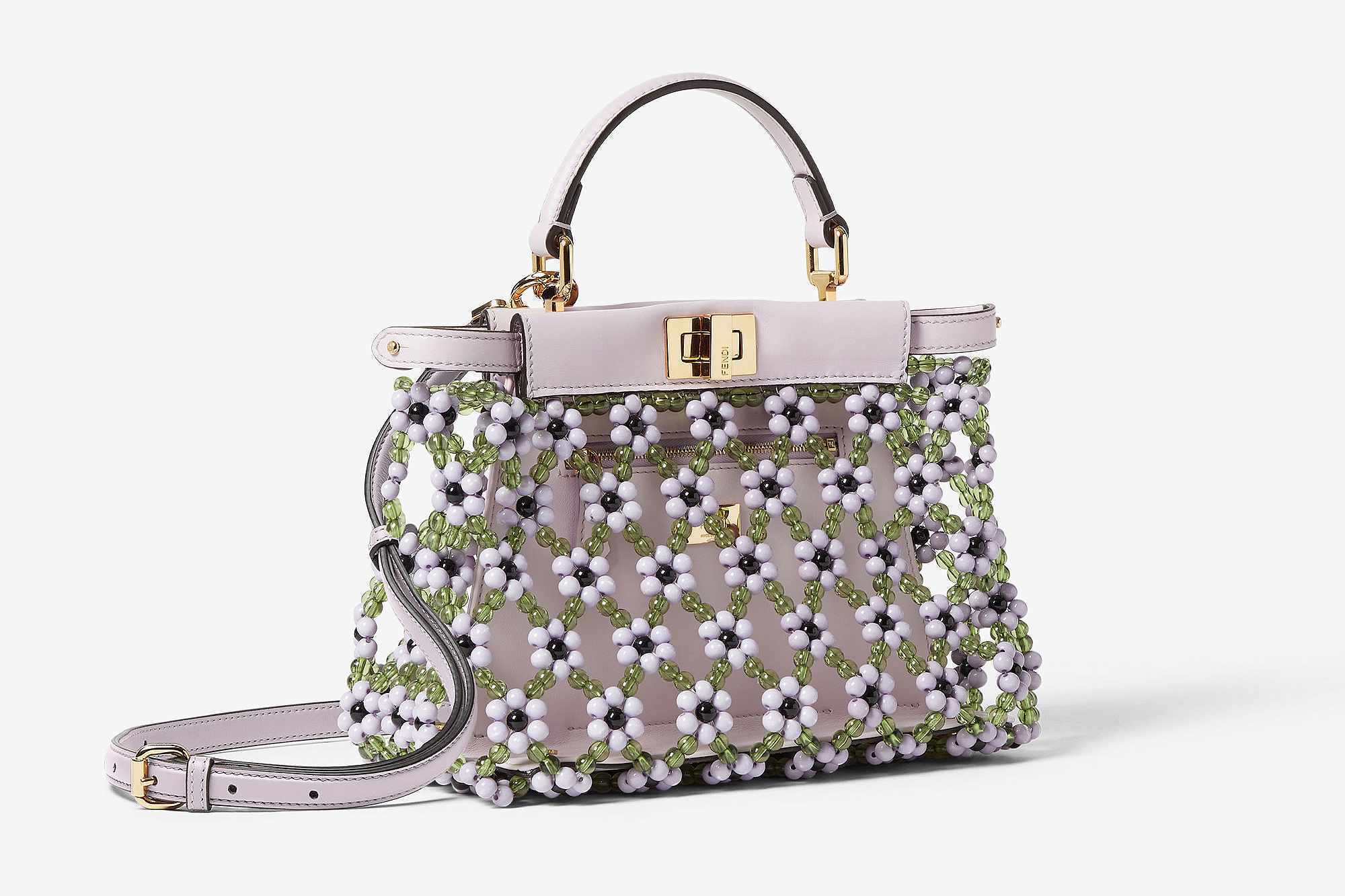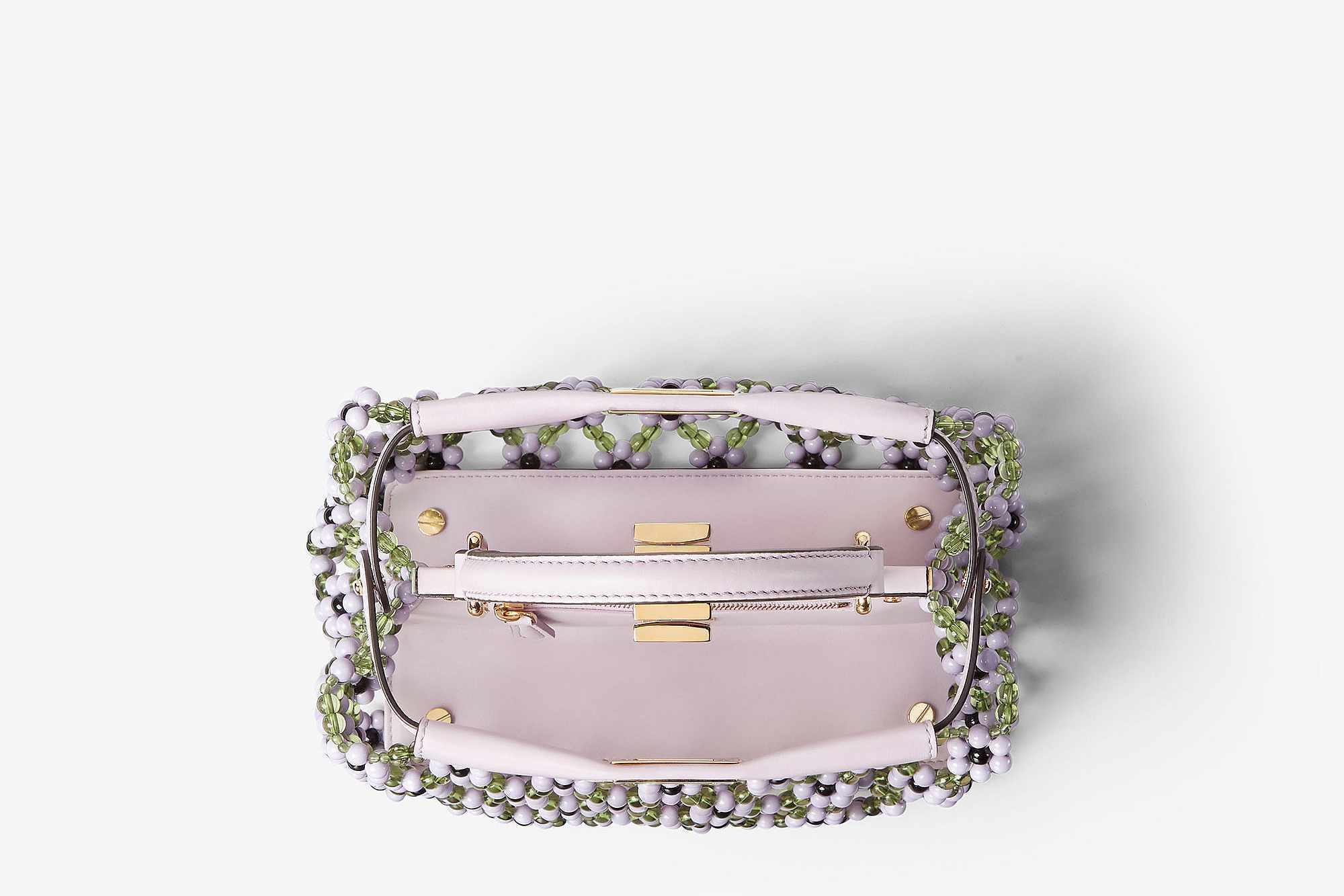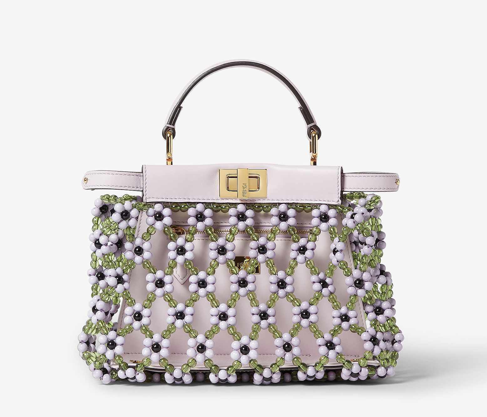 这组 Peekaboo 和 Baguette 手袋采用淡紫色、绿色、黑色和白色ABS树脂珍珠手工串制而成,打造出灵动而浪漫的镂空花卉图腾,搭配同色系皮革饰边和内袋,散发轻快活泼的假日气息。