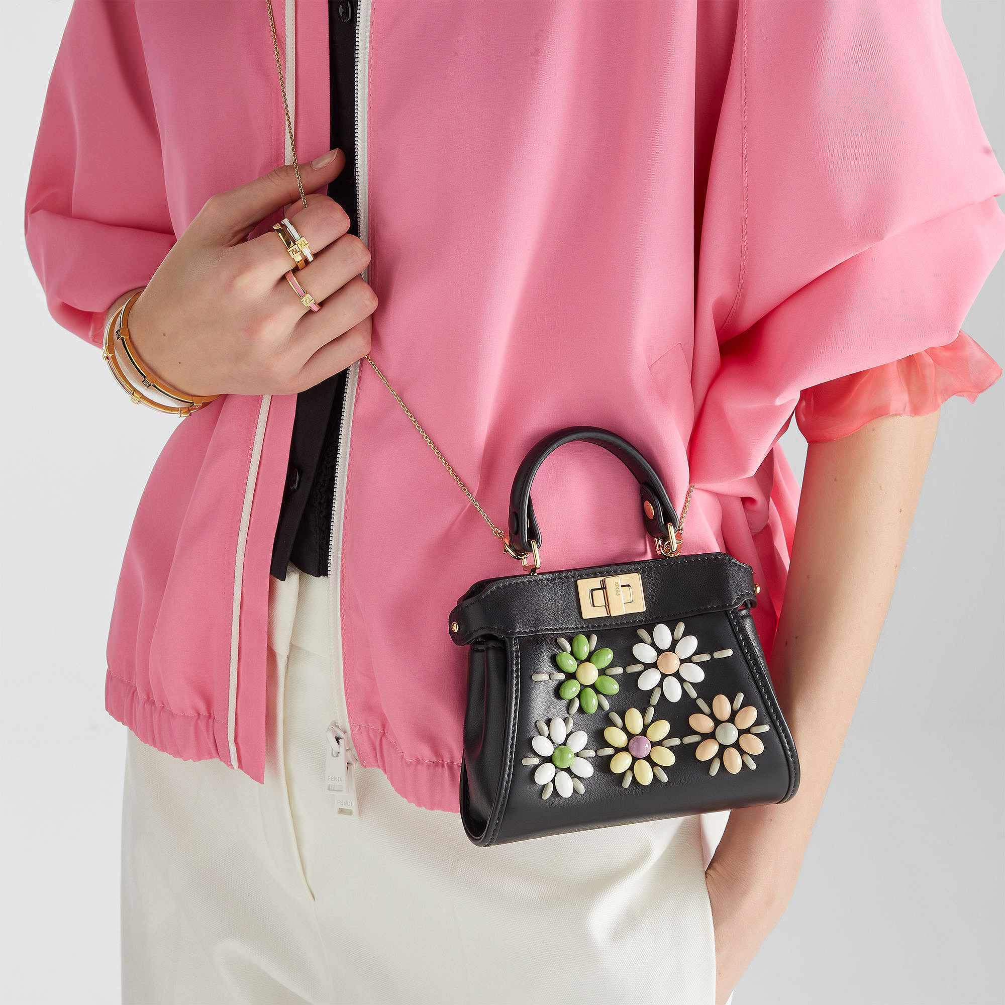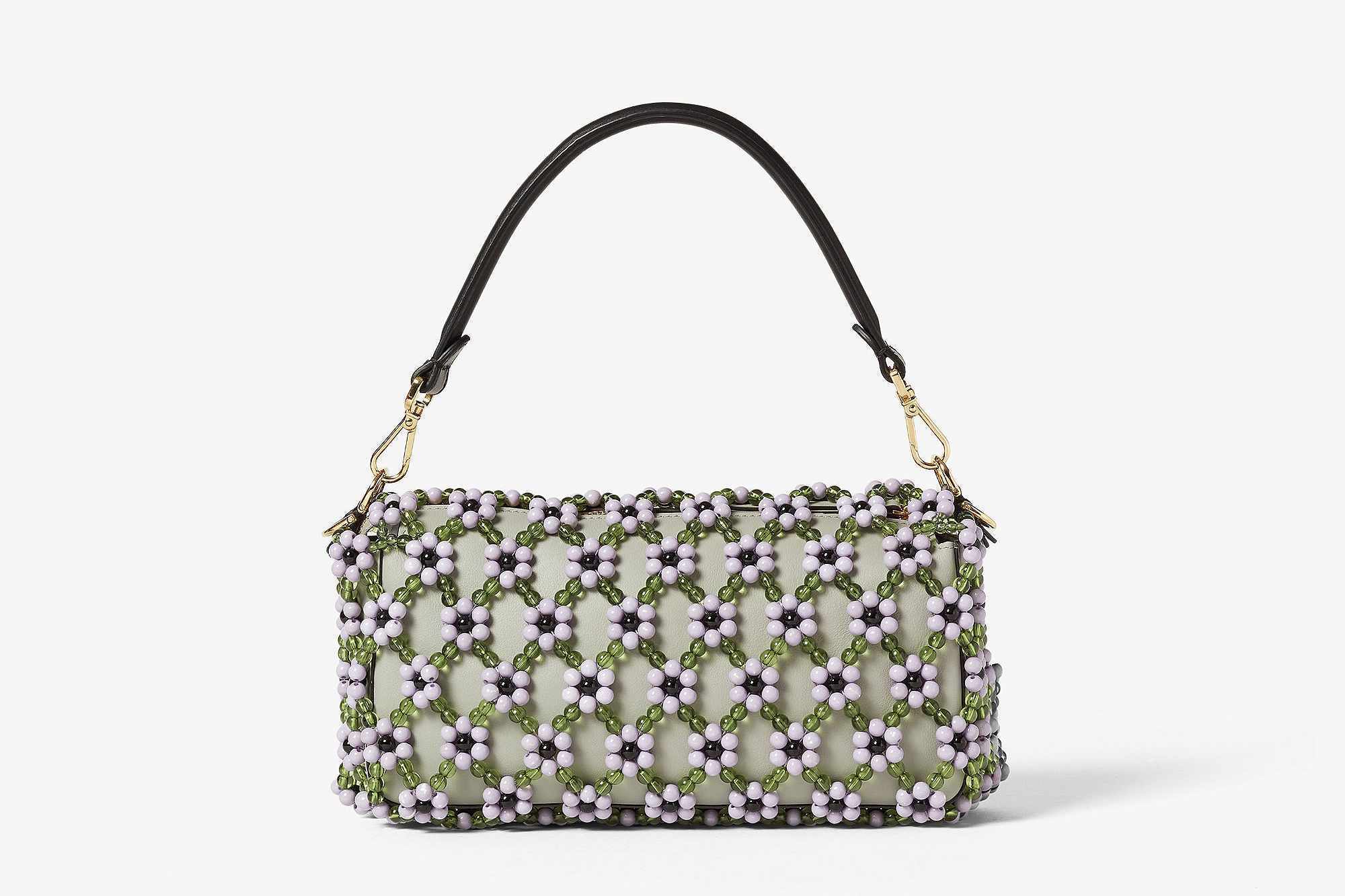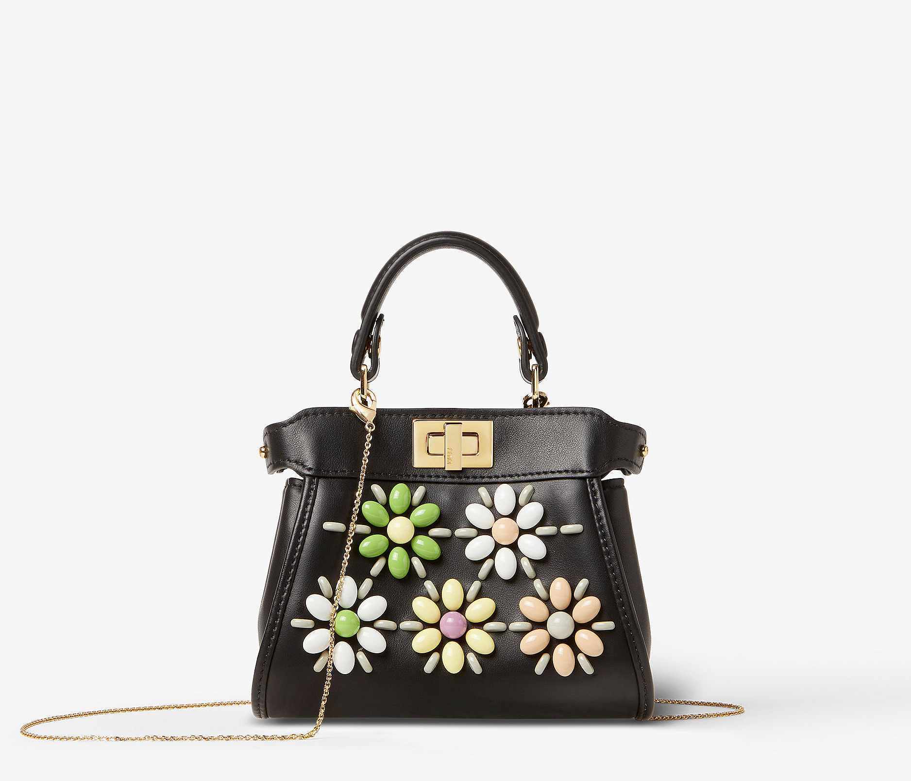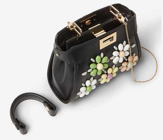 这组 Peekaboo 和 Baguette 手袋采用淡紫色、绿色、黑色和白色ABS树脂珍珠手工串制而成,打造出灵动而浪漫的镂空花卉图腾,搭配同色系皮革饰边和内袋,散发轻快活泼的假日气息。