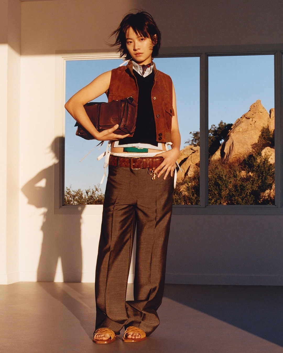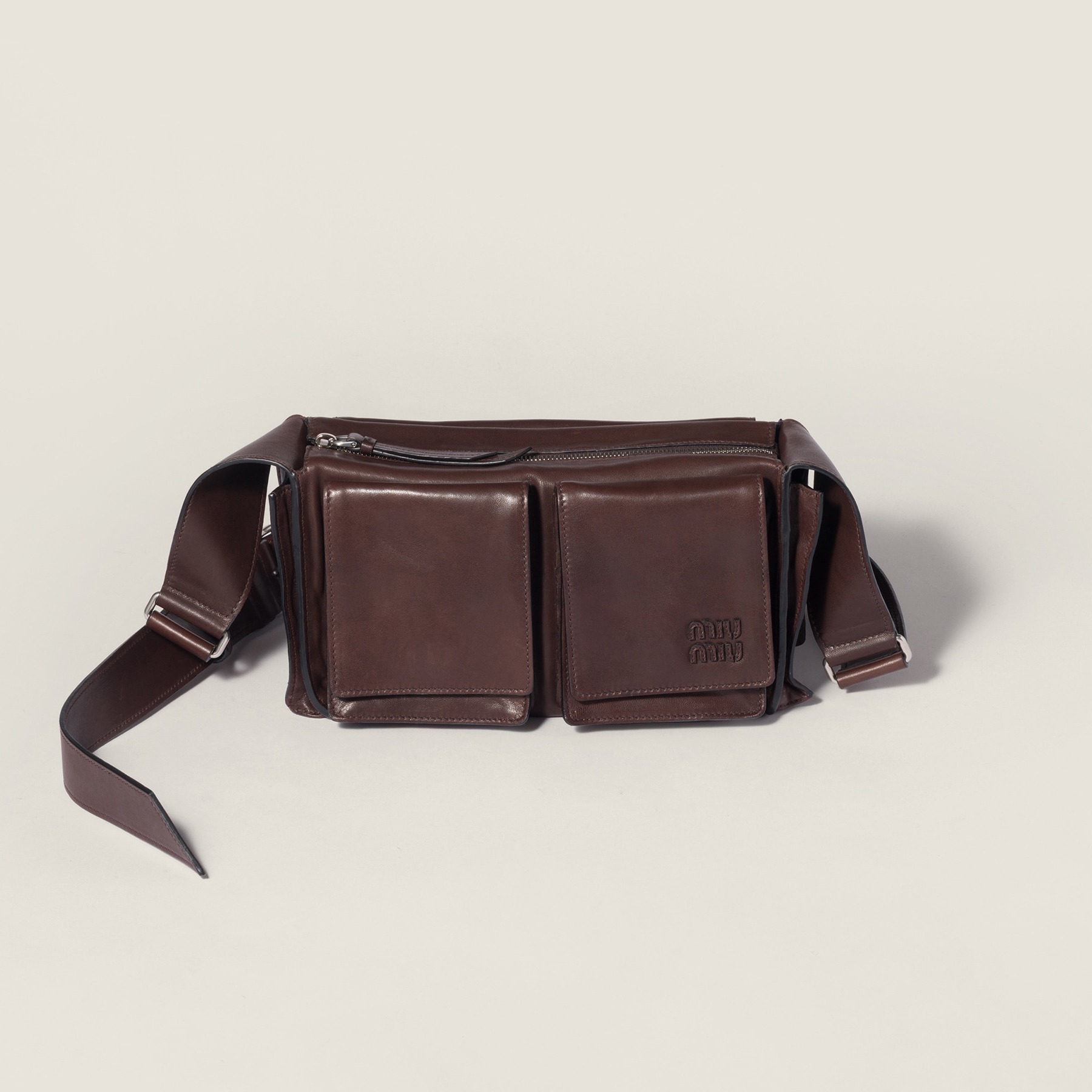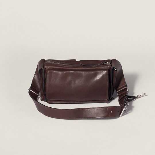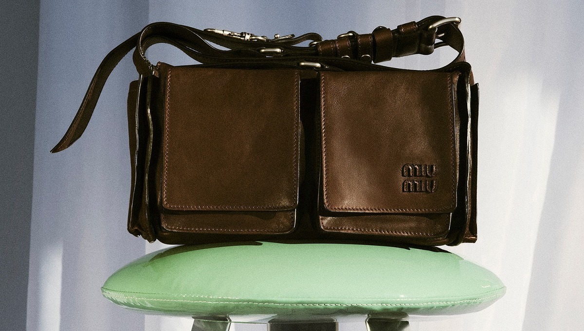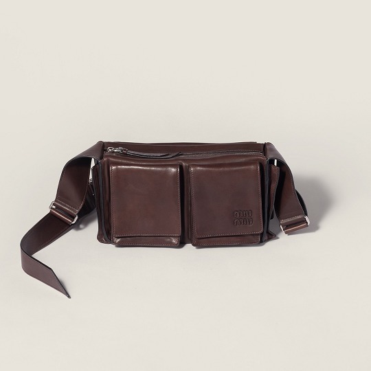 Miu Miu 2026春夏系列推出新款 Utilitaire 手袋,以极简设计重新诠释经典工具包廓形。包包采用赭褐色纳帕牛皮革制作而成,经过鞣制染色处理呈现复古仿旧效果,搭配硬朗帅气的工装口袋和银色五金饰件,展现甜美与叛逆并存的 Miu Miu 女孩特质。