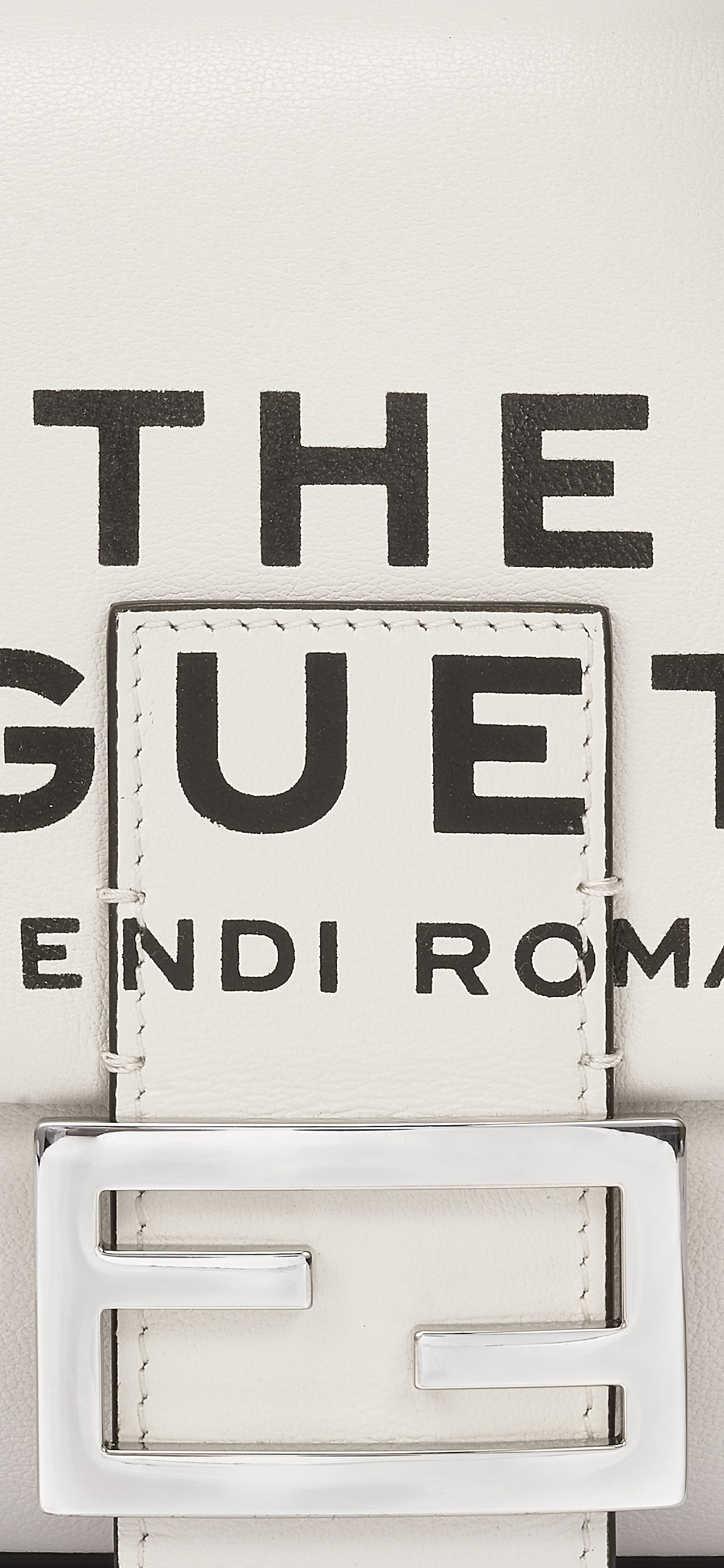 本次胶囊系列以醒目黑白撞色呈现——采用白色小牛皮为背景,黑色油边如马克笔般勾勒轮廓。中央印有「THE BAGUETTE FENDI Roma」黑色字母徽标,直白又充满视觉冲击力。