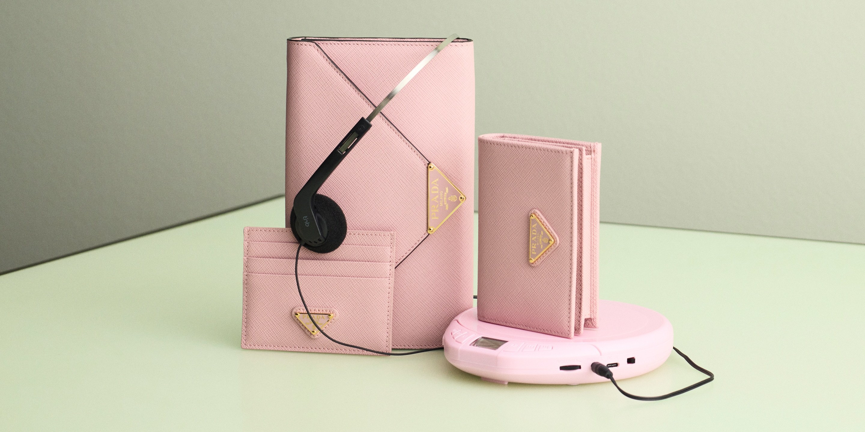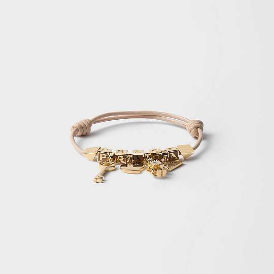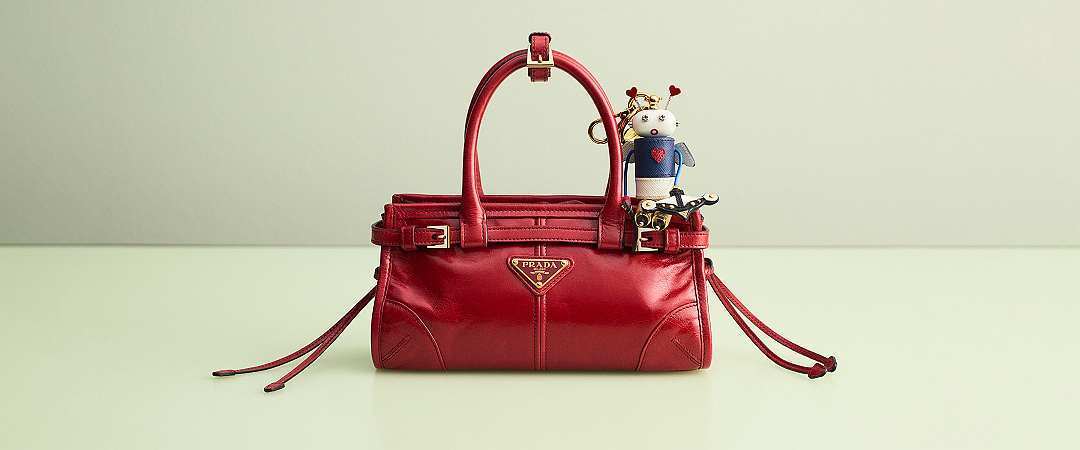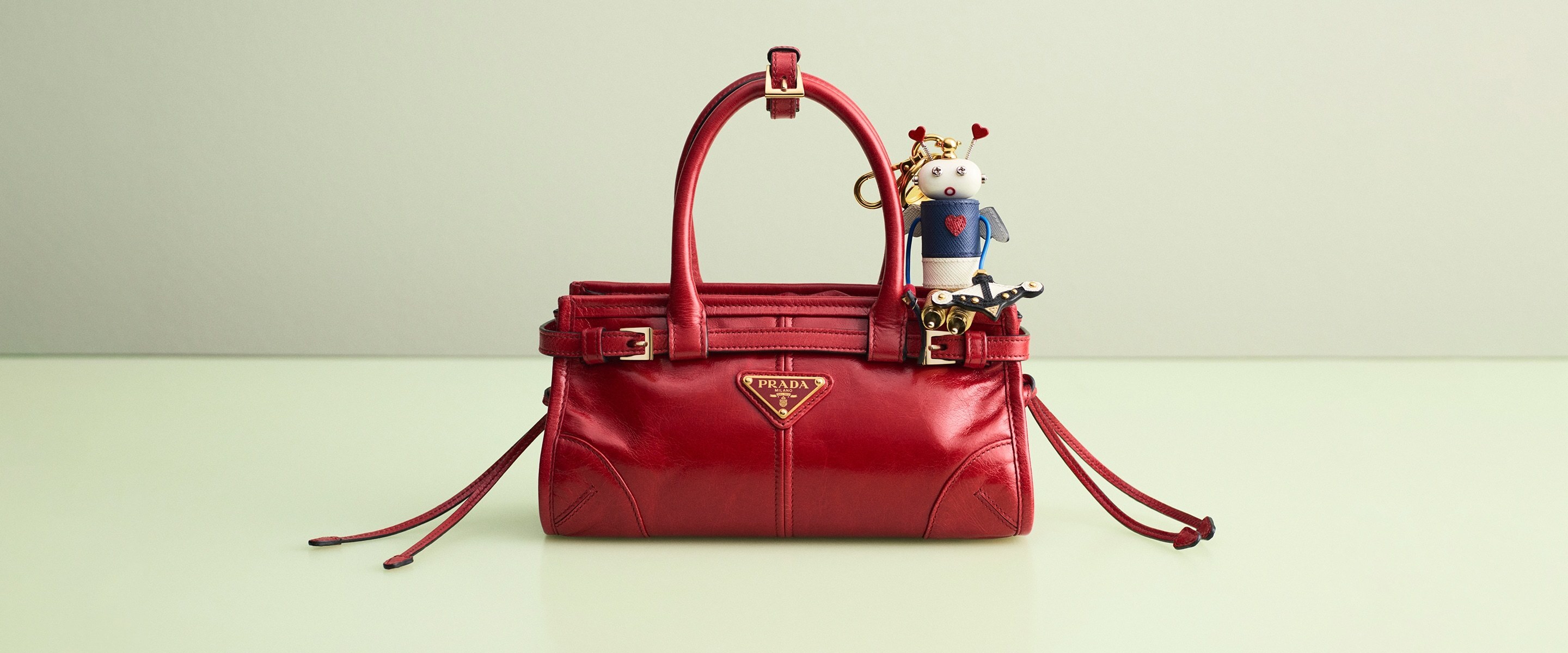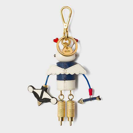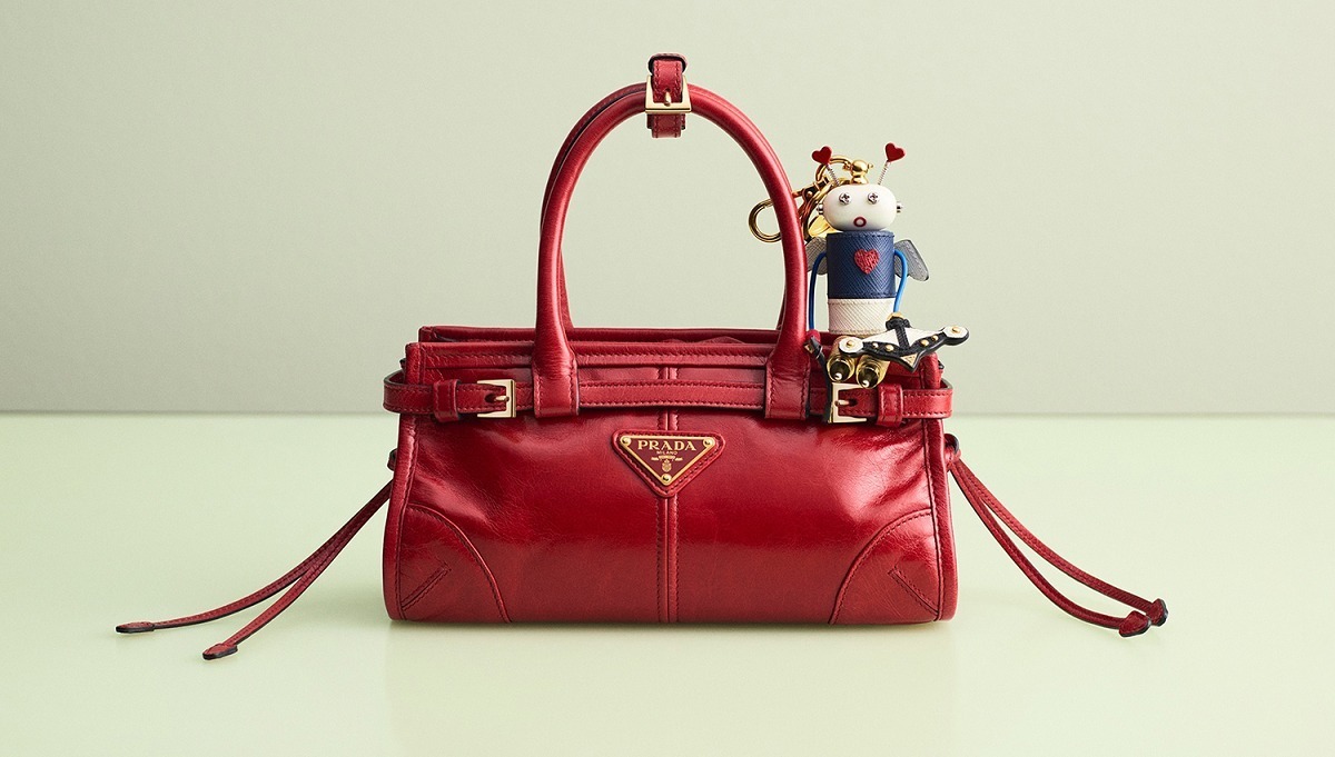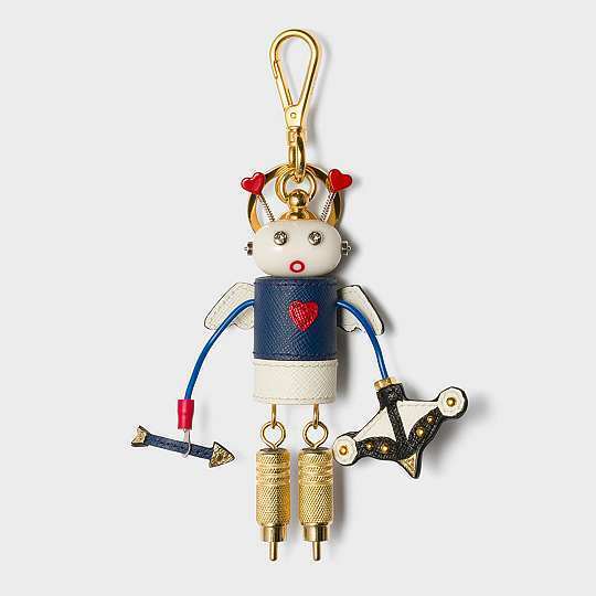 链带钱包、卡夹等小皮具采用粉色 Saffiano 十字纹皮革制作而成,点缀品牌标志性珐琅三角形徽标,温柔色调特别适合情人节约会。饰有爱心、钥匙和机器人吊坠的手环适合配成情侣单品作为告白礼物,大胆表达浪漫爱意。