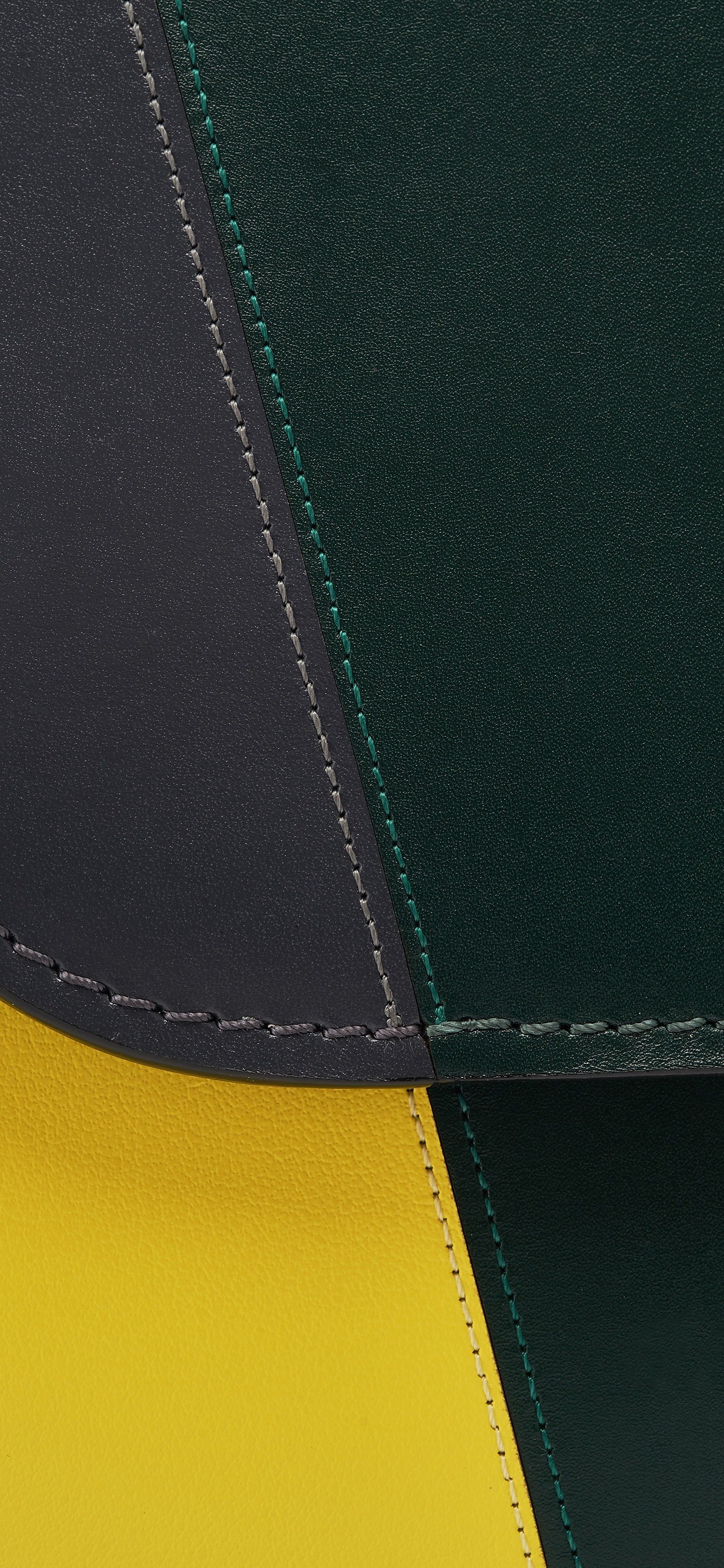 包包的拼色设计非常精妙,包身以低饱和度的墨绿色为底,如同静谧沉睡的森林;翻盖一角拼接藏蓝色细节,仿佛透过树梢望到的夜空;柠檬黄色则是逐渐明朗的晨曦。