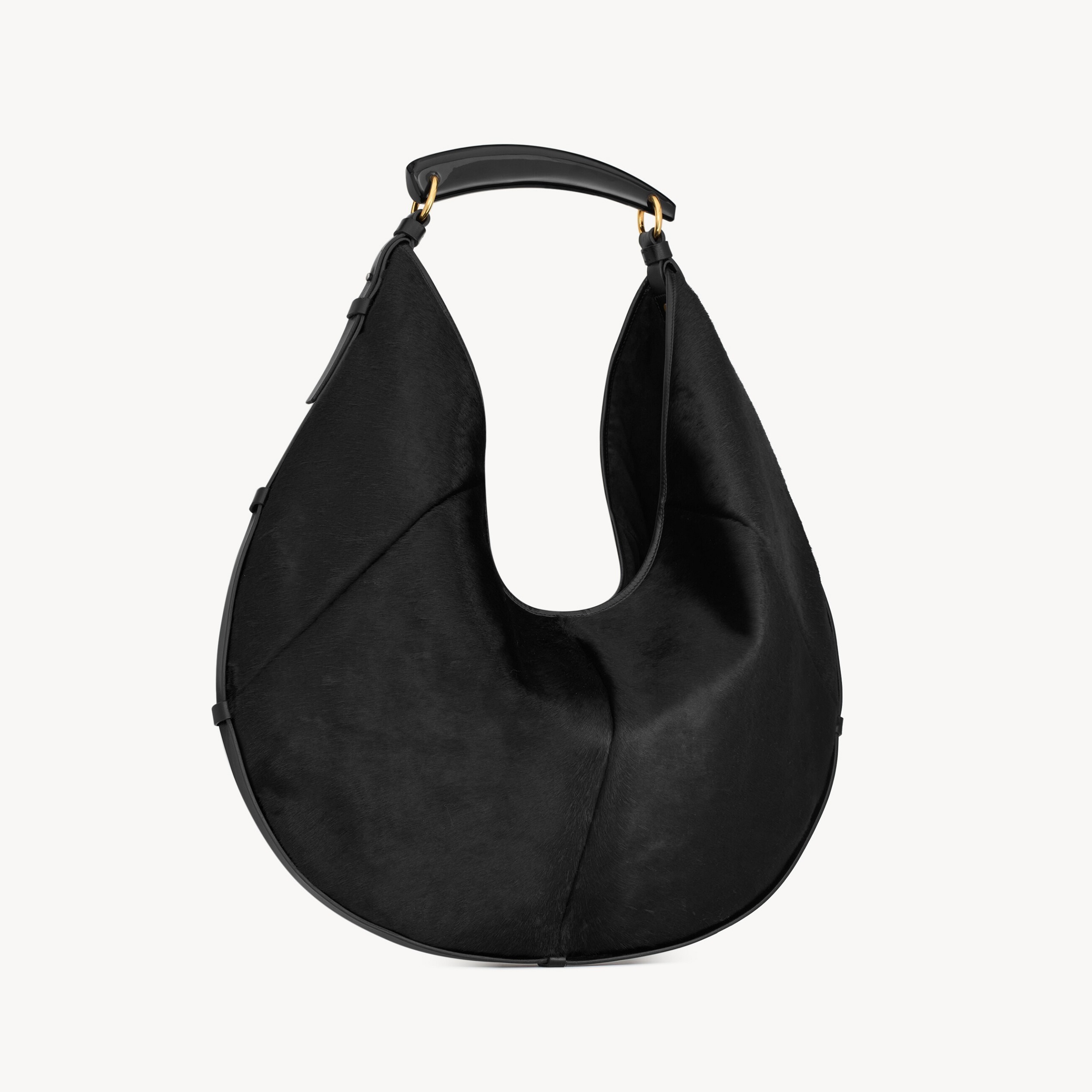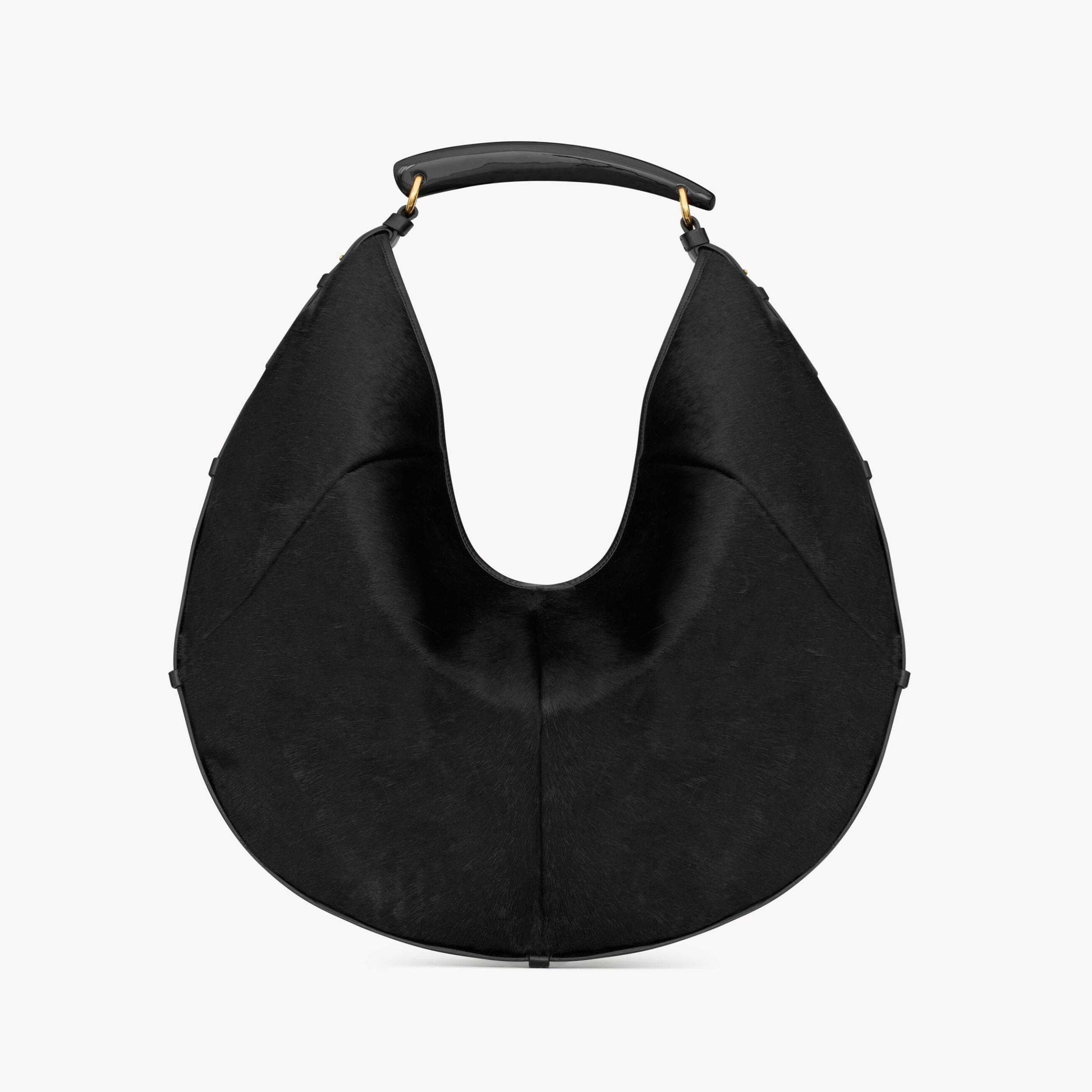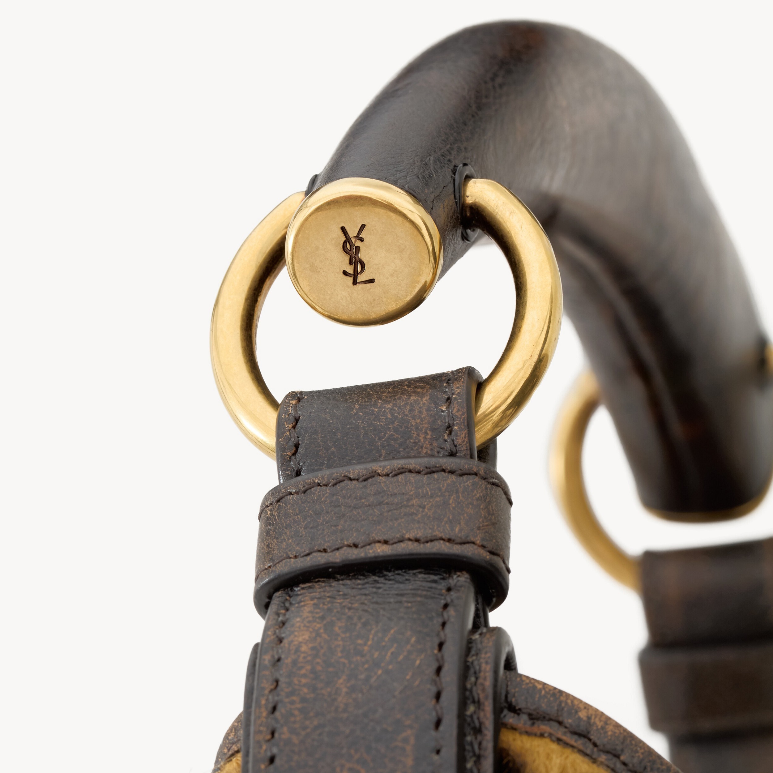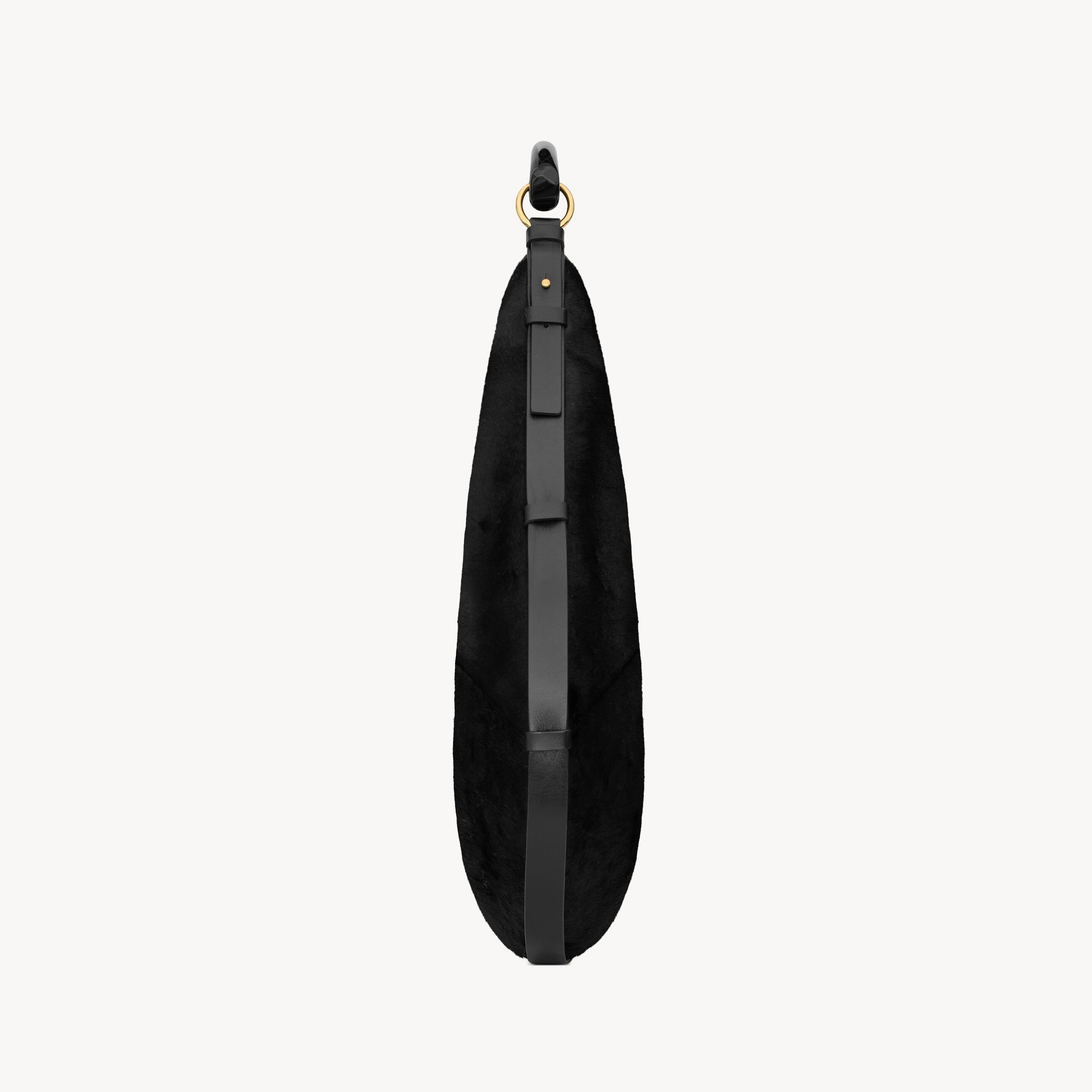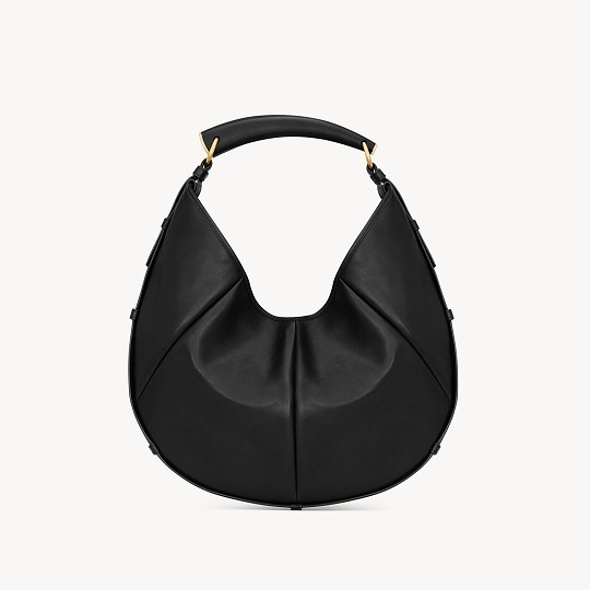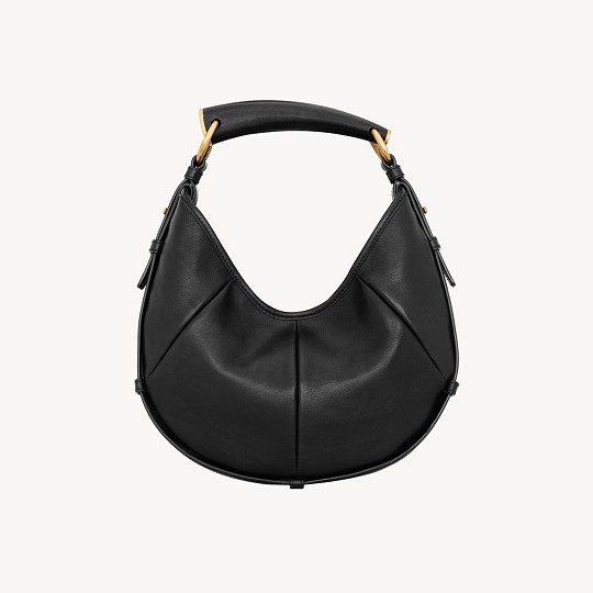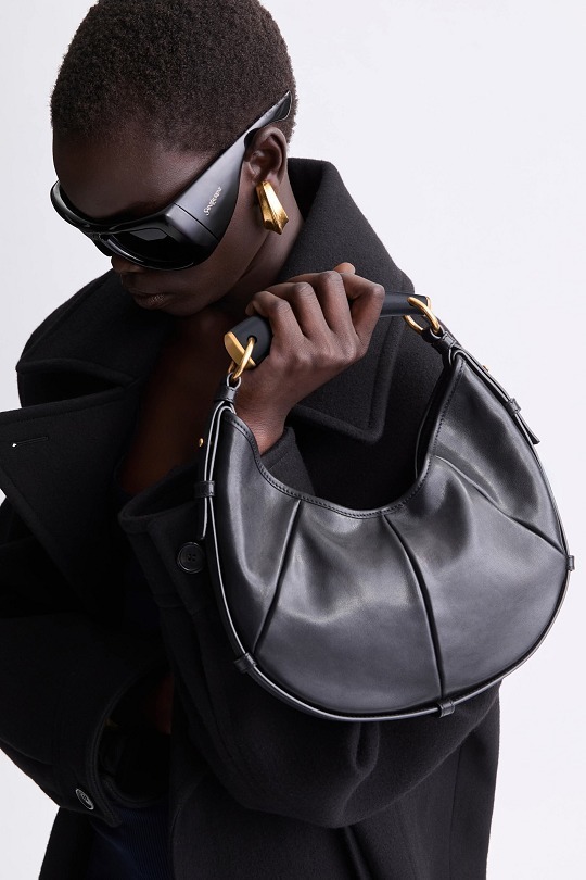大号 Mombasa 手袋推出黑色和檀木色小牛皮款,搭配同色系麂皮里衬和皮革包覆的黄铜手柄。另外还推出一款黑色马毛皮革款,搭配同色系小牛皮饰边和漆面水牛角手柄,自然流畅的线条和 oversized 廓形描摹自信凌厉的 YSL 女郎形象。