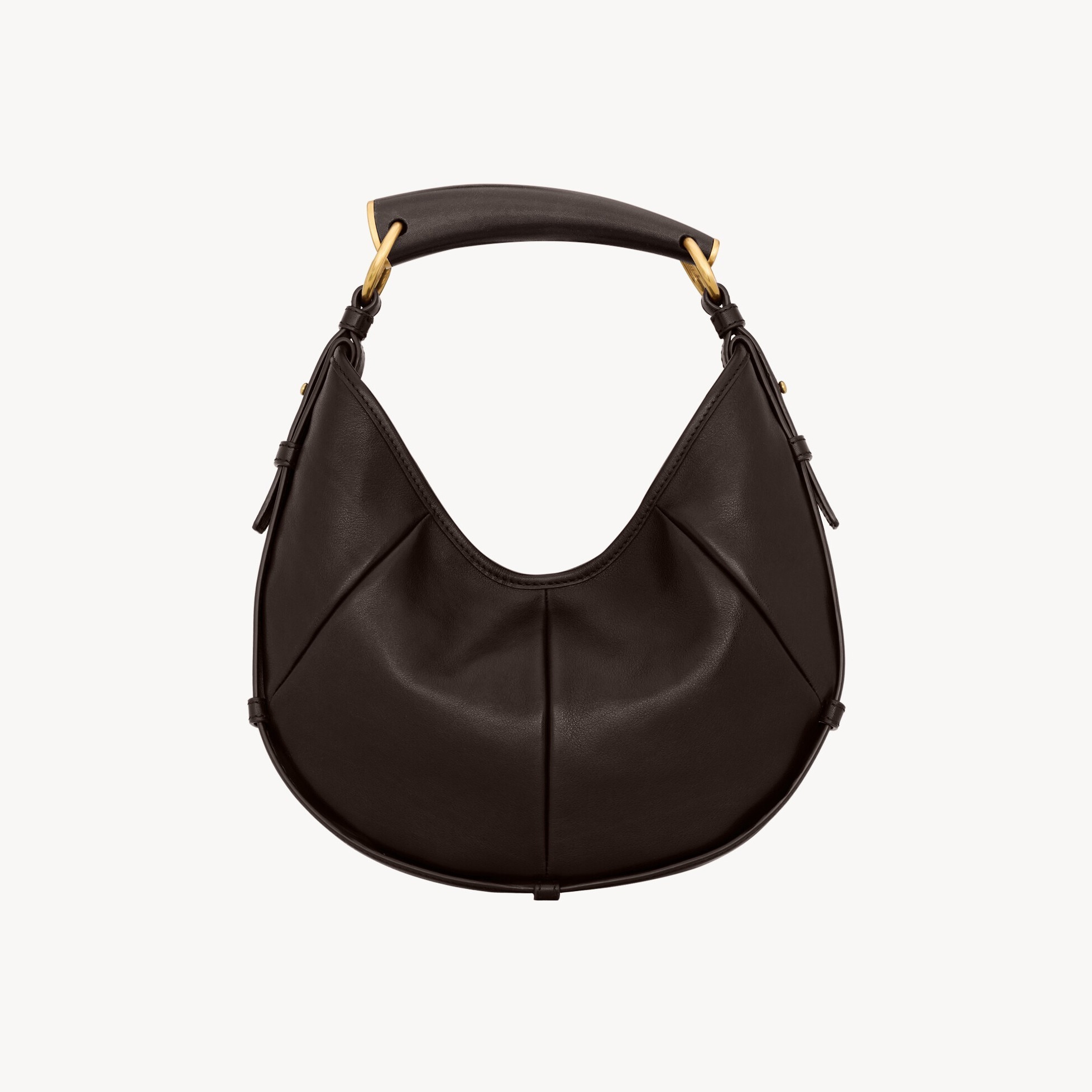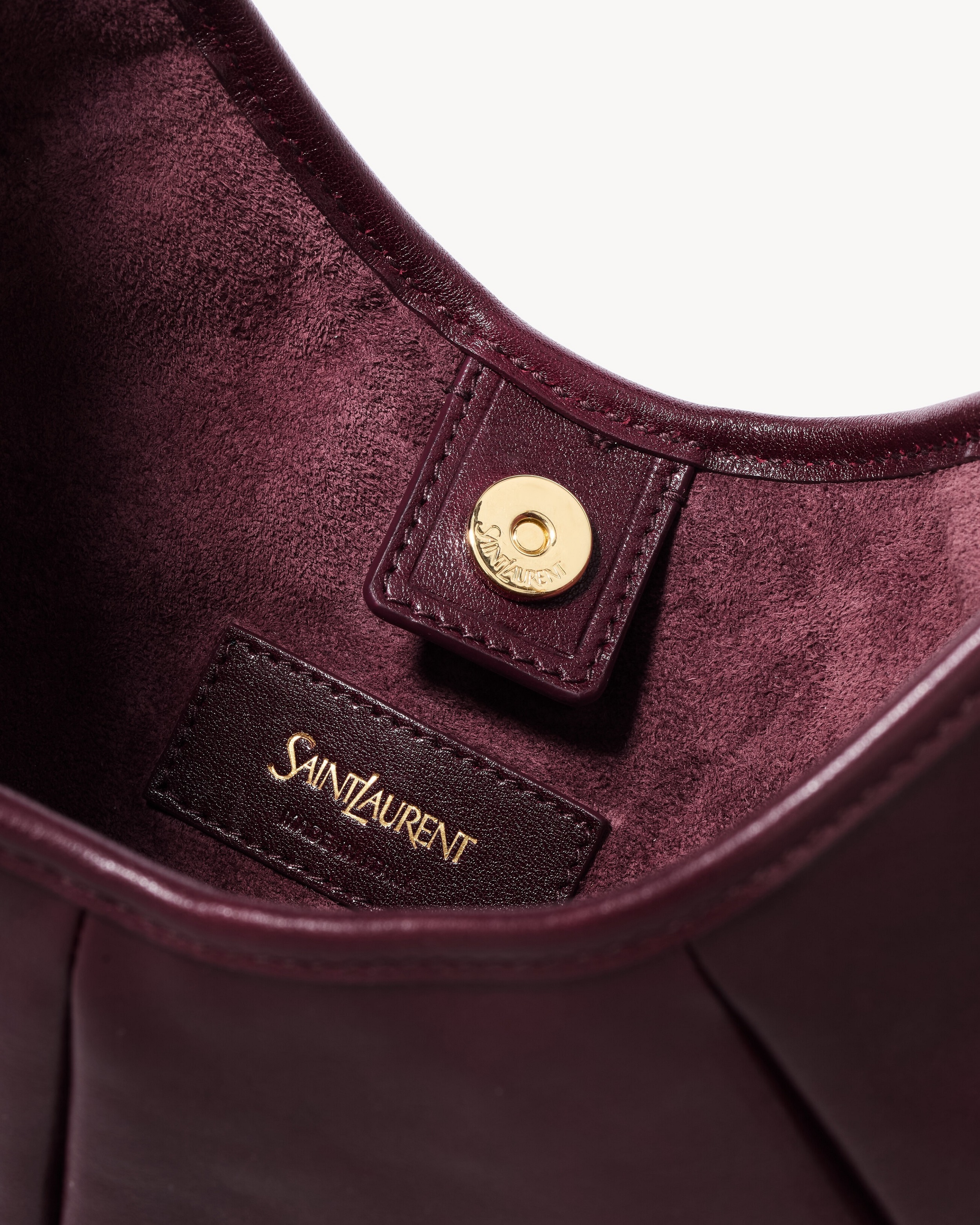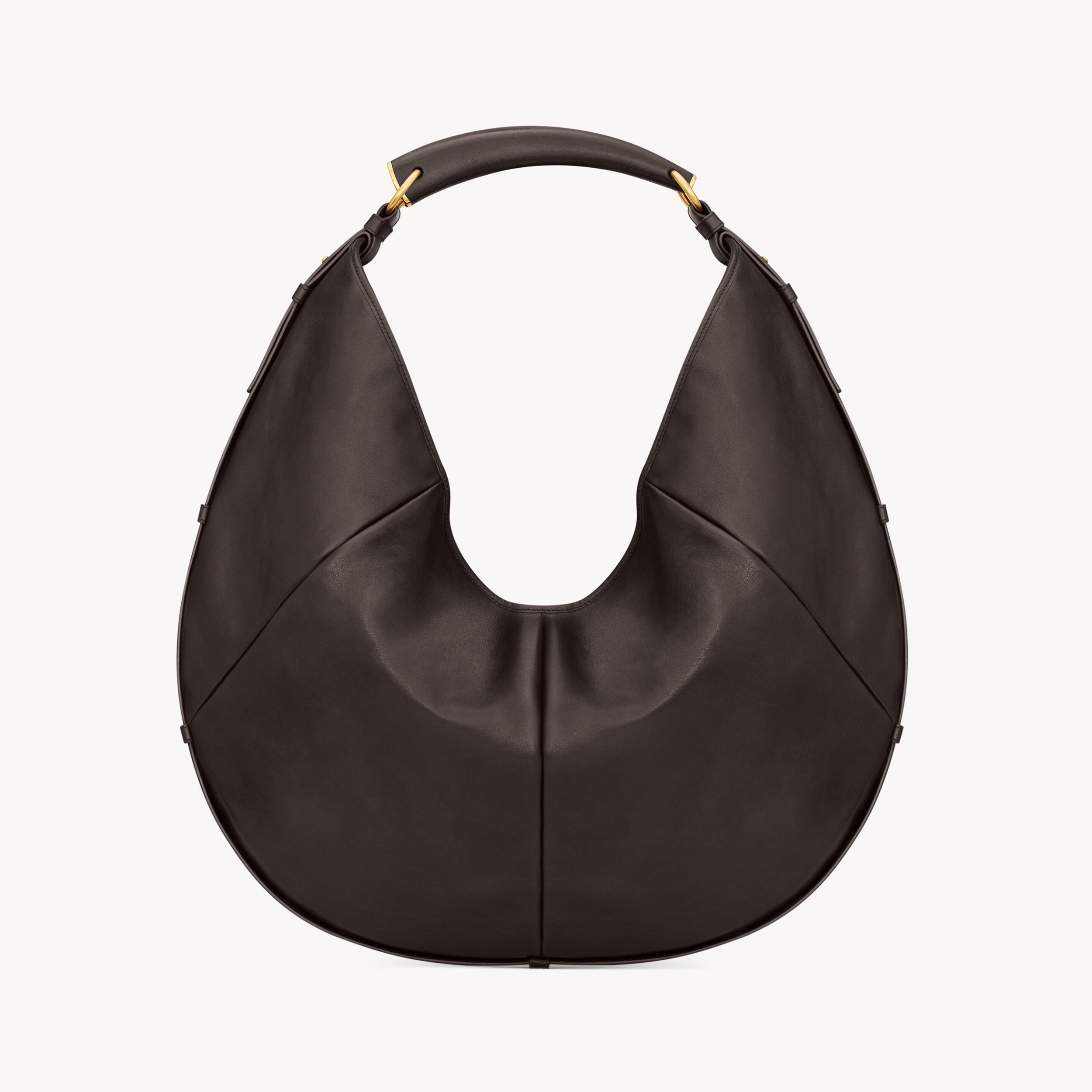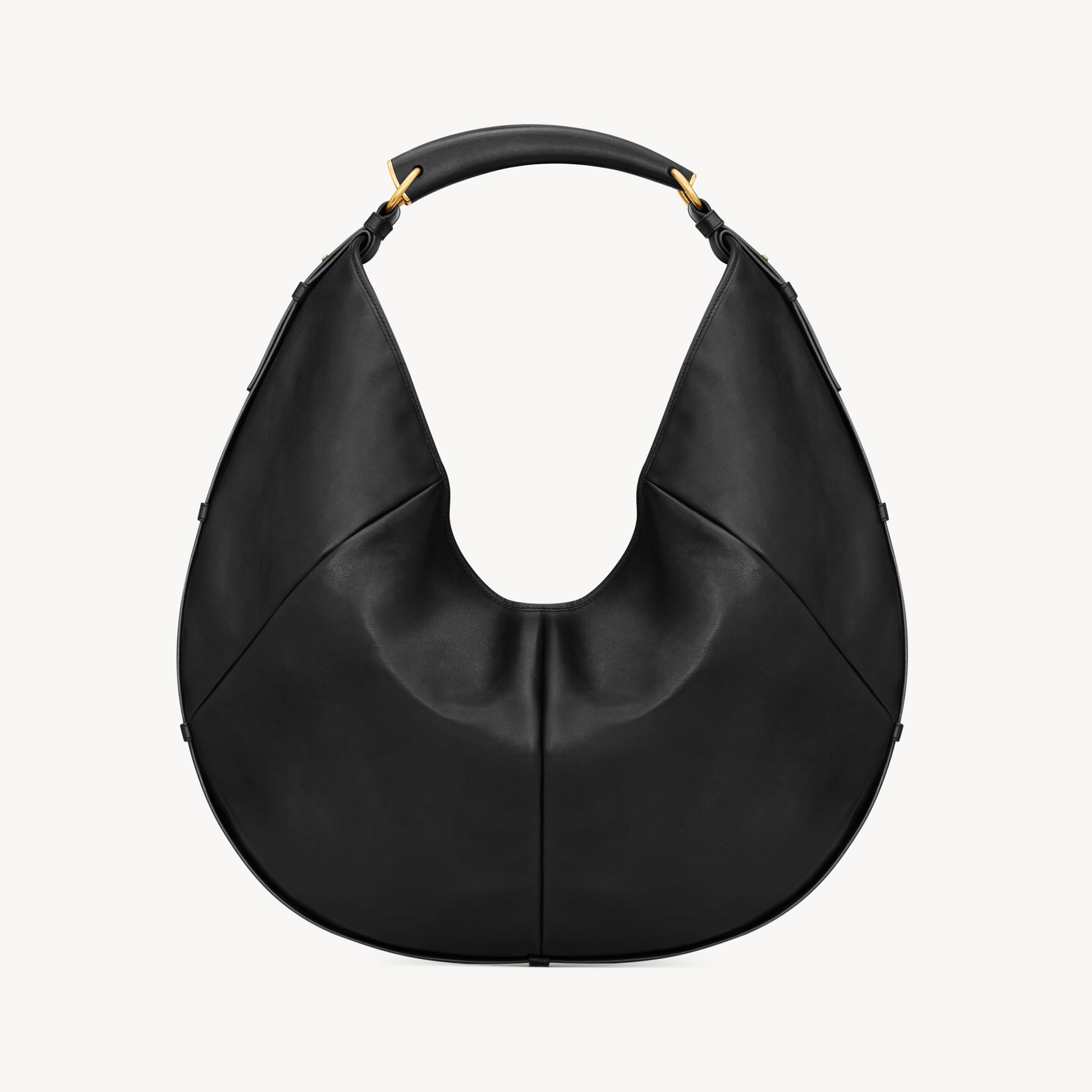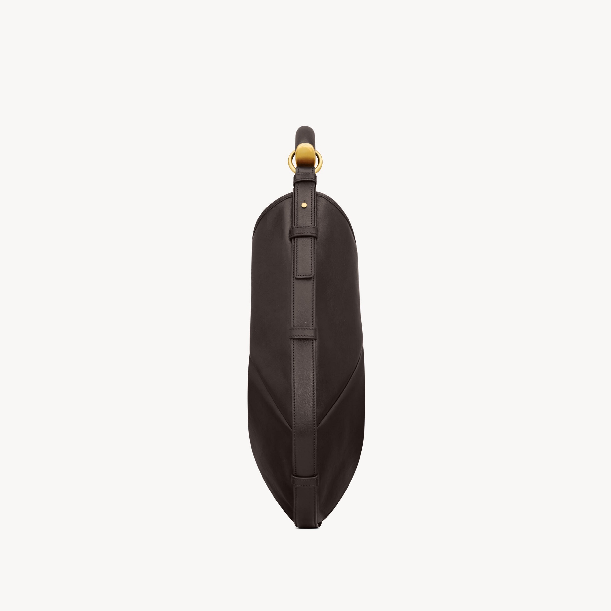 大号 Mombasa 手袋推出黑色和檀木色小牛皮款,搭配同色系麂皮里衬和皮革包覆的黄铜手柄。另外还推出一款黑色马毛皮革款,搭配同色系小牛皮饰边和漆面水牛角手柄,自然流畅的线条和 oversized 廓形描摹自信凌厉的 YSL 女郎形象。