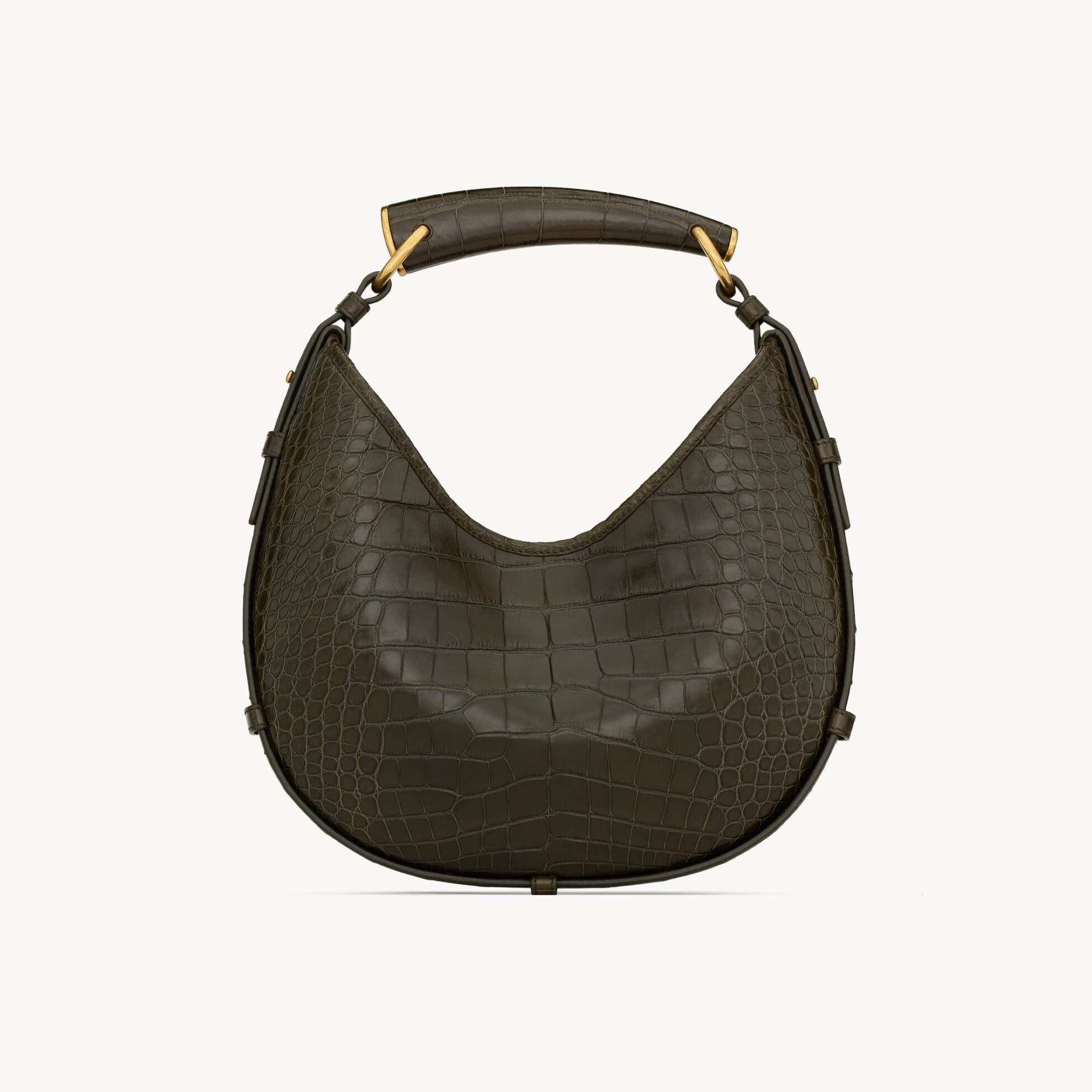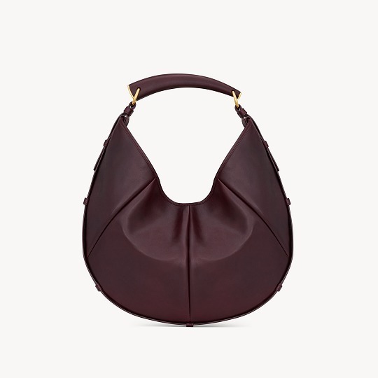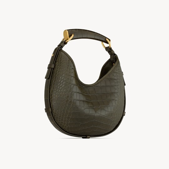 2026春夏新款 Mombasa 手袋以小号、中号、大号3种尺寸规格回归,延续柔软慵懒的新月形轮廓,同时加入细腻的比例调整。小号种最引人注意的是这只深月桂叶色鳄鱼皮 Mombasa 手袋,包包采用具有规则竹节纹路的短吻鳄鱼皮制作而成,搭配同色系鳄鱼皮包覆的黄铜牛角提手和麂皮里衬,磁扣开合提升安全指数。纯色小牛皮版本推出黑色、檀木色和赤霞朱红色3种颜色选择,深色低饱和色系契合包包的神秘野性气息。