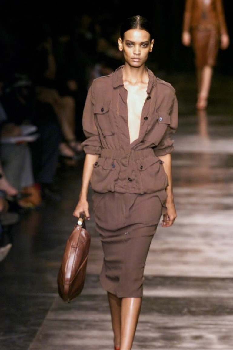 YSL Mombasa 手袋于2002春夏秀场首次亮相,由时任创意总监 Tom Ford 设计,包包以肯尼亚第二大城市、东非最大港口「蒙巴萨」的名字命名,最大亮点是水牛角造型的提手,灵感来自非洲狩猎文化和传统手工艺。YSL 2002春夏秀场及广告片