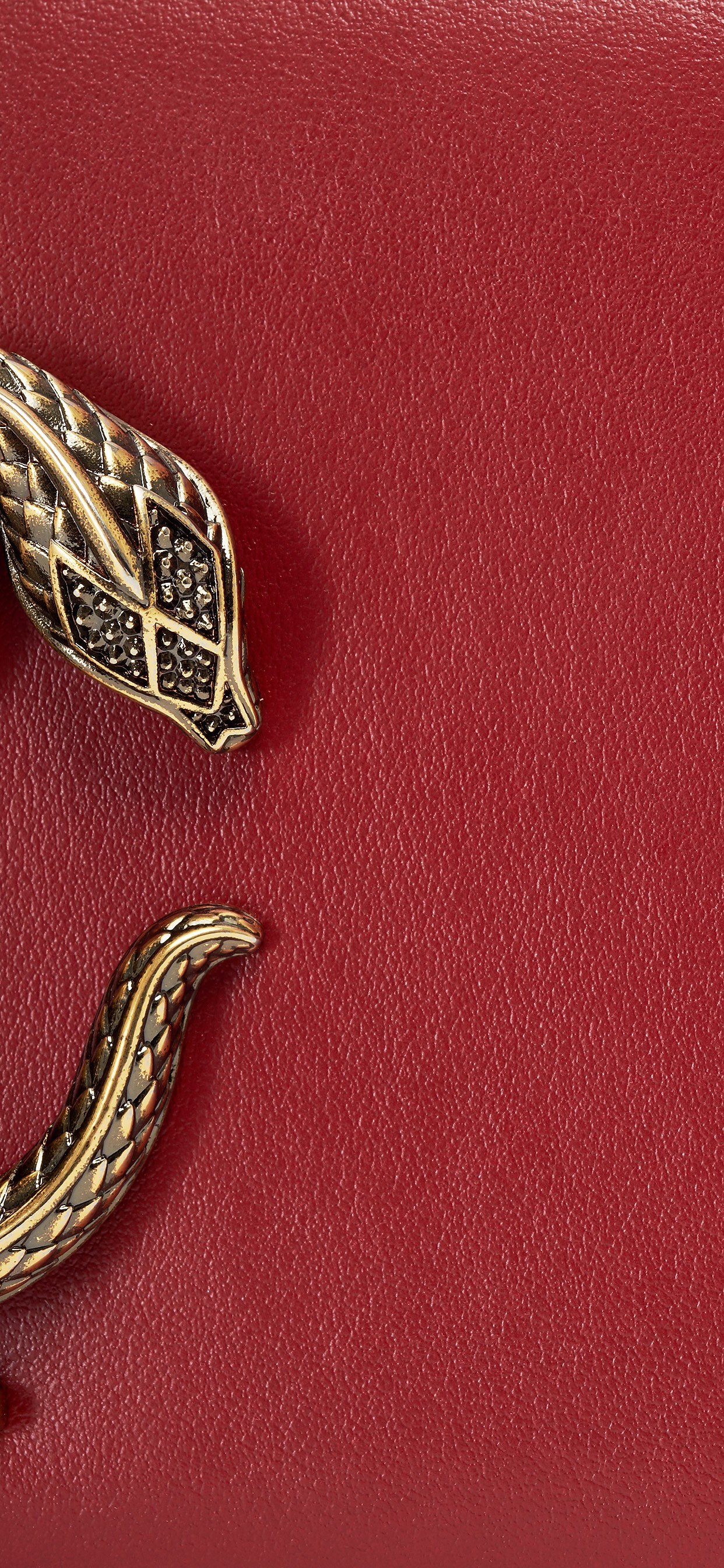「蛇」是 Roberto Cavalli 的标志元素之一,最直白的表达便是创始人亲自设计的「镜面蛇」(Mirror Snake)标识,以两条对称交织的镜面蛇呈现双C字母,蜿蜒缠绕在字母R上,象征性感、魅惑与智慧。复古铜色镜面蛇装饰扣是这只包包的灵魂元素,精致雕刻工艺呈现蛇鳞、蛇脊、蛇信、眼睛等细节,做旧和抛光处理凸显层次和立体感,散发复古哥特气质。