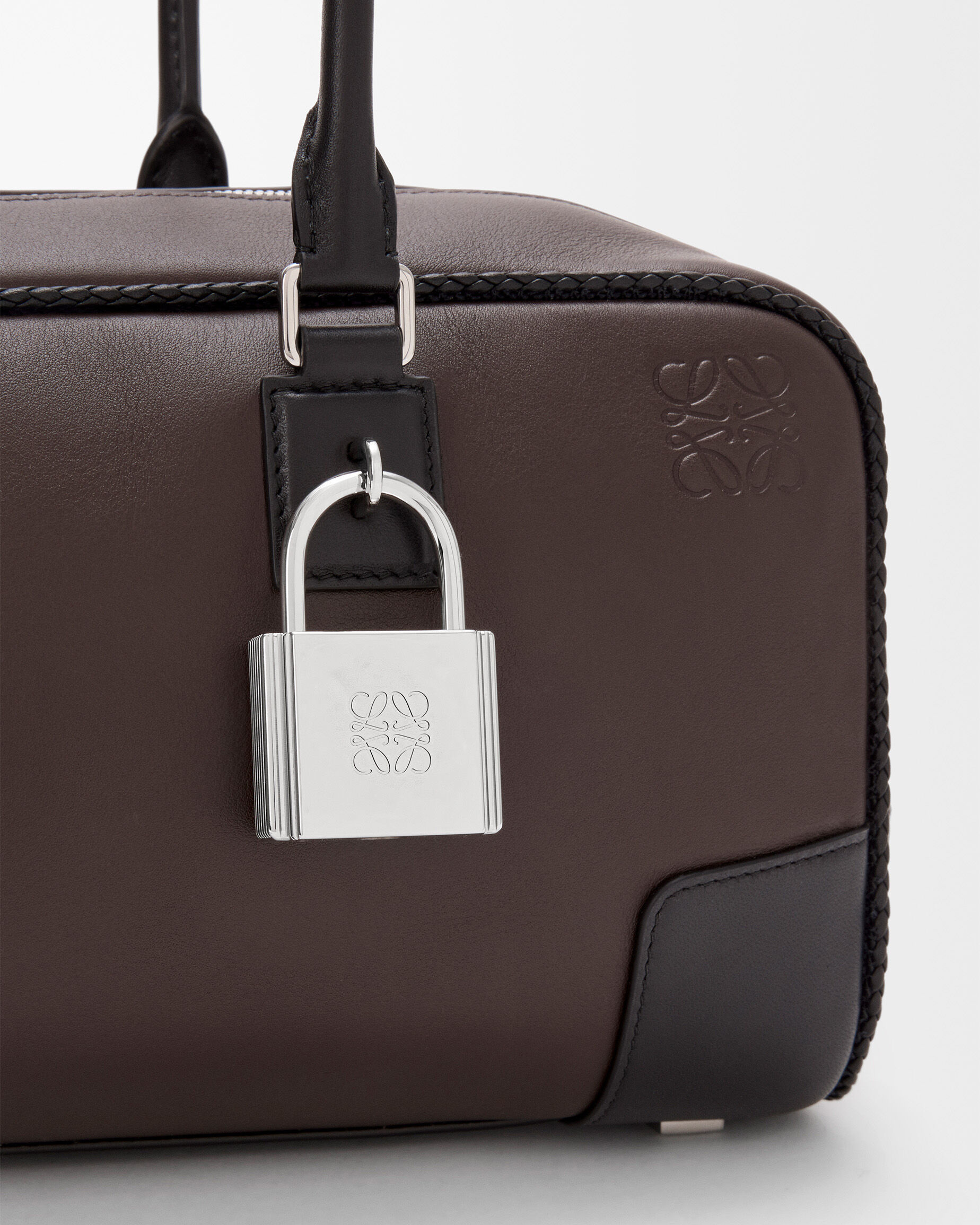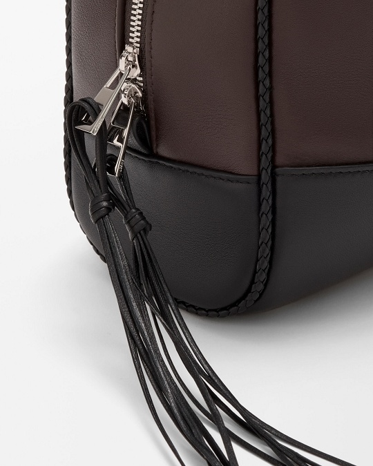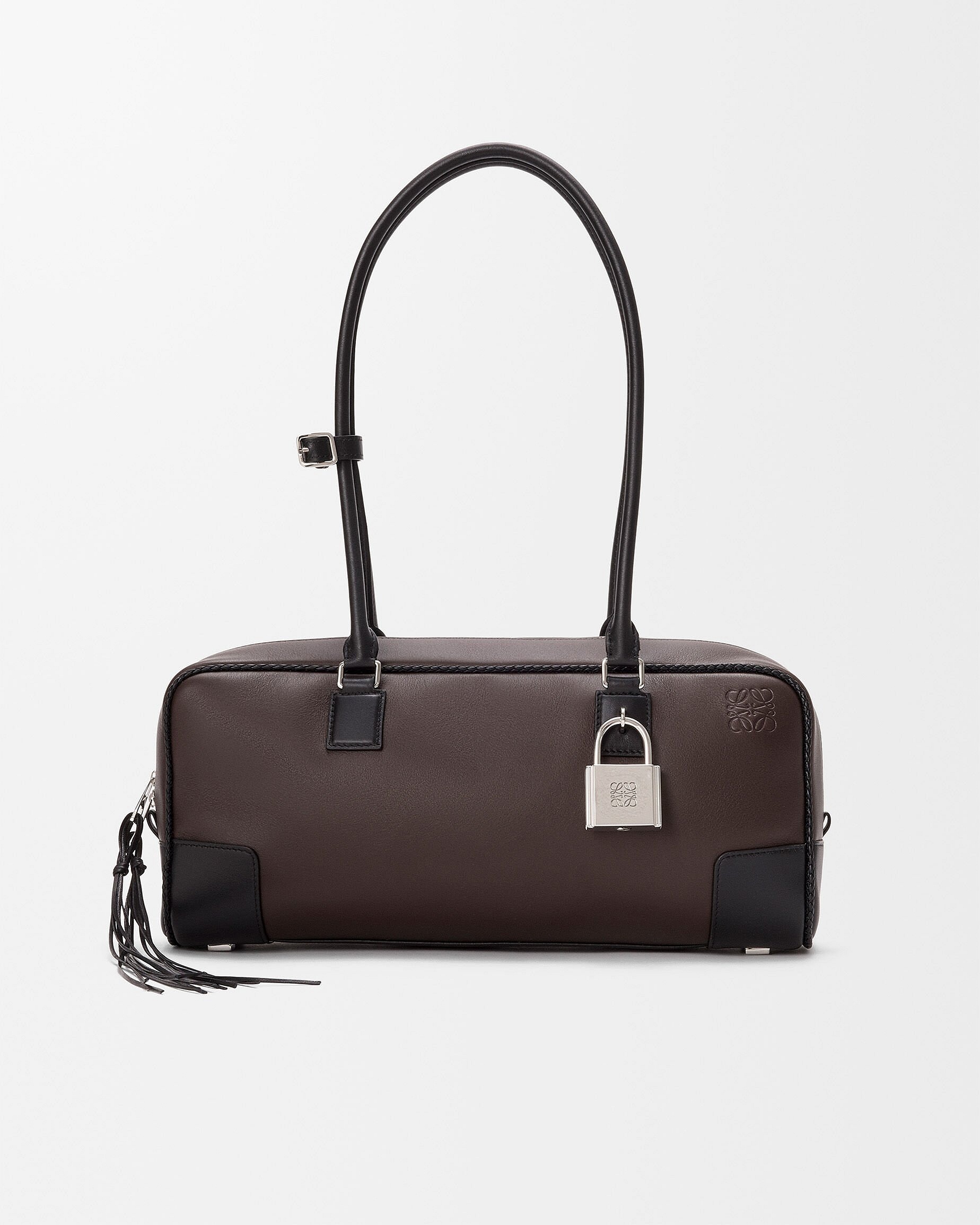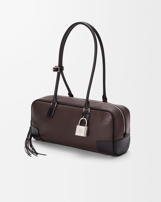 Amazona 31 Cropped 手袋采用深栗棕色/黑色双色牛皮革演绎经典保龄球包型,最大亮点是纤长的皮革流苏拉链头和编织绲边设计,为包包准入精致手工艺细节。长提手可手拎或者肩背携带,银色挂锁作为点睛。