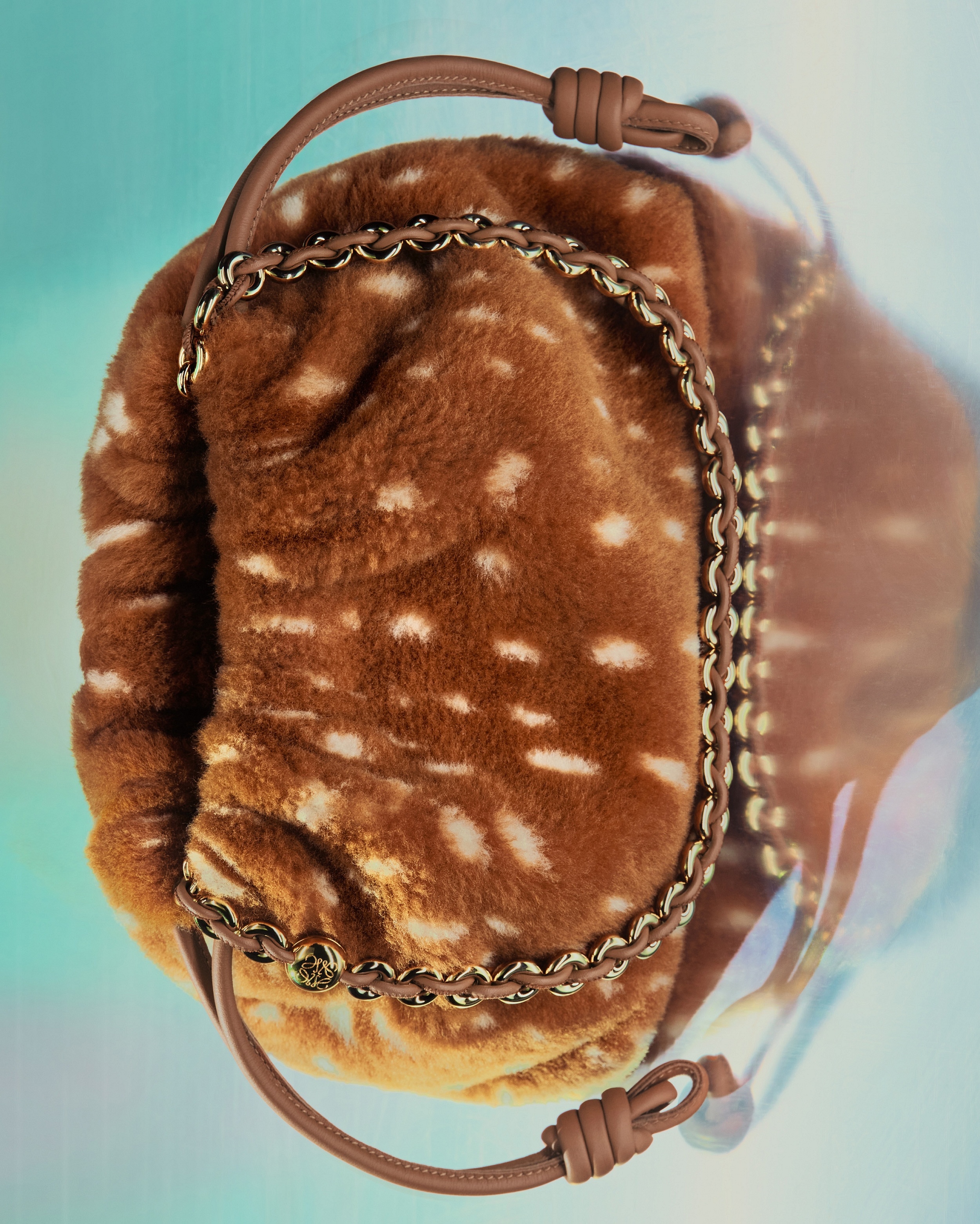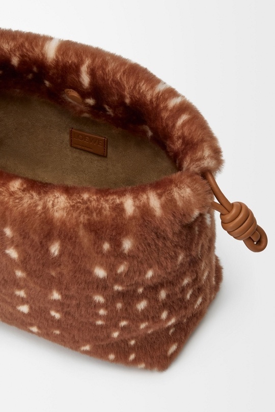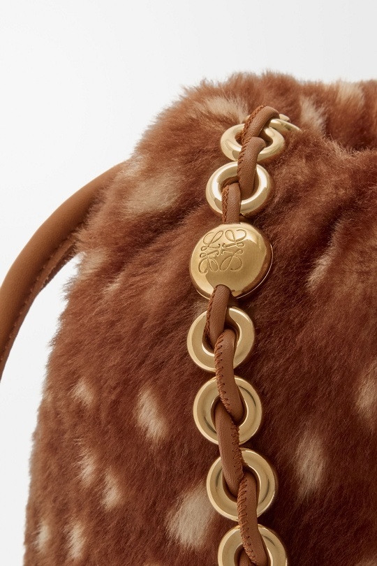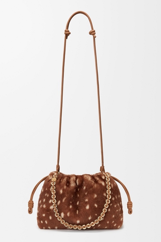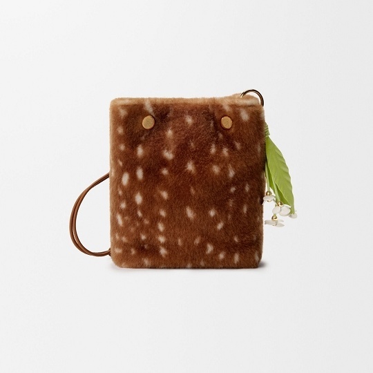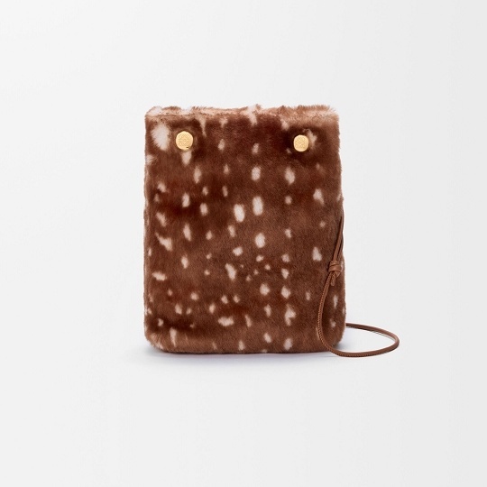 Flamenco Purse 中号手拿包和 Pebble Pouch 手袋穿上暖融融的鹿纹剪羊毛大衣,呼应动画短片中的小鹿形象。毛绒绒的触感搭配金色甜甜圈链条、Pebble 卵石扣饰等元素,显得温馨又灵动。中国文化中常把小鹿视为具有灵性的瑞兽,象征长寿、吉祥和富贵。