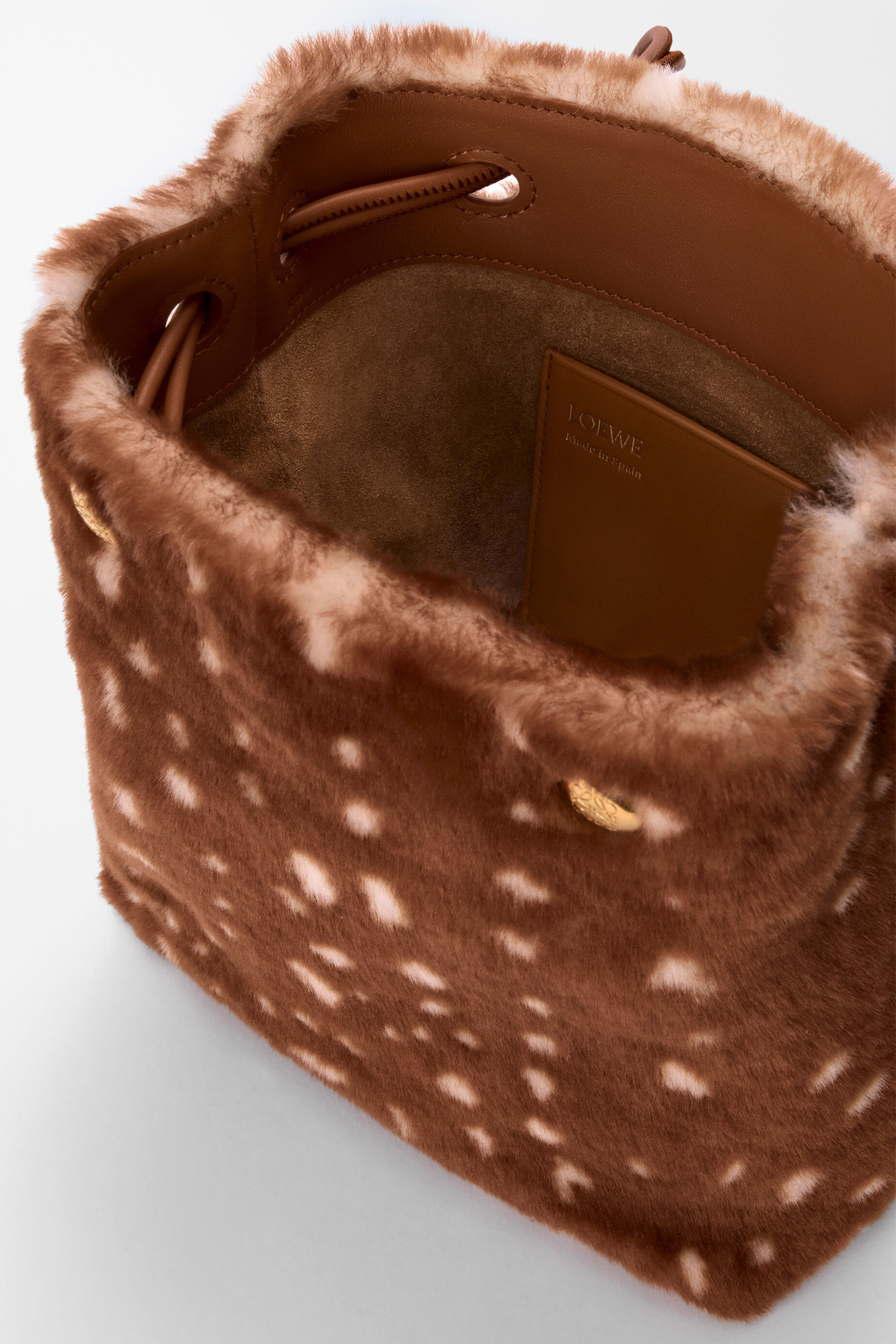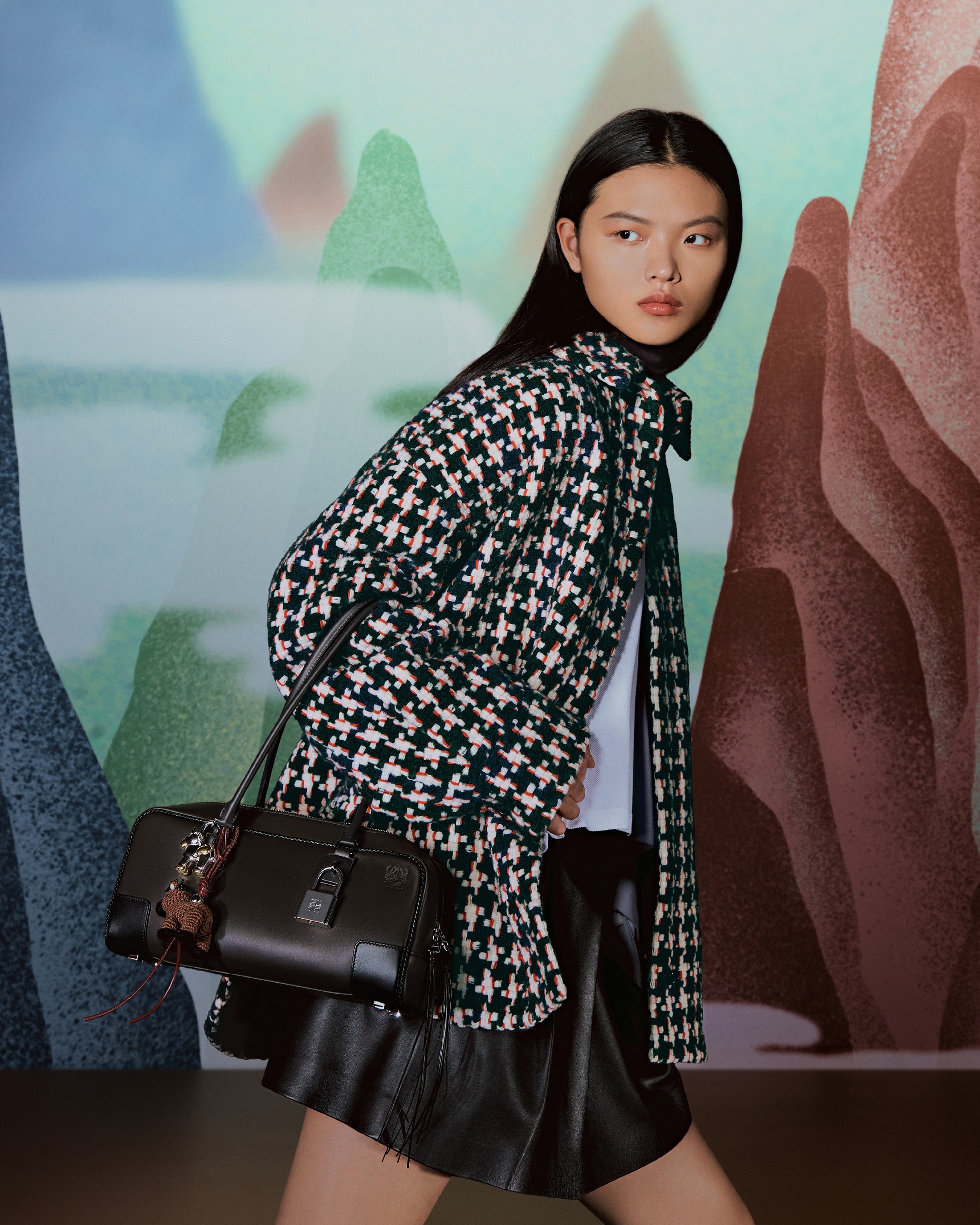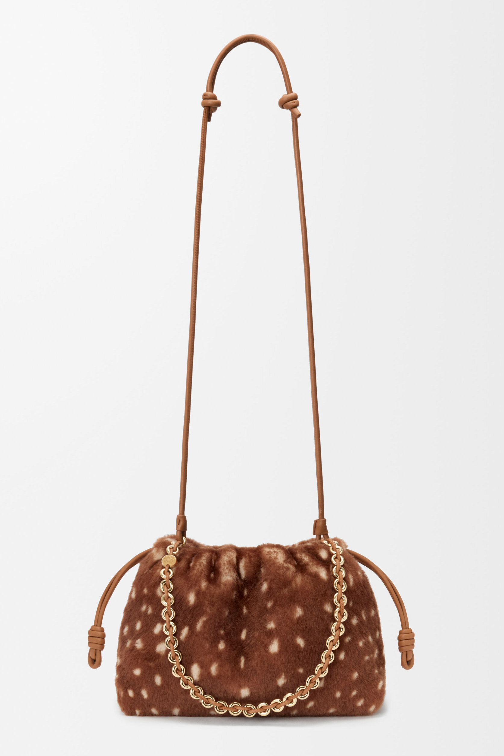 Flamenco Purse 中号手拿包和 Pebble Pouch 手袋穿上暖融融的鹿纹剪羊毛大衣,呼应动画短片中的小鹿形象。毛绒绒的触感搭配金色甜甜圈链条、Pebble 卵石扣饰等元素,显得温馨又灵动。中国文化中常把小鹿视为具有灵性的瑞兽,象征长寿、吉祥和富贵。