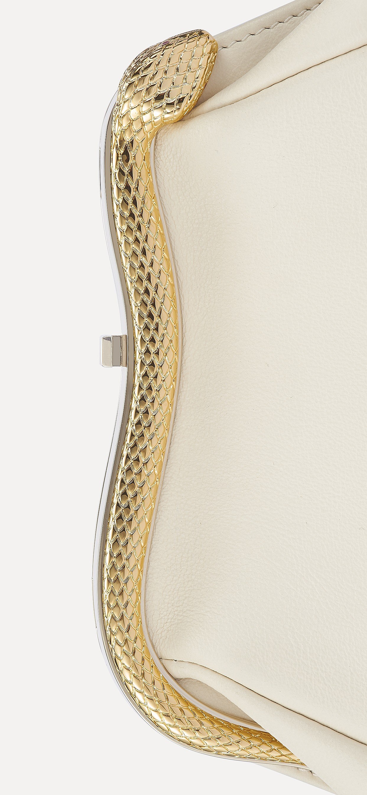 Serpentine 手拿包以灵蛇的曼妙灵动之姿为灵感,延续 BVLGARI 精湛的珠宝工艺——黄铜倒模塑造出蜿蜒的蛇形,金雕细腻的菱格纹再现蛇鳞,抛光处理营造出闪耀流动的光影,手工填绘红色珐琅双眼更添魅惑气息。