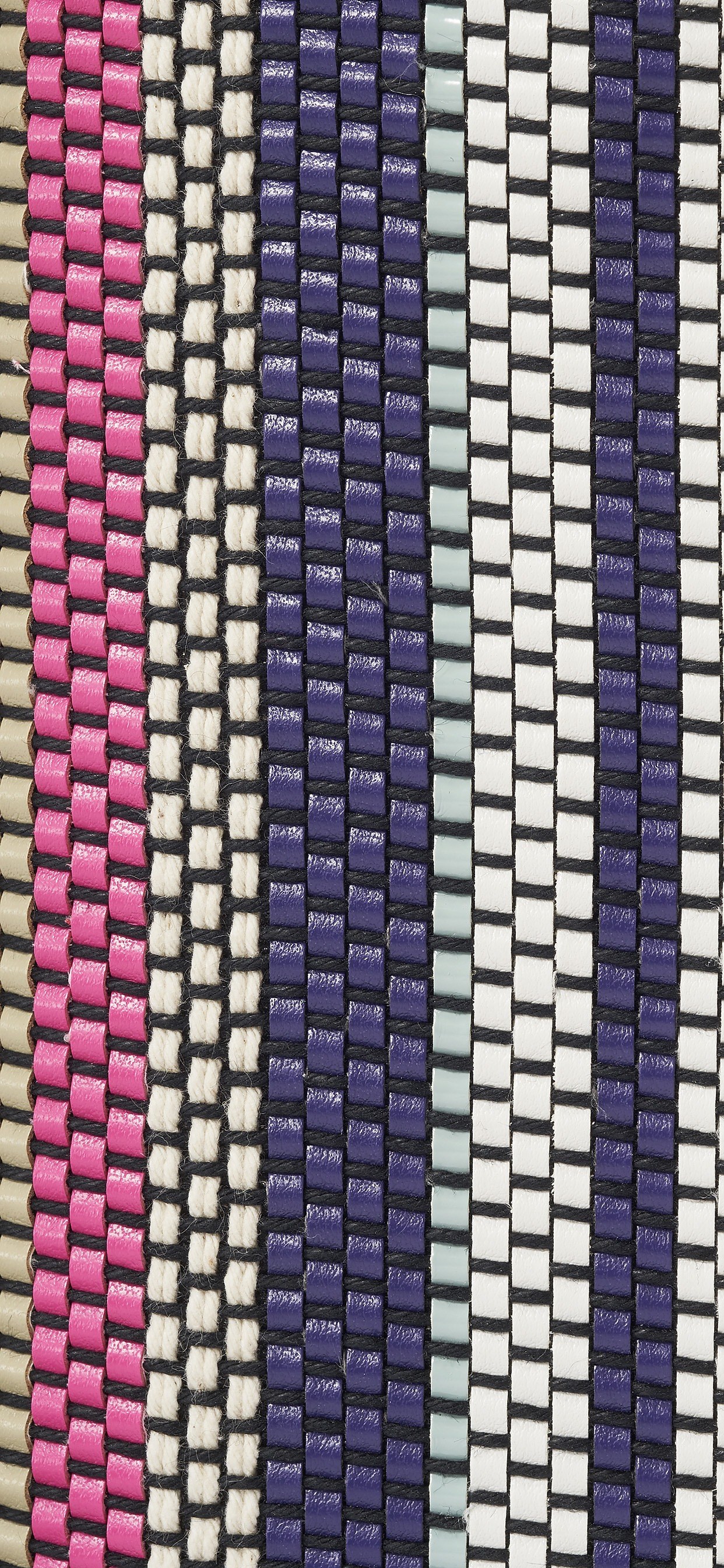 这只 Barcelona 手袋的翻盖使用白色、米色、粉色、天蓝、蓝紫色等彩色小牛皮条与棉线混编而成,色调丰富又自然和谐,配色非常小清新。