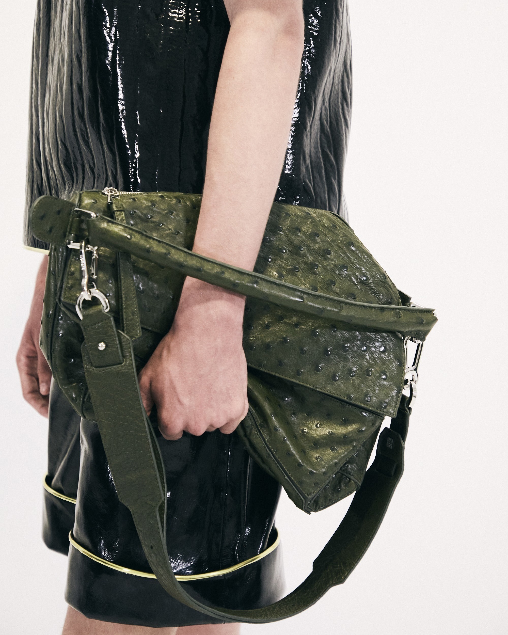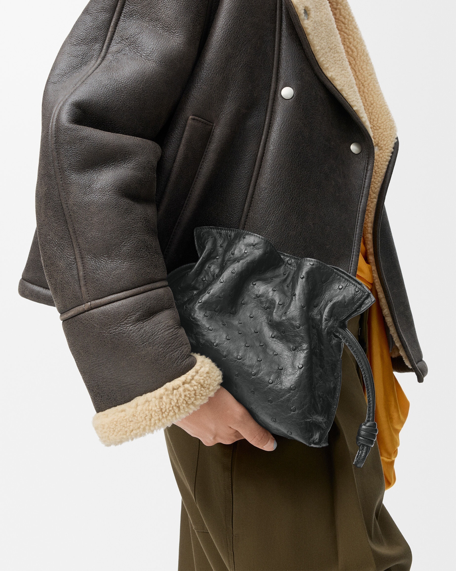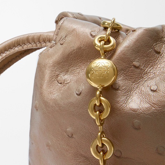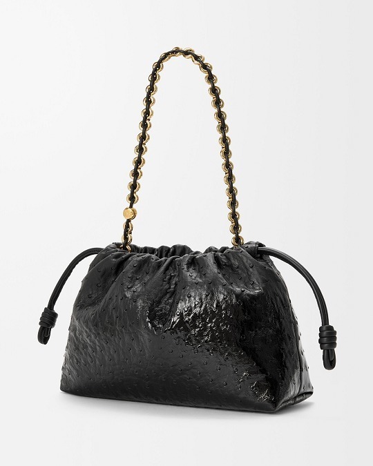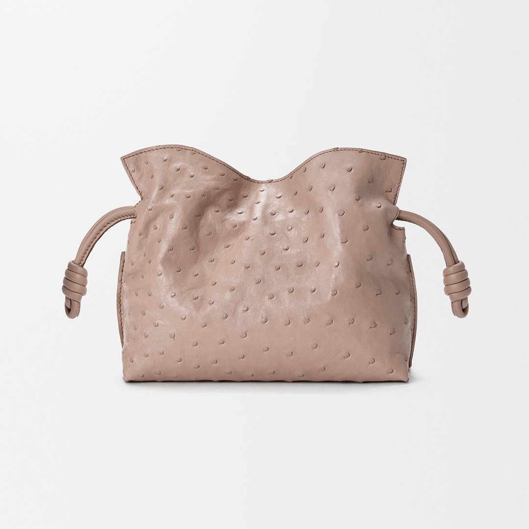 另一组采用鸵鸟皮演绎的是 Flamenco 手袋,柔韧轻盈的皮质塑造出慵懒的云朵廓形,搭配抽绳束口和盘绕结装饰。包包的设计灵感来自西班牙传统弗拉门戈舞(Flamenco),自然抽褶的廓形犹如舞者的浪漫裙摆。
